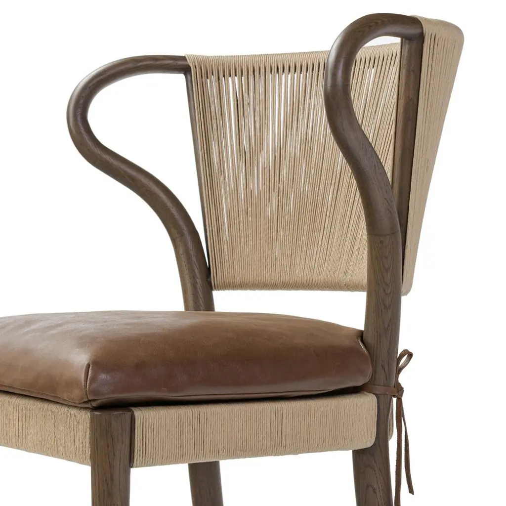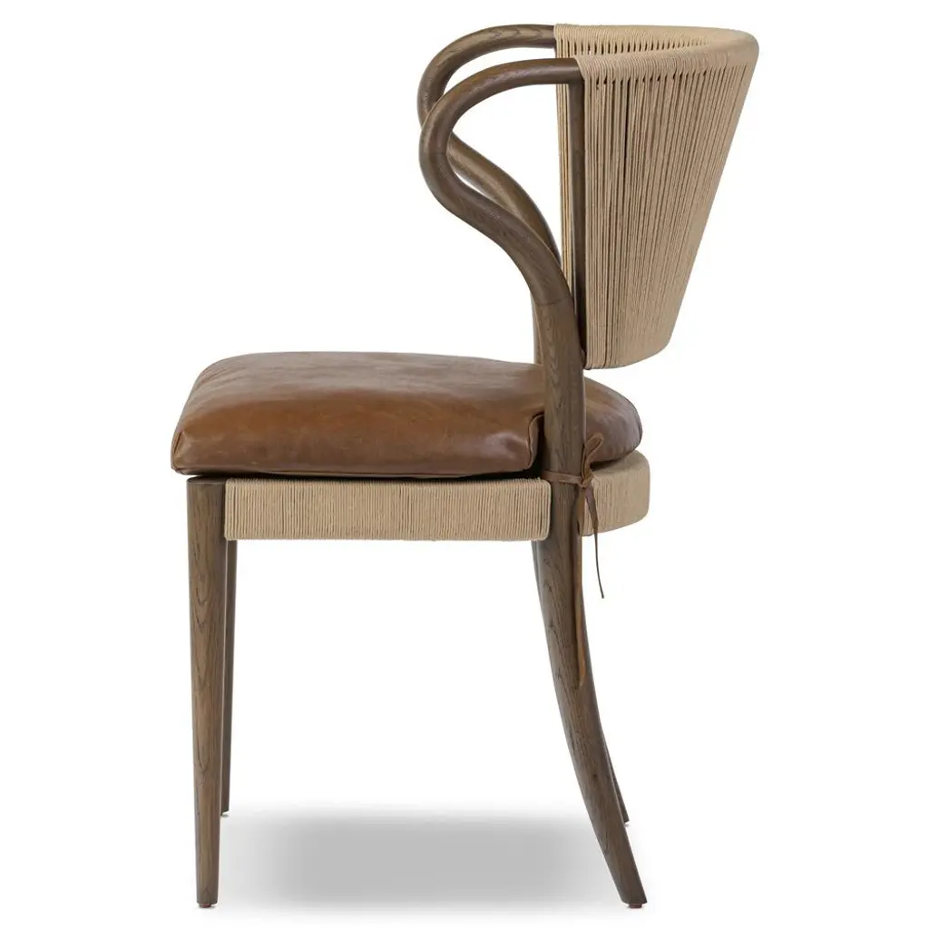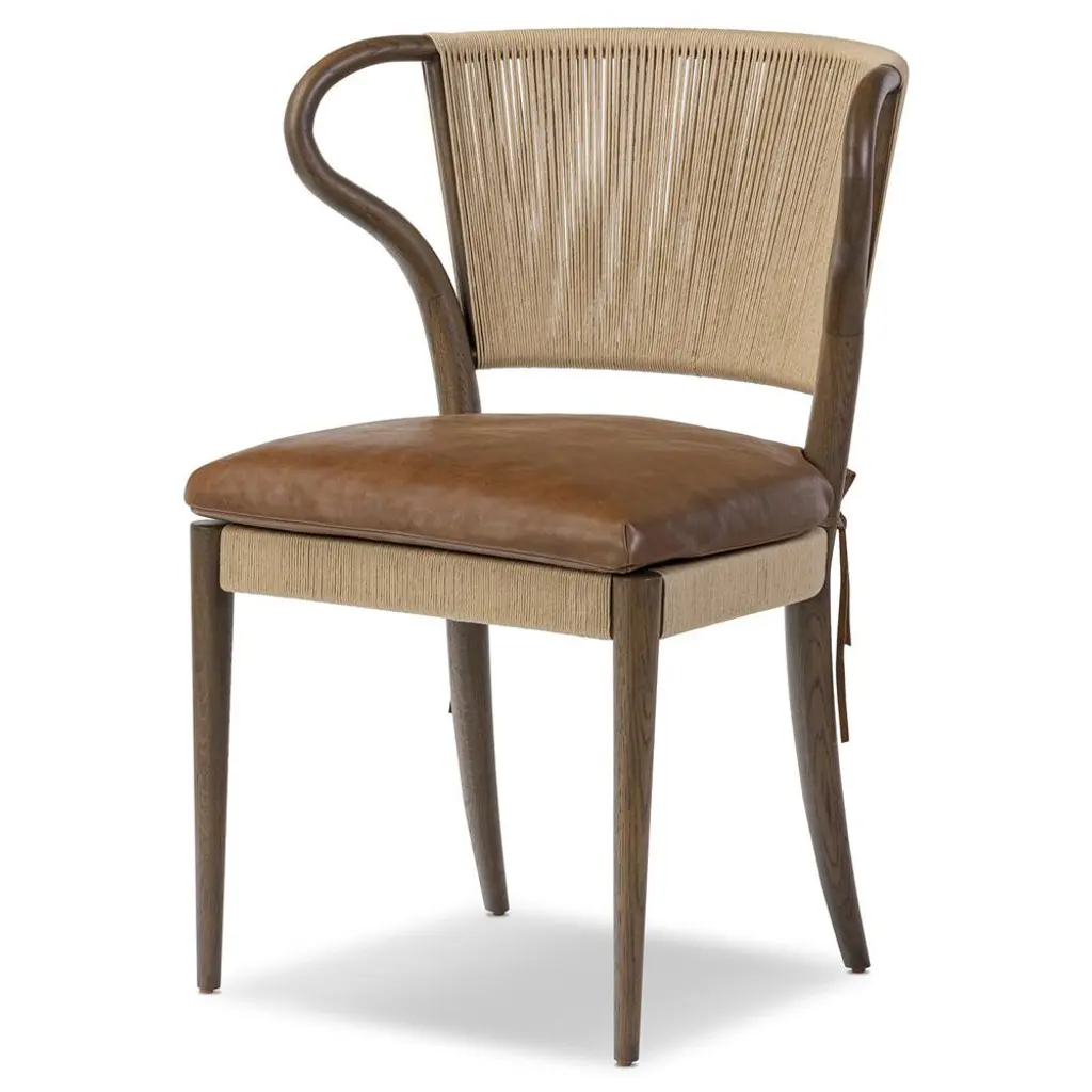 A design collaboration by Amber Lewis and Four Hands.Our Amira Dulane Mahogany Leather Armless Dining Chair offers a subtle take on the traditional wingback style. This armless dining chair features organic shaping in its rich oak framing. Complemented by a natural rush back and seat, with a tie-back mahogany leather cushion for comfort.