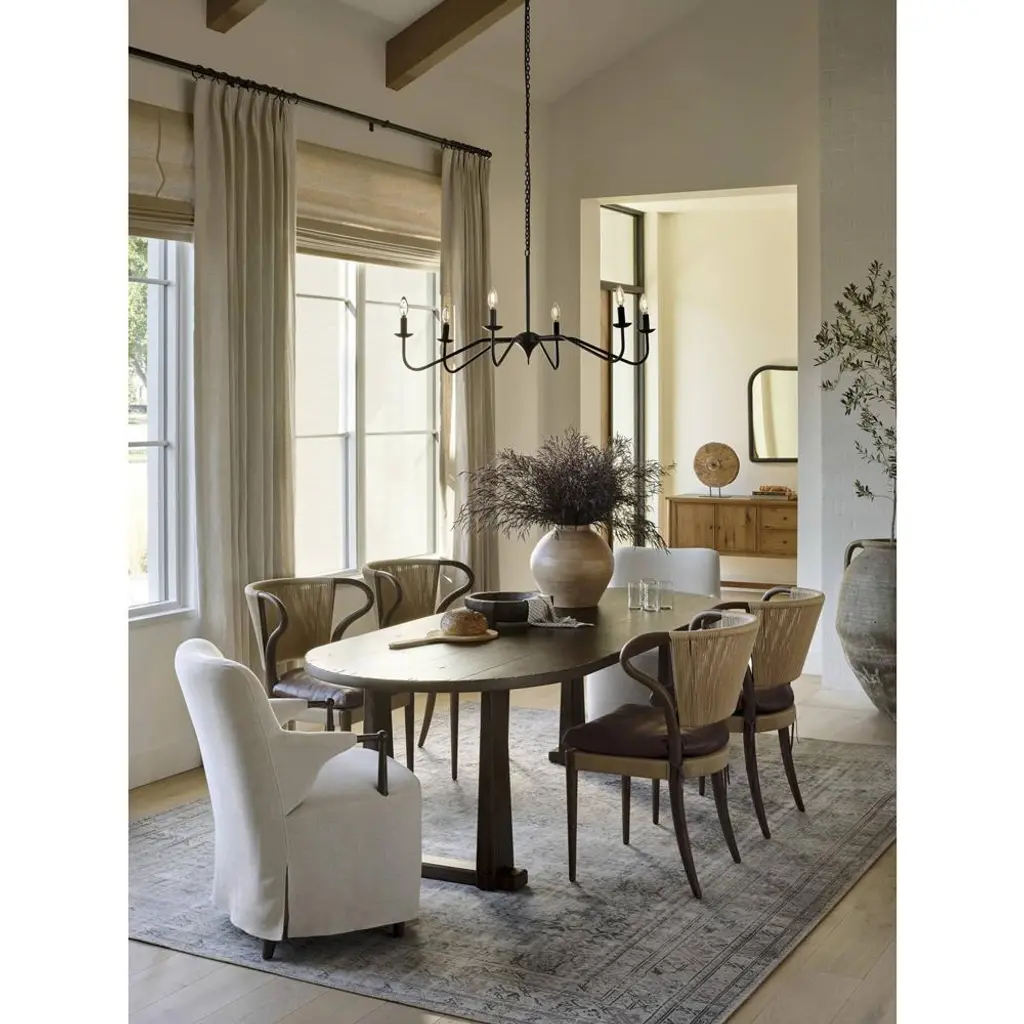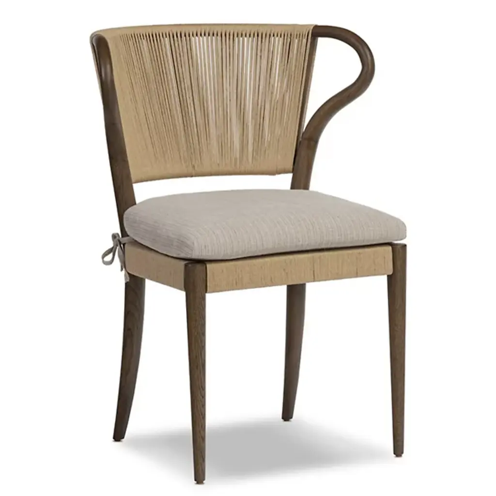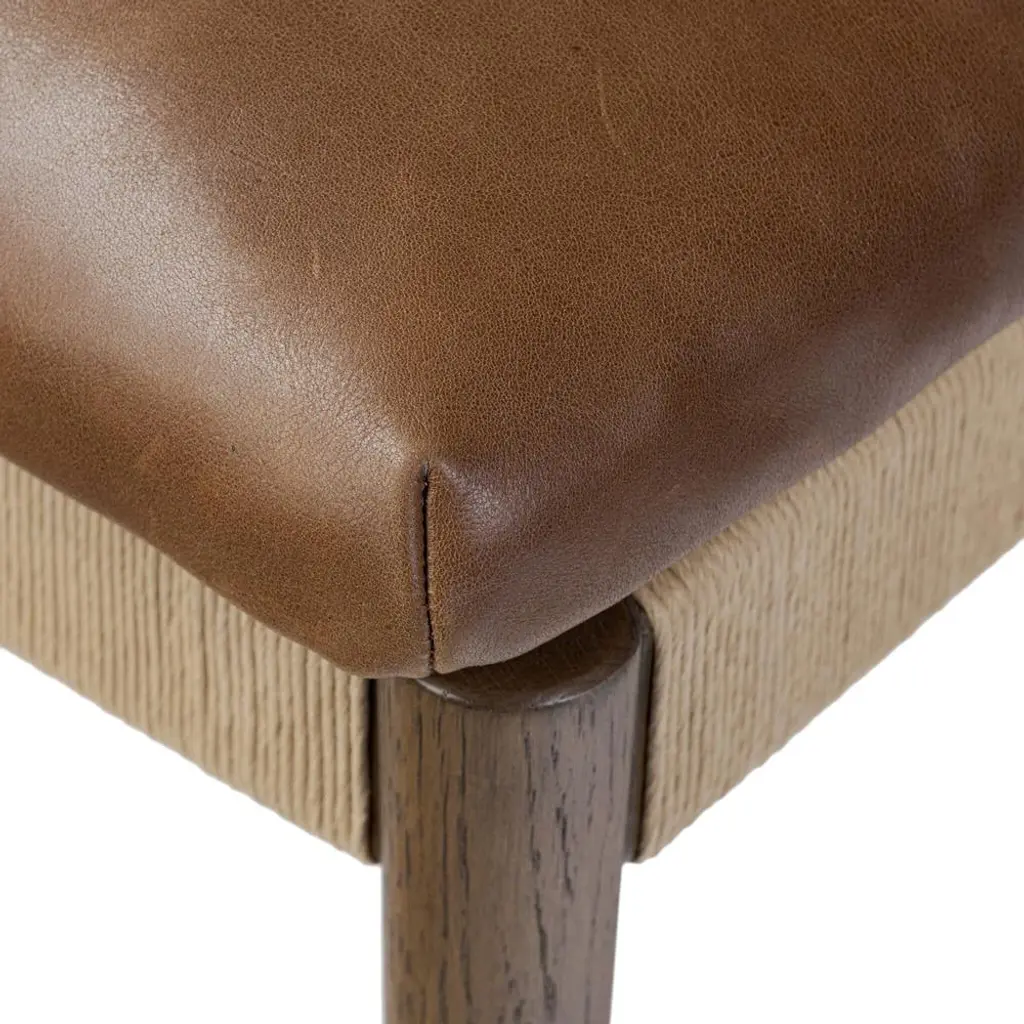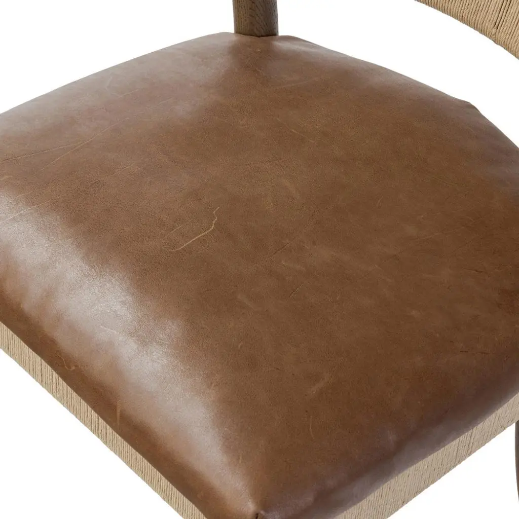 A design collaboration by Amber Lewis and Four Hands.Our Amira Dulane Mahogany Leather Armless Dining Chair offers a subtle take on the traditional wingback style. This armless dining chair features organic shaping in its rich oak framing. Complemented by a natural rush back and seat, with a tie-back mahogany leather cushion for comfort.