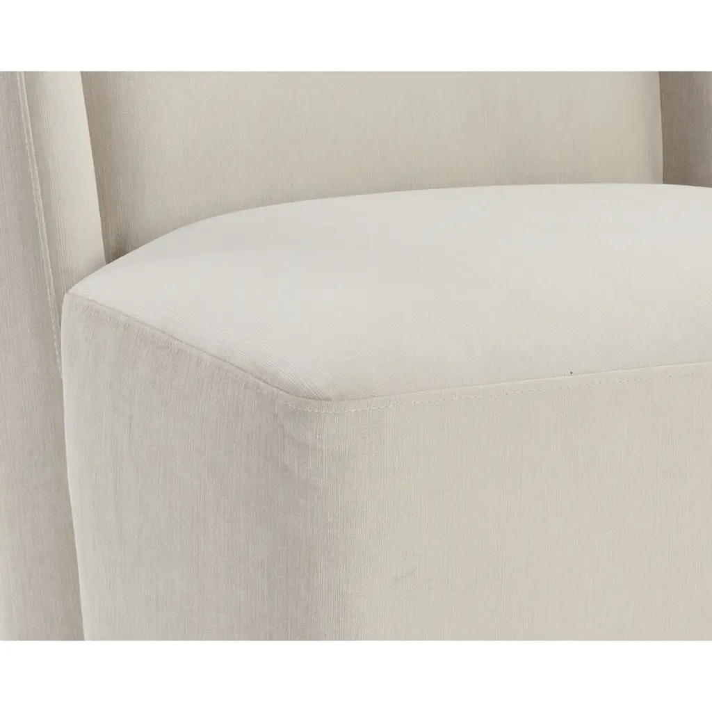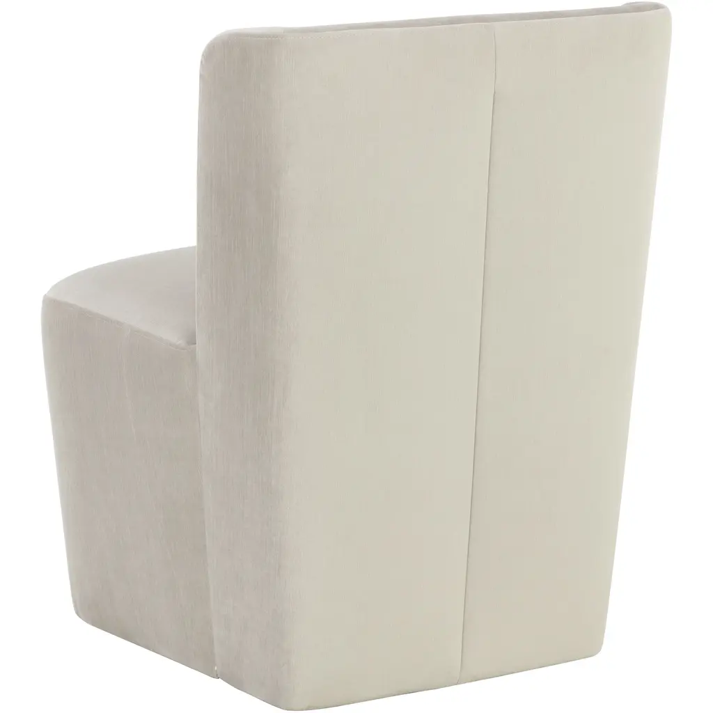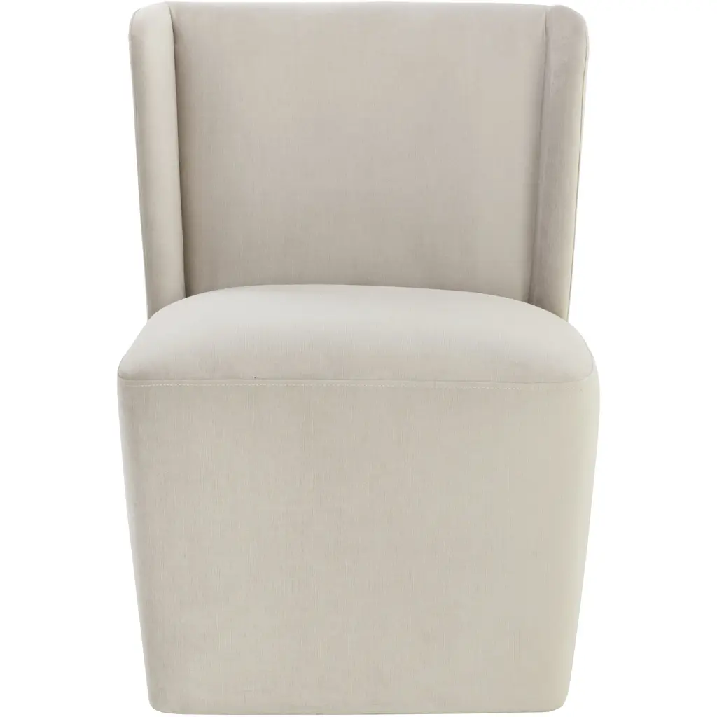 Soft curves define the classic silhouette of the Amita Wheeled Dining Chair. Fully upholstered in our piccolo prosecco performance fabric for soft comfortable seating. Performance fabric is moisture repellent, durable and easy to clean.
