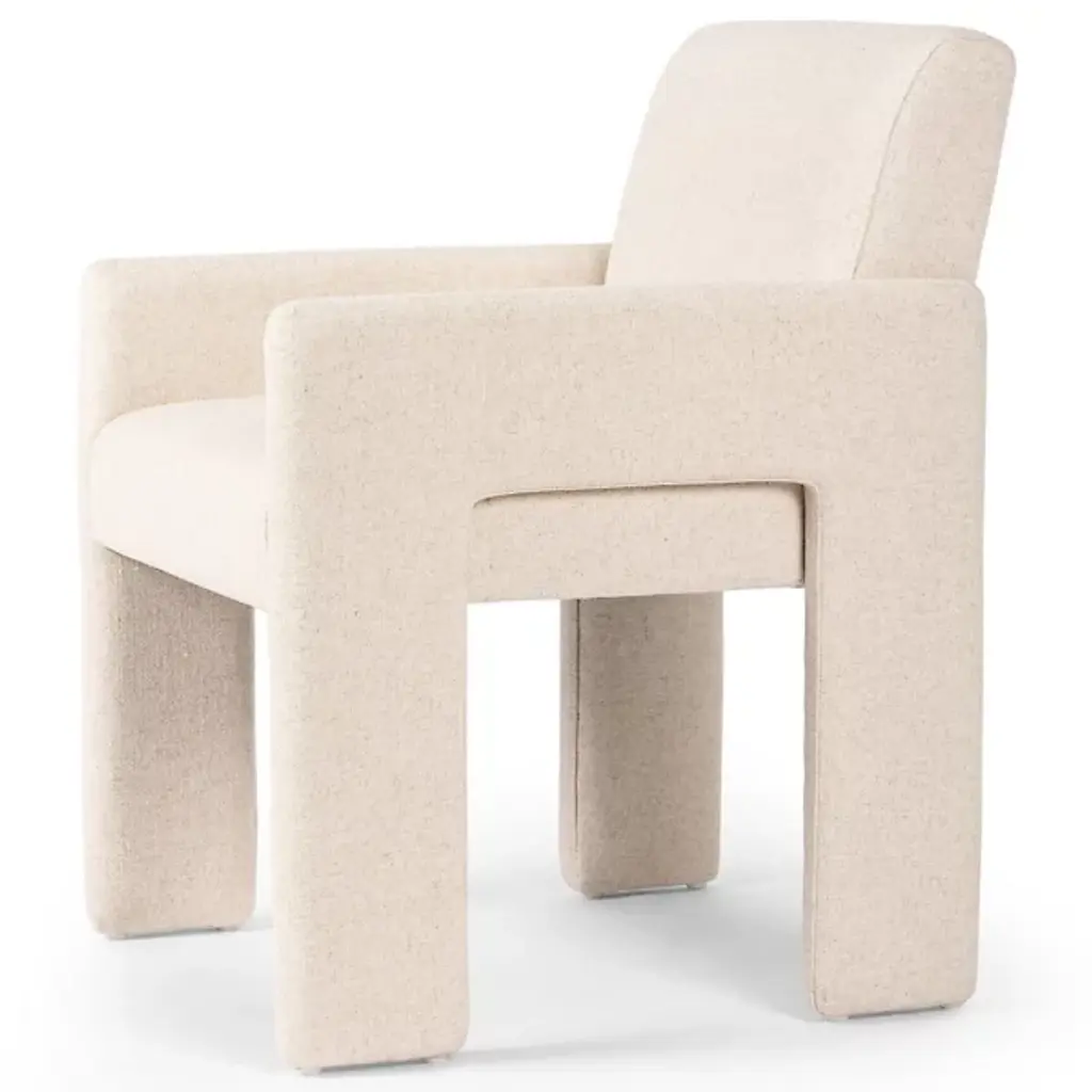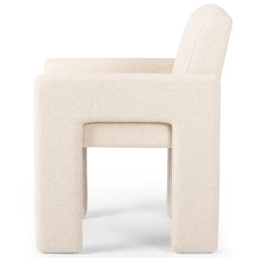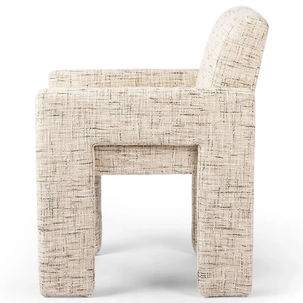 Step up your dining game with the Amur Dining Armchair from Four Hands. Amur has a boxy design with an angular silhouette. Its rectangular cutouts add stylistic flair, making it visually intriguing. Fully upholstered in high-quality fabric and generously padded with polyurethane foam, this dining armchair offers style and comfort for everyday dining experiences. With its blend of mid-century modern and contemporary styles, the ensemble effortlessly merges retro charm with elegance.