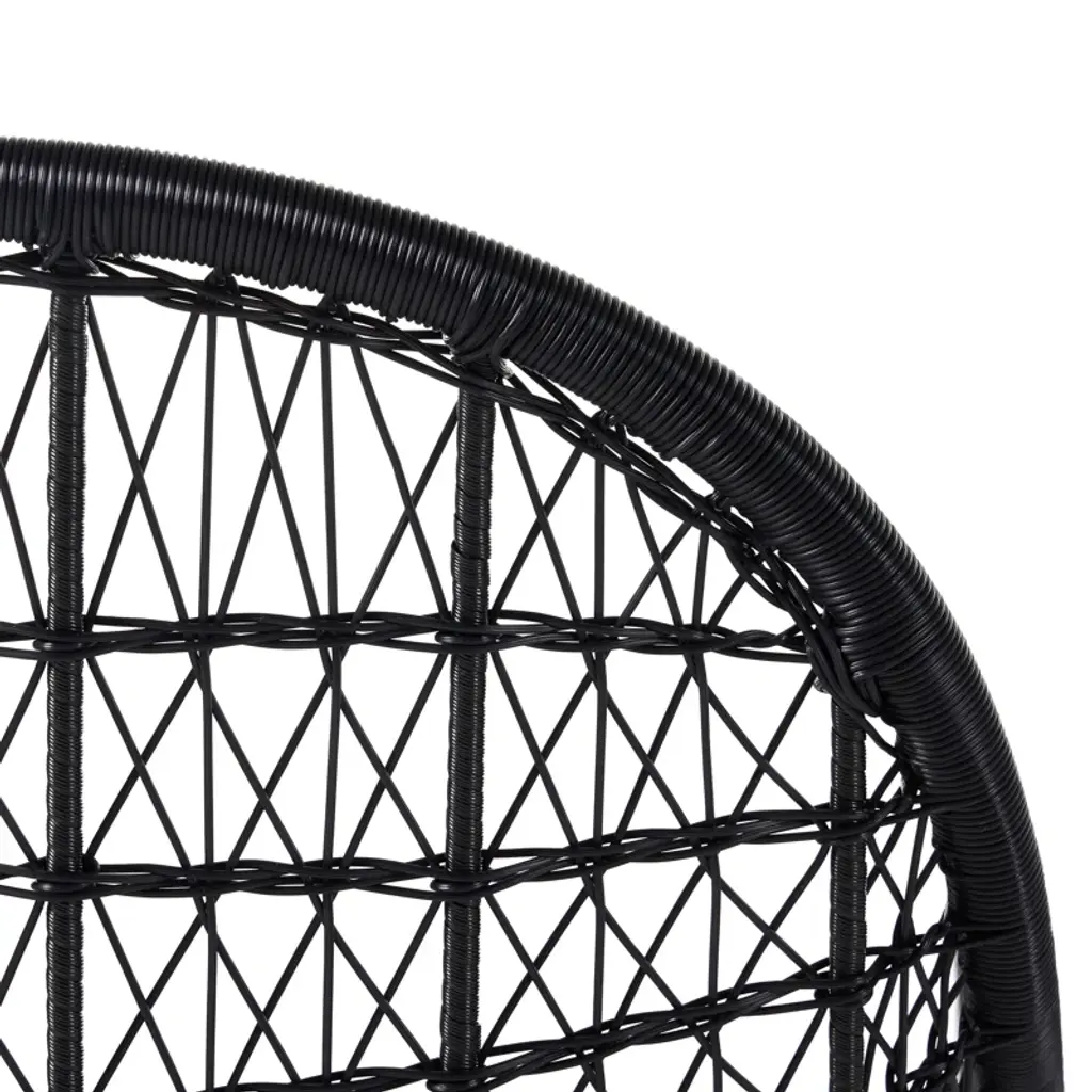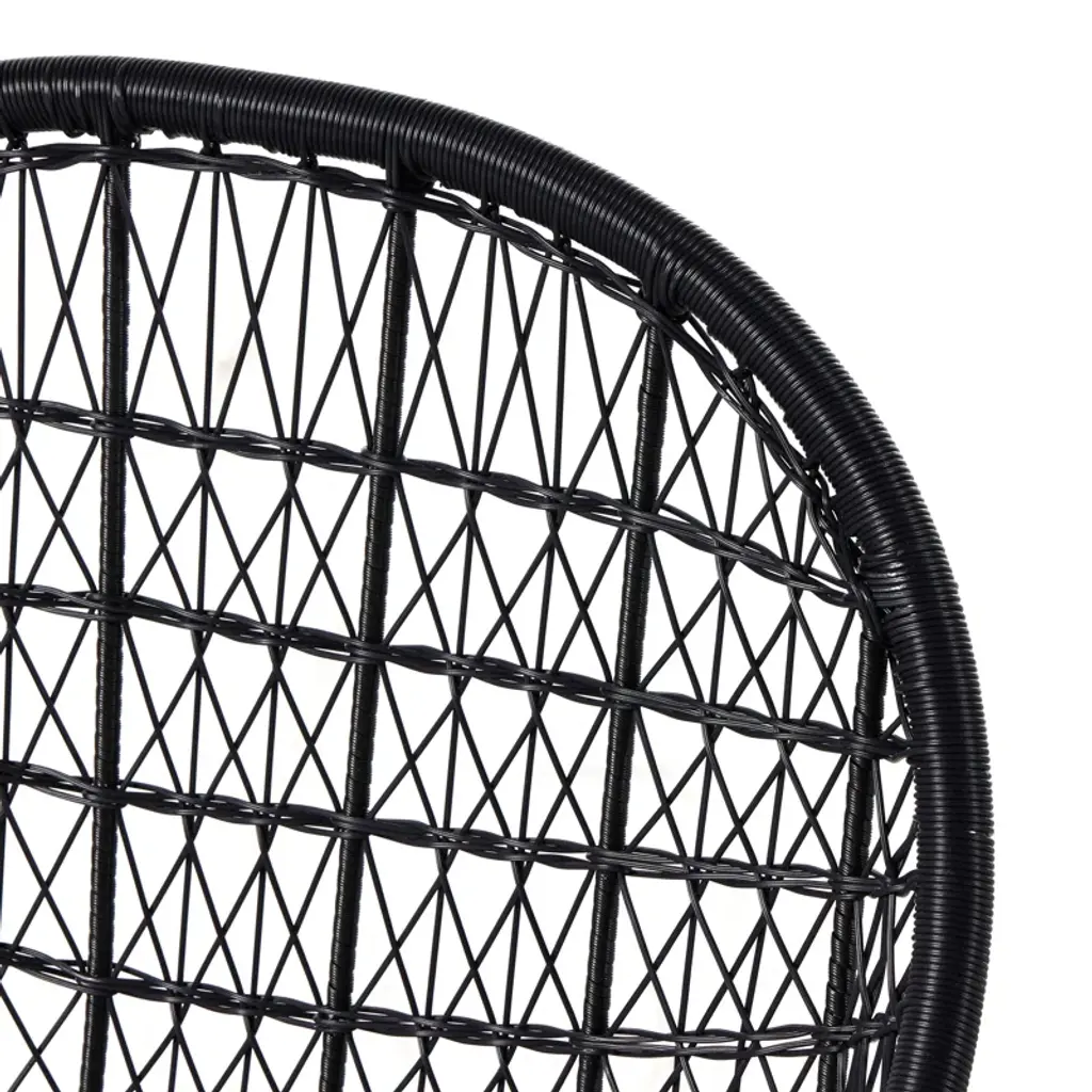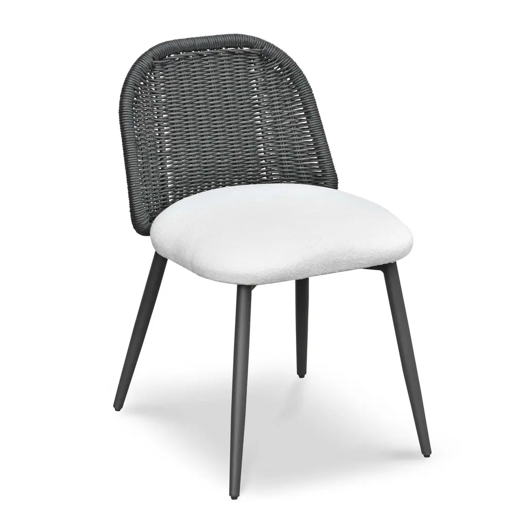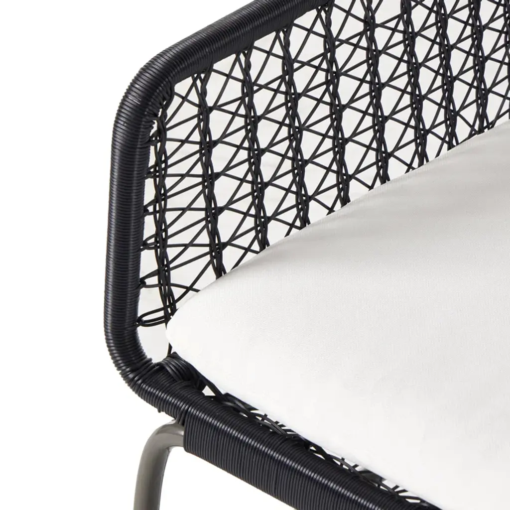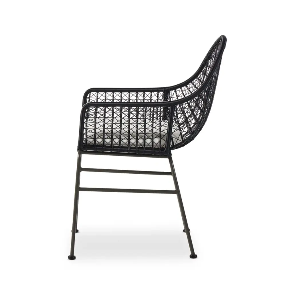 Clean, contemporary shaping and an updated weave transform all-weather wicker into something modern. This high-texture dining chair is supported by a contrasting bronzed iron base, with a white seat cushion for comfort. Cover or store indoors during inclement weather and when not in use.
