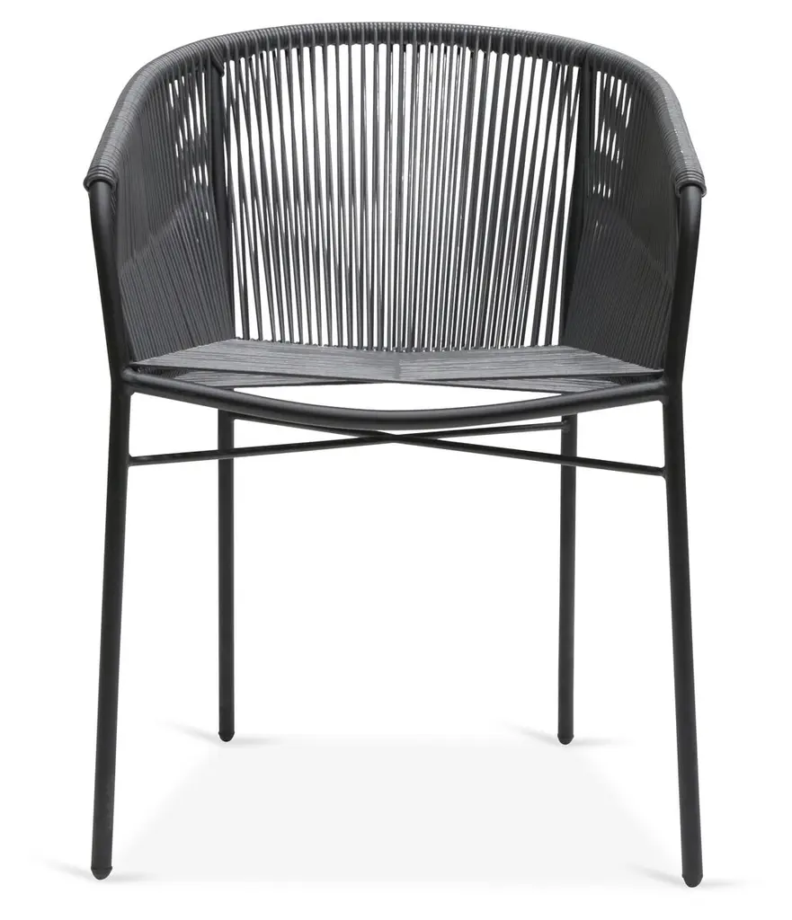 Handcrafted by skilled artisans and certified welders in Mexico, this modern dining chair is crafted of woven, UV-protected PVC cord with a high-contrast, powder-coated steel frame. While it's designed for use on the porch or patio, a sleek silhouette and impressive durability also make it a great choice for an indoor sunroom or even a playroom.