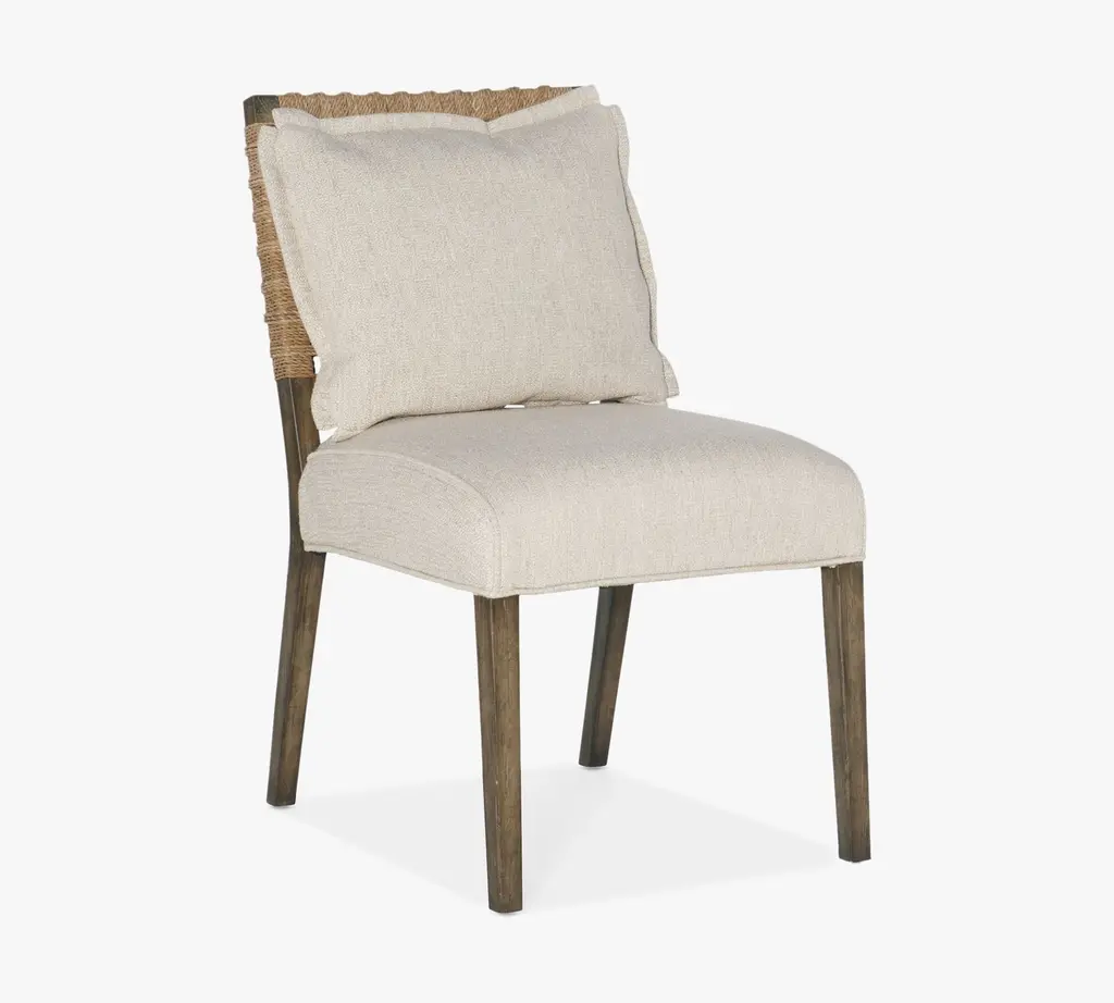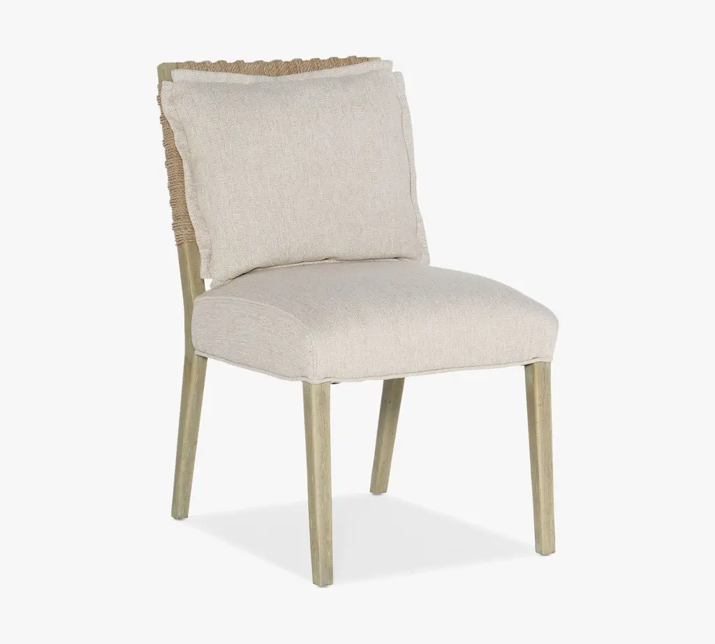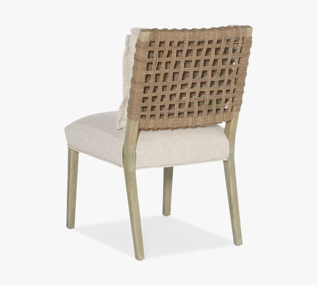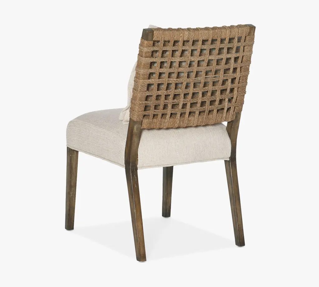 Inspired by the iconic Malibu landscape, this side chair brings relaxed California sophistication to your living space. Crafted of wood with a natural finish, the angular frame features a woven rope back for rich texture and an intriguing material mix. The padded seat and loose pillow back are upholstered in performance fabric for carefree comfort that lends a tailored finishing touch. Pairs easily with other pieces in the collection for a cohesive look.