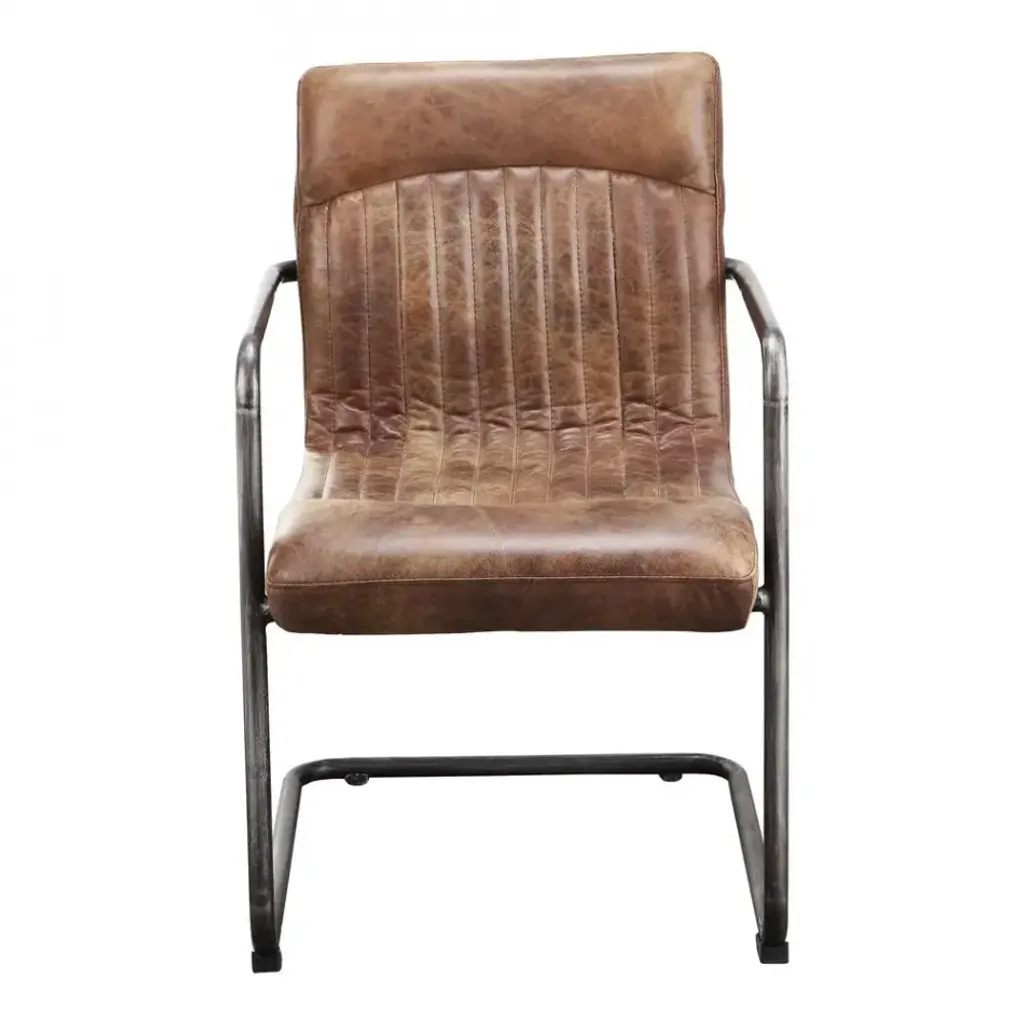 The Ansel dining chair features an industrial iron frame and easy-to-clean distressed top grain leather upholstery. The perfect chair for adding some originality and industrial design to your home. Outfit your entire table with this simple yet stunning design. Available with arms or without as a dining chair.