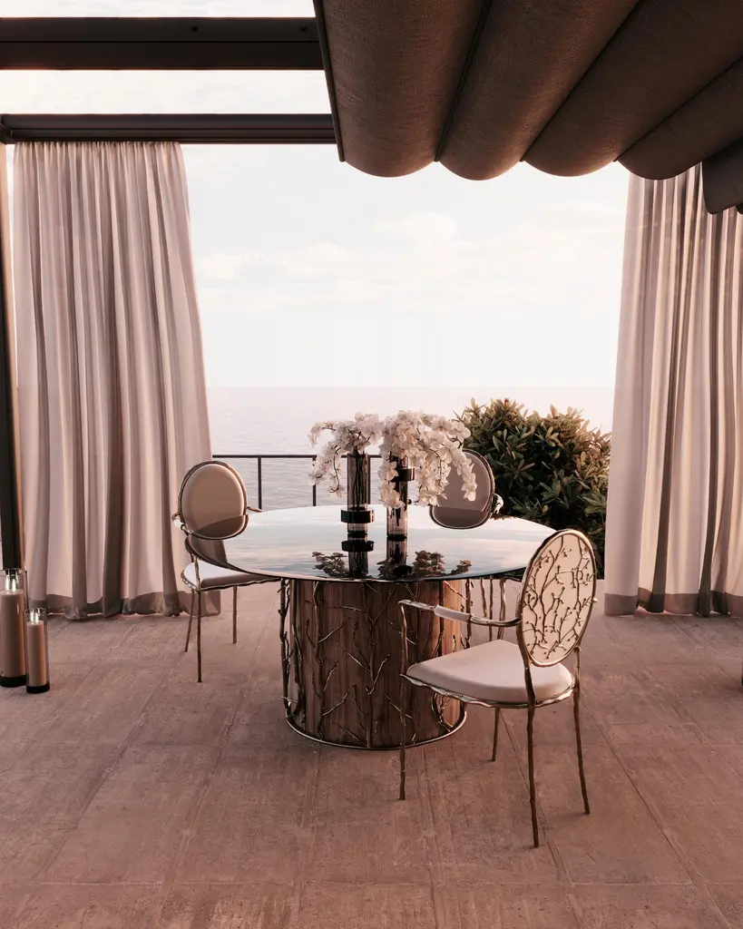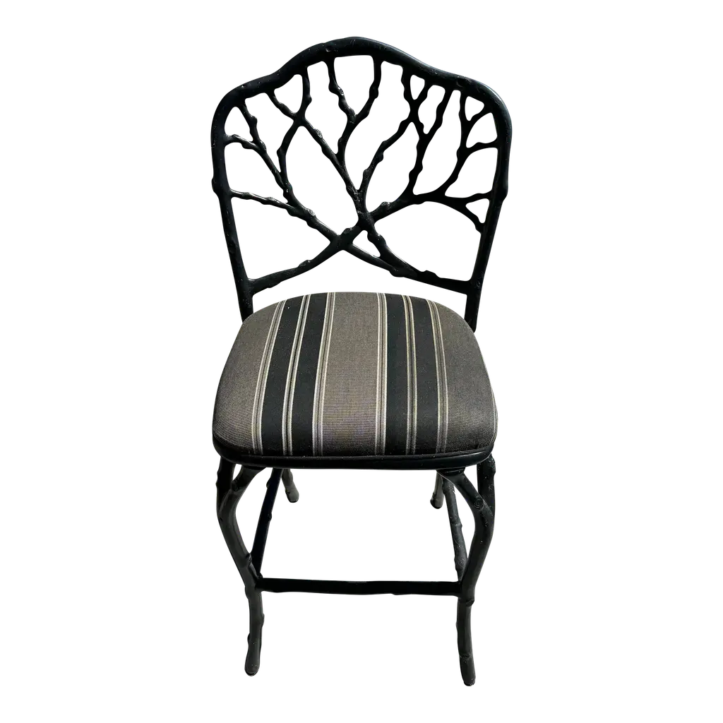 Our artisans have masterfully captured the alluring essence of an enchanted forest with this bar stool.Its antique gilded branch like structure can't help but mesmerize the beholder. Her fully upholstered body pops as the backdrop to the glinting, whimsical branch frame.Materials & Finishes:Upholstery: Paris Velvet Cream from the KOKET Textiles collectionStructure: Aged Brass (High Gloss Finish)Clean & Care: Care for textiles by vacuuming or lightly brushing. Maintain textiles bykeeping them away from direct sunlight. Rotate and flip cushions whenvacuuming for even wear.The nap of high pile textiles such as velvets may become crushed orlose its original pile height. We recommend light steaming to lift thepile to its original height. The textile should also be brushed with ade-linting brush to maintain its pile. Water based or solvent cleaner maycause discoloration or staining. Werecommend that stained or soiledtextiles be professionally cleaned. Never use cleaners with alcohols or solvents on metals. Only use cotton or extra soft cloths. We recommend that tarnished metals be professionally cleaned. Clean polished metal or polished stainless with a damp cloth. Do not use commercial or heavy-duty polishes or waxes, as they may scratch or damage the finish. Polishes we do recommend are Brasso, Simichrome, or our favorite Flitz; these can be used without inflicting damage even for the unskilled user, unless the polished surface has a wax sealer coat. These polishes will remove the wax while polishing the metal, but the surface would then have to be re-waxed if it is on a metal that needs to be sealed.