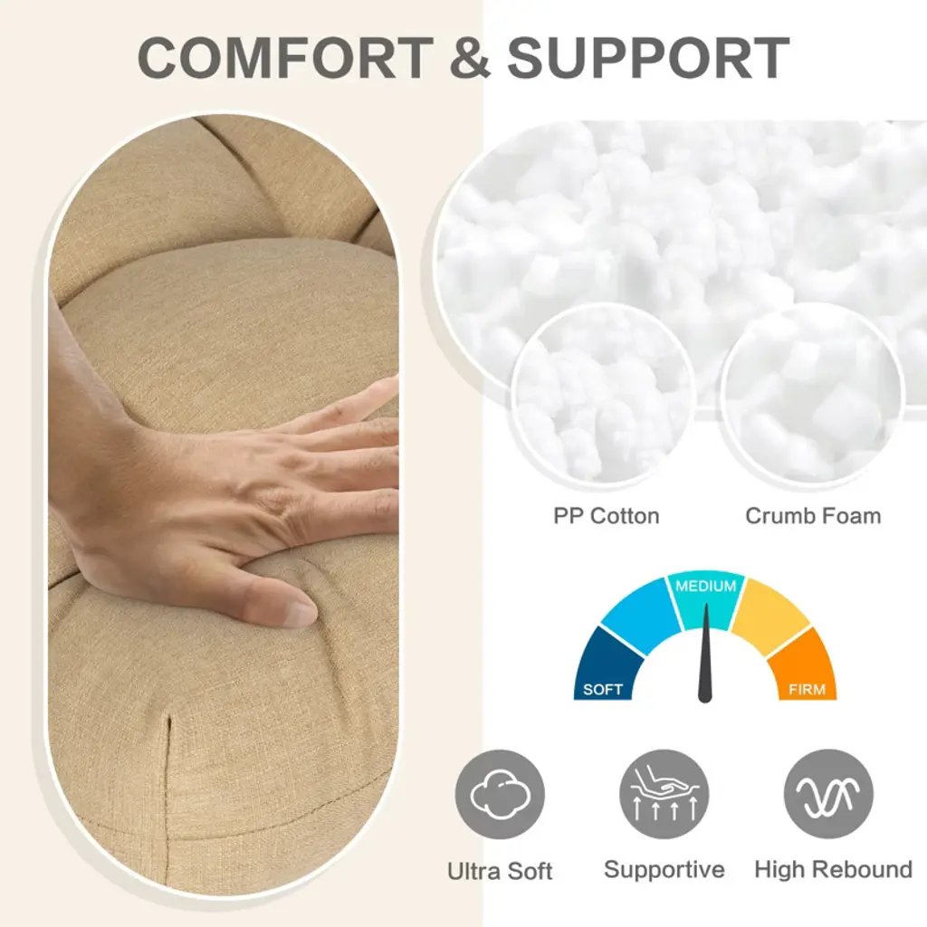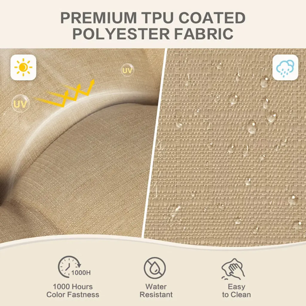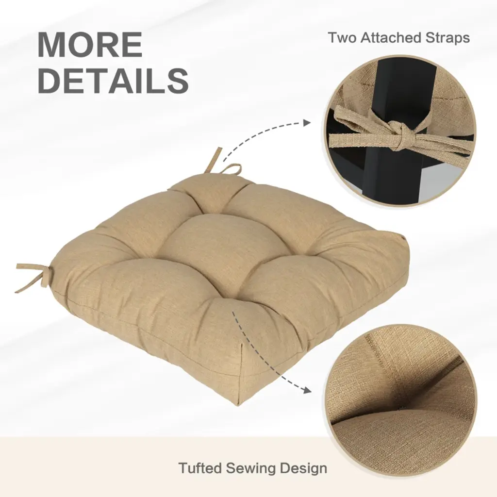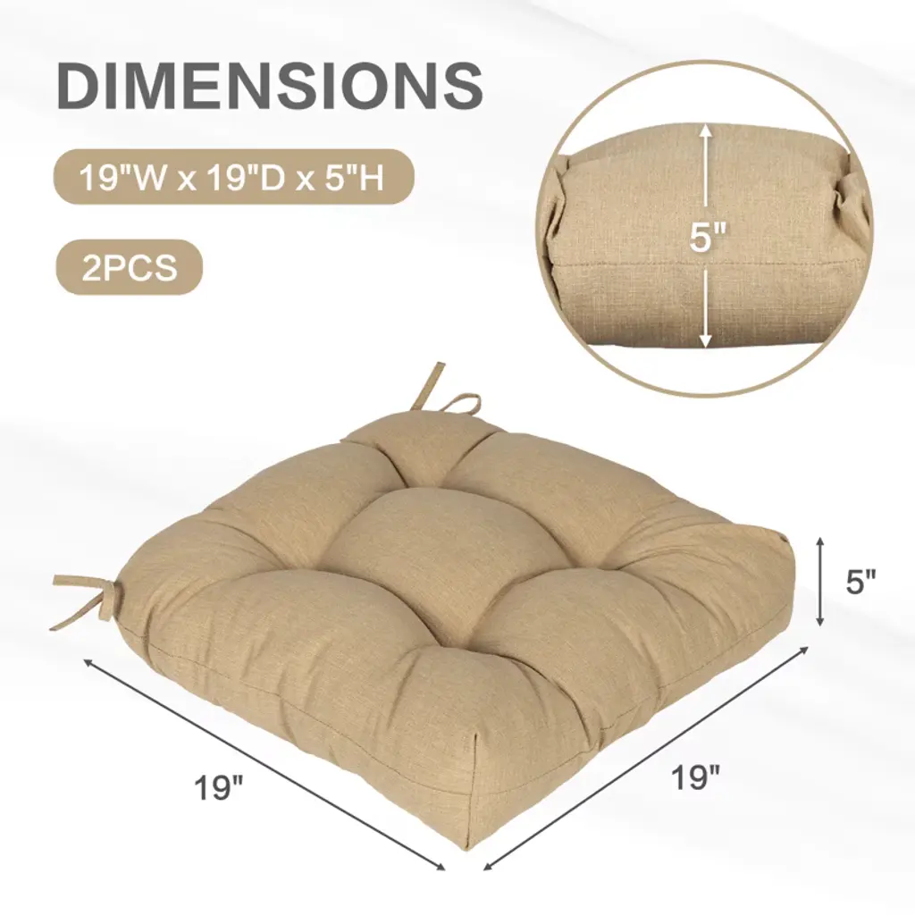 Aoodor 19" x 19" x 5" tufted outdoor chair cushions combine functionality and style for patios, balconies, or indoor spaces. The UV-resistant and fade-resistant polyester cover withstands over 1,000 hours of direct sunlight, while the water-resistant TPU lining ensures weather resistance and durability. Filled with PP cotton and crumb foam, these 5-inch thick cushions are soft and supportive, offering ultimate comfort. Straps on two corners secure the cushions to chairs; the elegant tufted design prevents filling from shifting, ensuring even distribution. Available in five color options to complement various outdoor furniture styles, these cushions are ideal for both indoor and outdoor dining and lounge chairs.