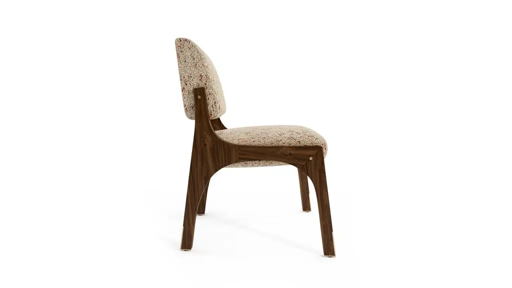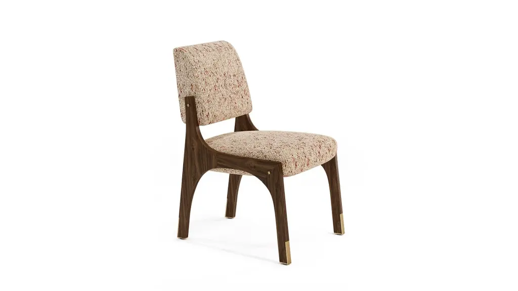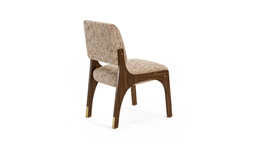 The Arches II dining chair is designed in the likeness of the architectural scale that suggests a crossing through the structures of a utopian city, organized by the principles of symmetry and ideal forms.The Arches II dining chair is a redesign of the original dining chair. The chair profile shows details that seem to be drawn from large architectural structures. The raised backrest is subtly elevated by the structure, whereas a folded brass bar arises as a support element that prevents the contact of the arches with the floor.The Arches II is a sculptural chair manufactured by a team of joinery, upholstery and exquisite metal work that catches the eye of those who seek for a unique design.Product detailsFrame: walnut in matt varnish. Feet: brushed brass.Upholstery: InsidherLand Tan ref. 03COM: 1.5m 58.99in. (Standard width 140cm 55in.)Product optionsFrame: Lacquered in any Ral Classic color, other woods and finishes under request.Upholstery: InsidherLand fabrics or client's fabric.Weight: 10Kg 22,1 lbsMade to order. Custom sizes and other finishes are available under request.Designed by Joana Santos Barbosa, 2024. Handmade in Portugal.