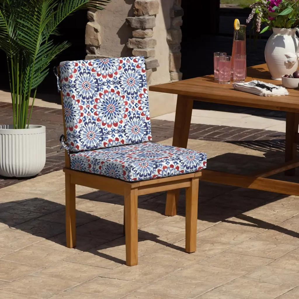 Experience the perfect blend of style, durability, and performance with ARDEN cushions made with ProFoam. This cushion dries twice as fast as standard cushions. Our Dining Chair Cushion is designed for lasting comfort and is made with long-lasting polyurethane foam and 100% outdoor polyester fabric with a skin-safe PFAS-Free C0 treatment and features TPU lamination for rain-proof protection. The patented waterfall design ensures water and rain roll off effortlessly, keeping your cushion dry and ready for use. It measures 20" W x 40" L x 3.5" H (Back: 20" W x 20" L and Bottom: 20" W x 20" L) and resists fading, ensuring your cushion will stay bright and beautiful longer. Your outdoor chair cushion provides durability against the elements while being easy to clean with just soap and water and includes four sets of ties to keep the cushion firmly in place, no matter the seating arrangement. Durable foam maintains its shape, delivering consistent support for extended outdoor use. While the cushion is both water and UV-resistant, we recommend storing it indoors during heavy rain or when not in use to maximize its lifespan and maintain its flawless appearance. Transform your patio seating into a cozy retreat with ARDEN cushions—designed for comfort, and built to last. This kit includes 2 foam rolls (1 for back and 1 for bottom) and 1 cushion cover.