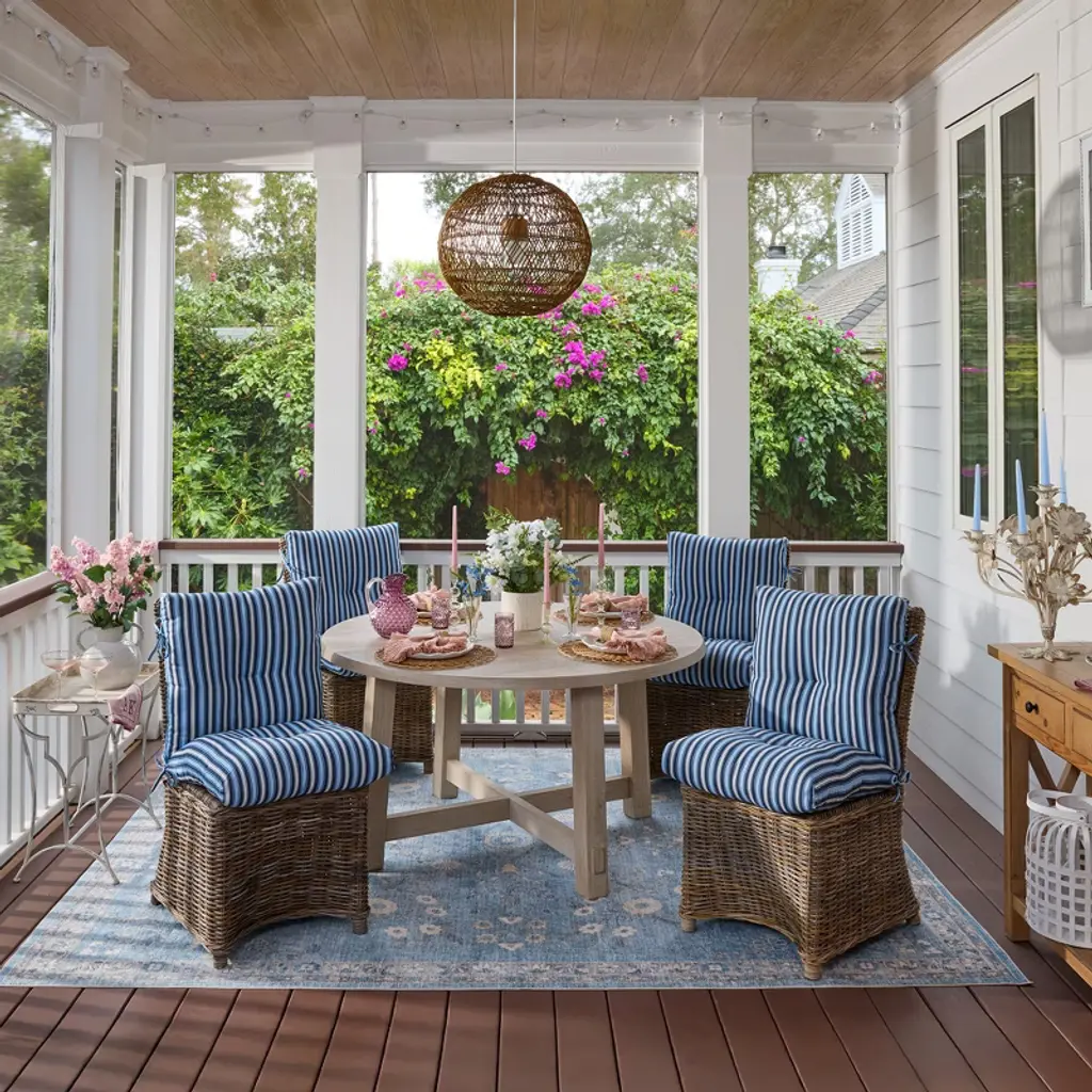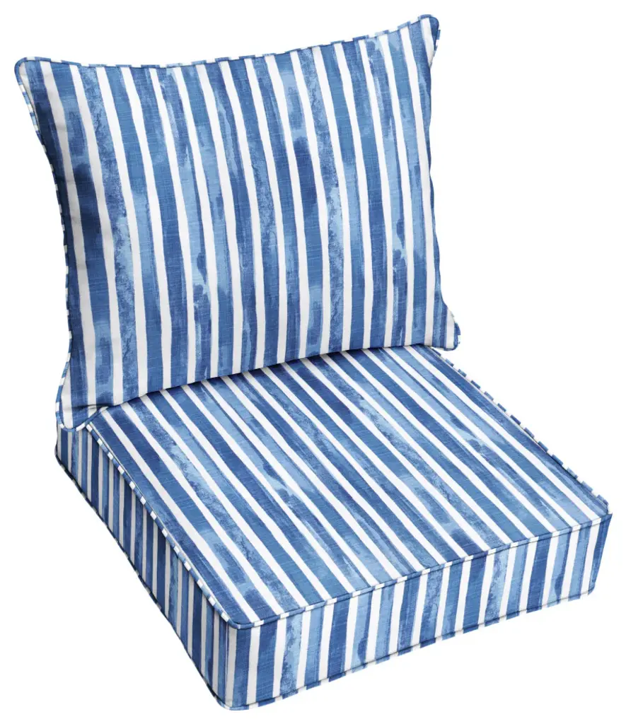 The Arden x Alexandra Kay Plush Blowfill Chair Cushion 2-Pack is made with soft polyfiber fill and long-lasting outdoor polyester fabric with PFAS-Free C0 treatment. Alexandra Kay collaborated with the Arden design team to bring her palette and style to this ultra-comfortable outdoor dining cushion that is also eco-friendly and Skin-safe for your family. This outdoor chair cushion measures 21in W x 40 in L x 5 in T (Back: 21 in W x 21 in H and Seat: 21 in W x 19 in L). The 100% printed polyester outdoor fabric resists fading, so your patio cushion looks vibrant for longer. Skin-safe C0 water protection helps your dining cushion withstand continued outdoor use, while cleaning easily with just soap and water for low-maintenance upkeep. Four sets of ties make sure your outdoor chair cushion stays firmly in place, while 2 tufts to add a decorative touch. Inside this outdoor chair cushion is 100% polyfiber blowfill to help it retain shape and provide long-lasting comfort during outdoor use. Made from 100% recycled plastic bottles, the polyfiber fill provides an environmentally friendly and durable option for your backyard patio. Sink into the plush design and enjoy your chair cushion set while sipping coffee with family or cocktails with your friends.