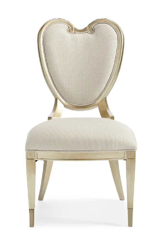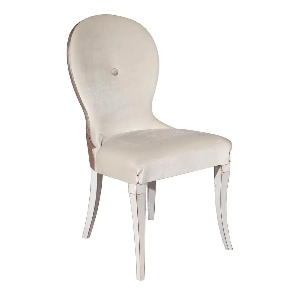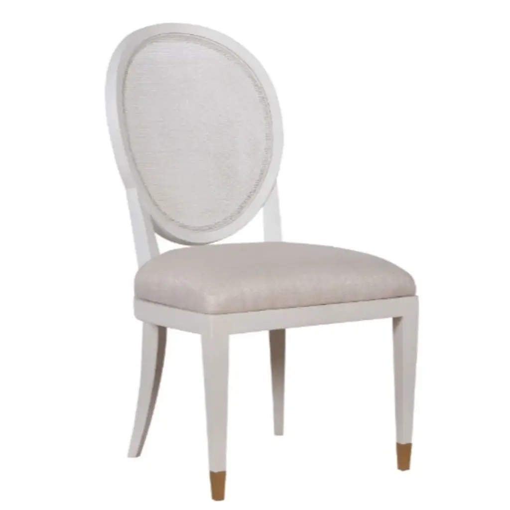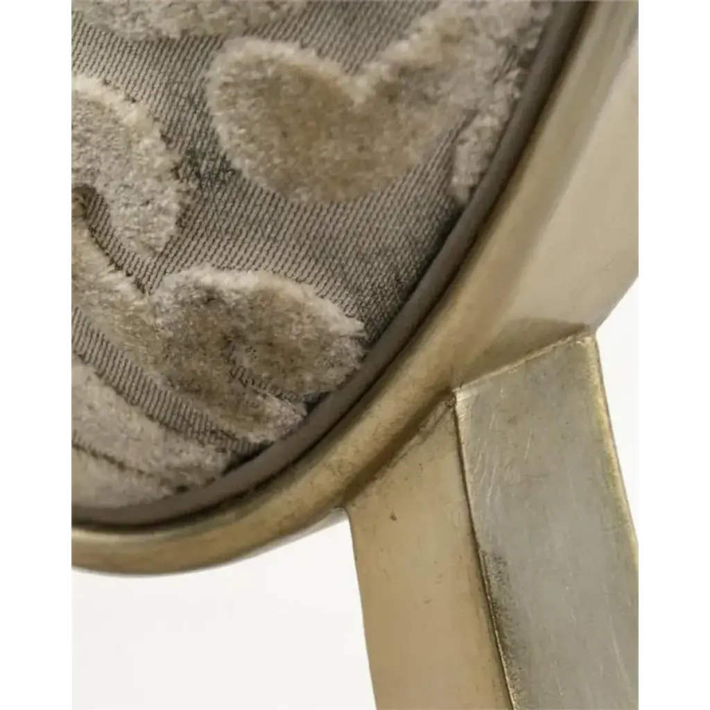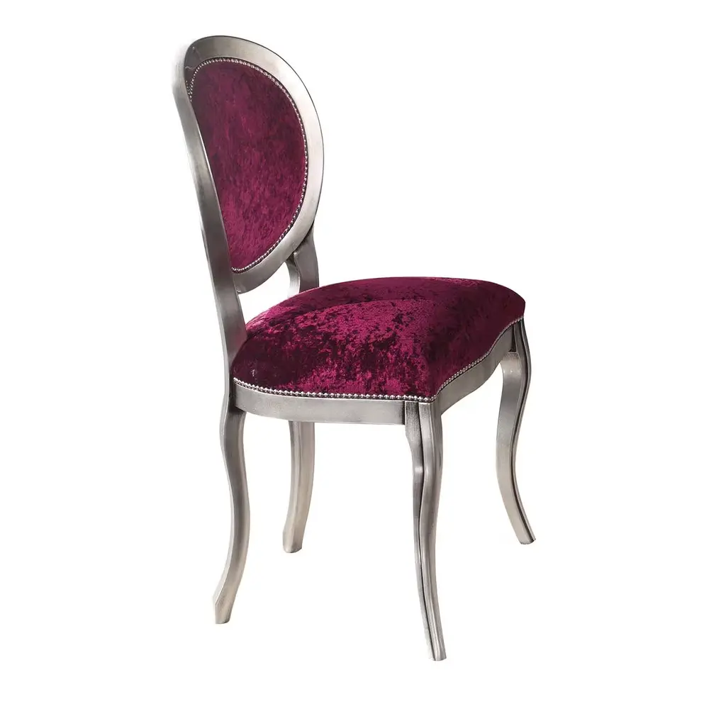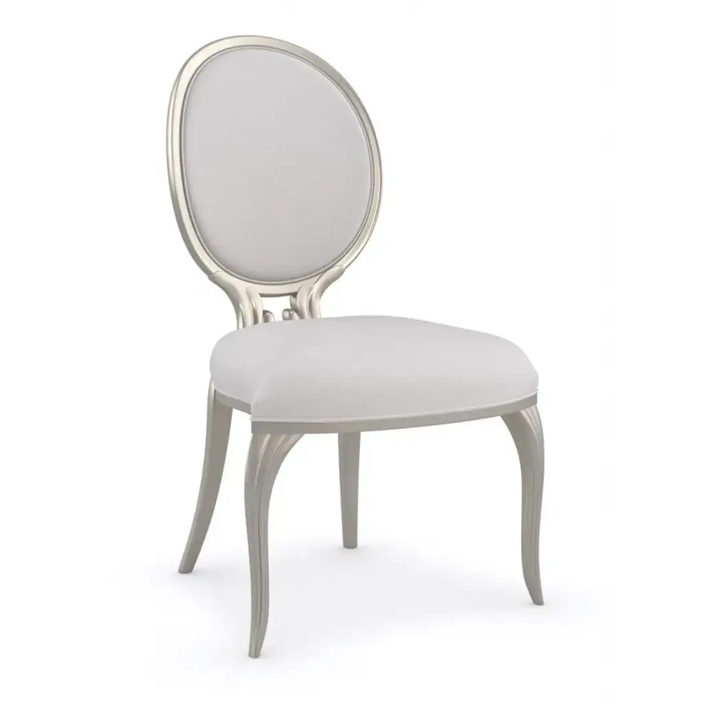 A contemporary dining side chair with an oval back is shown in a burnished silver finish and upholsered in a damask brown fabric.