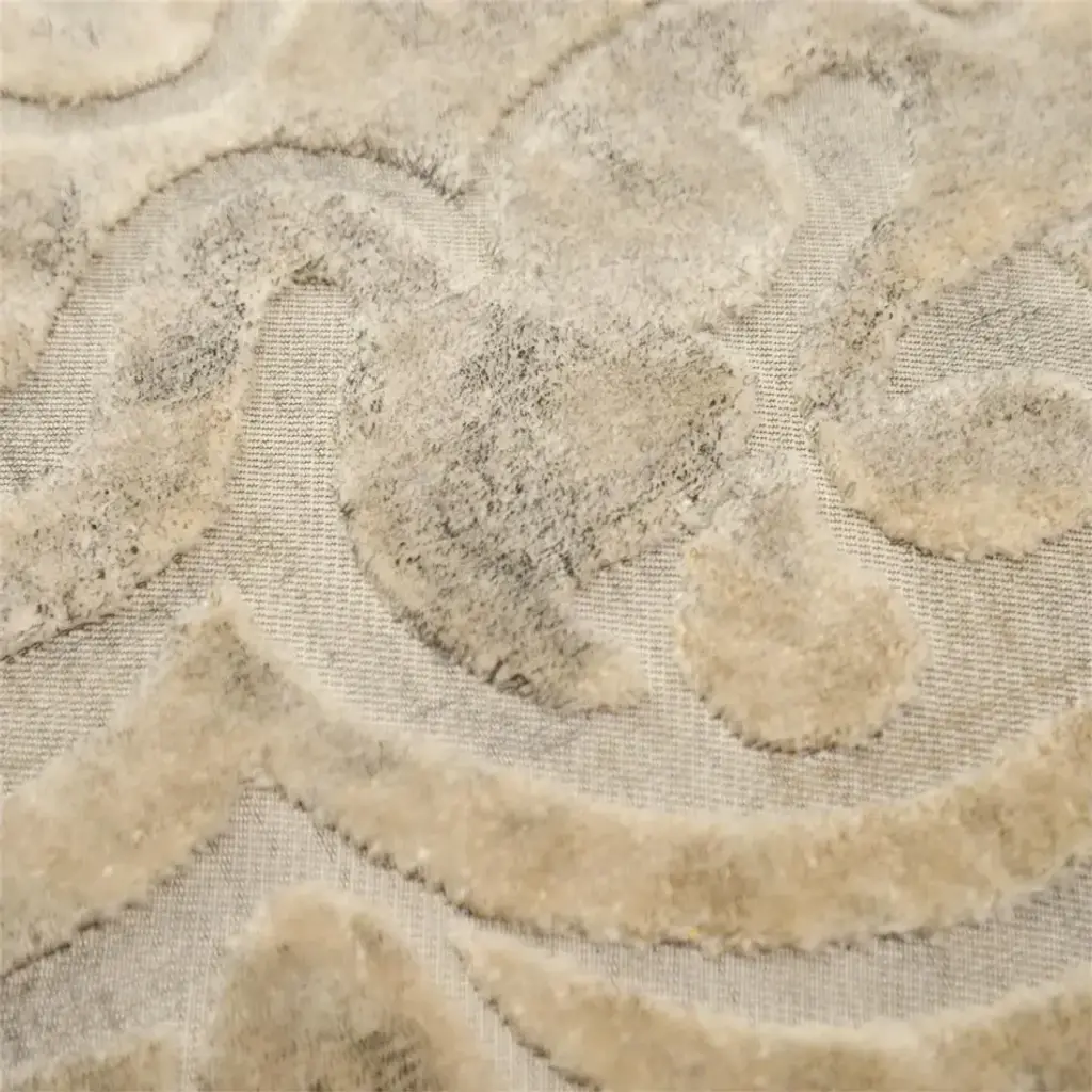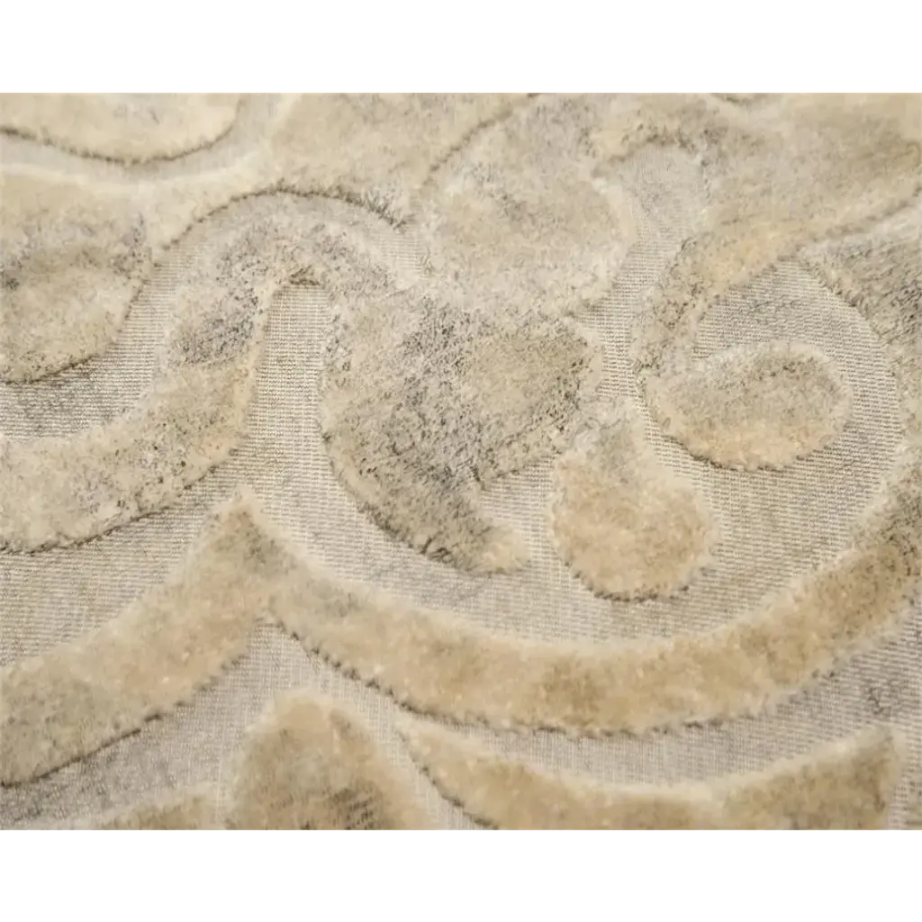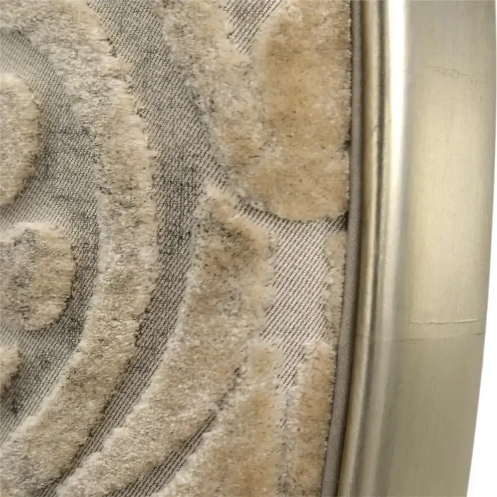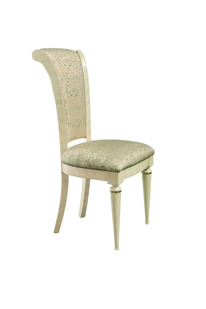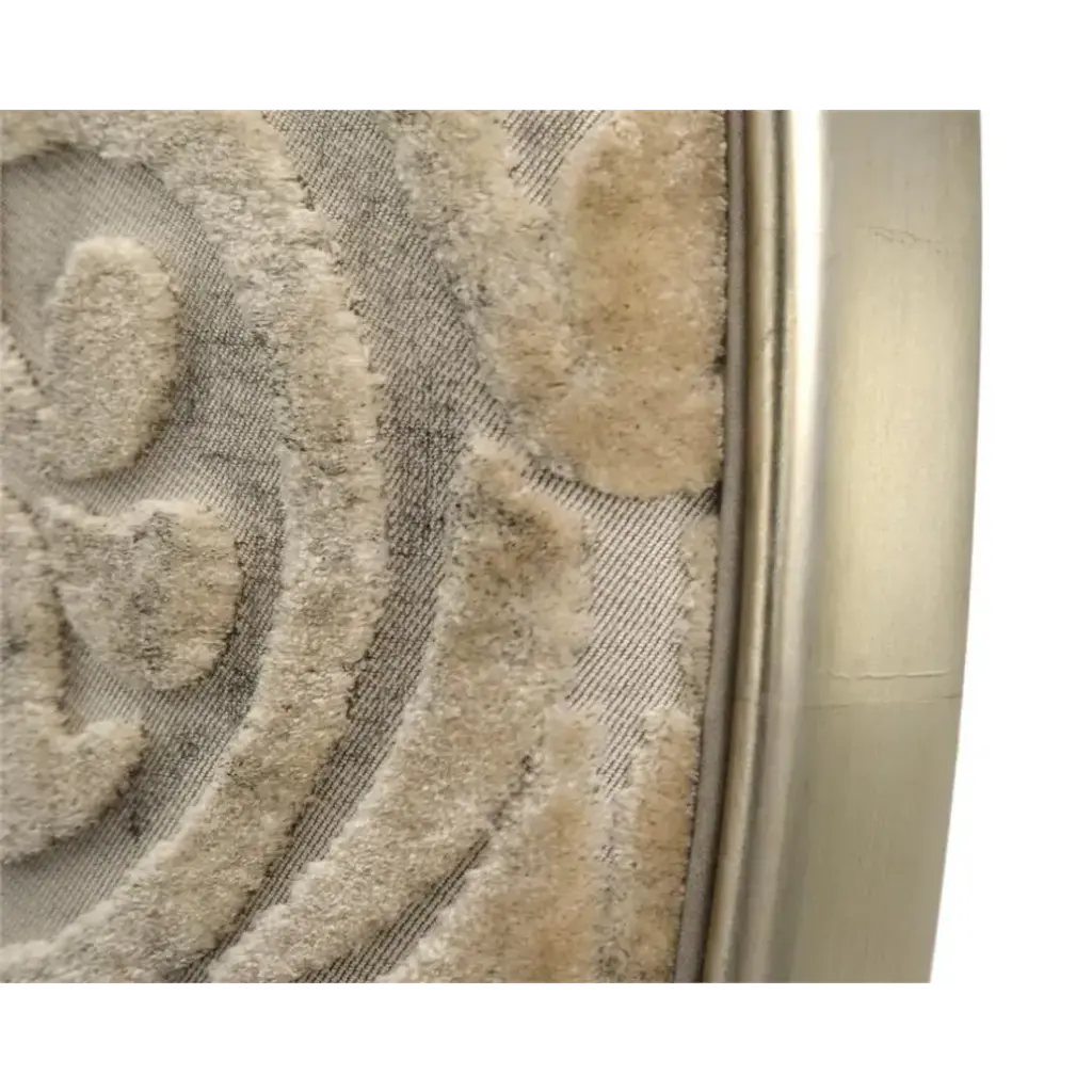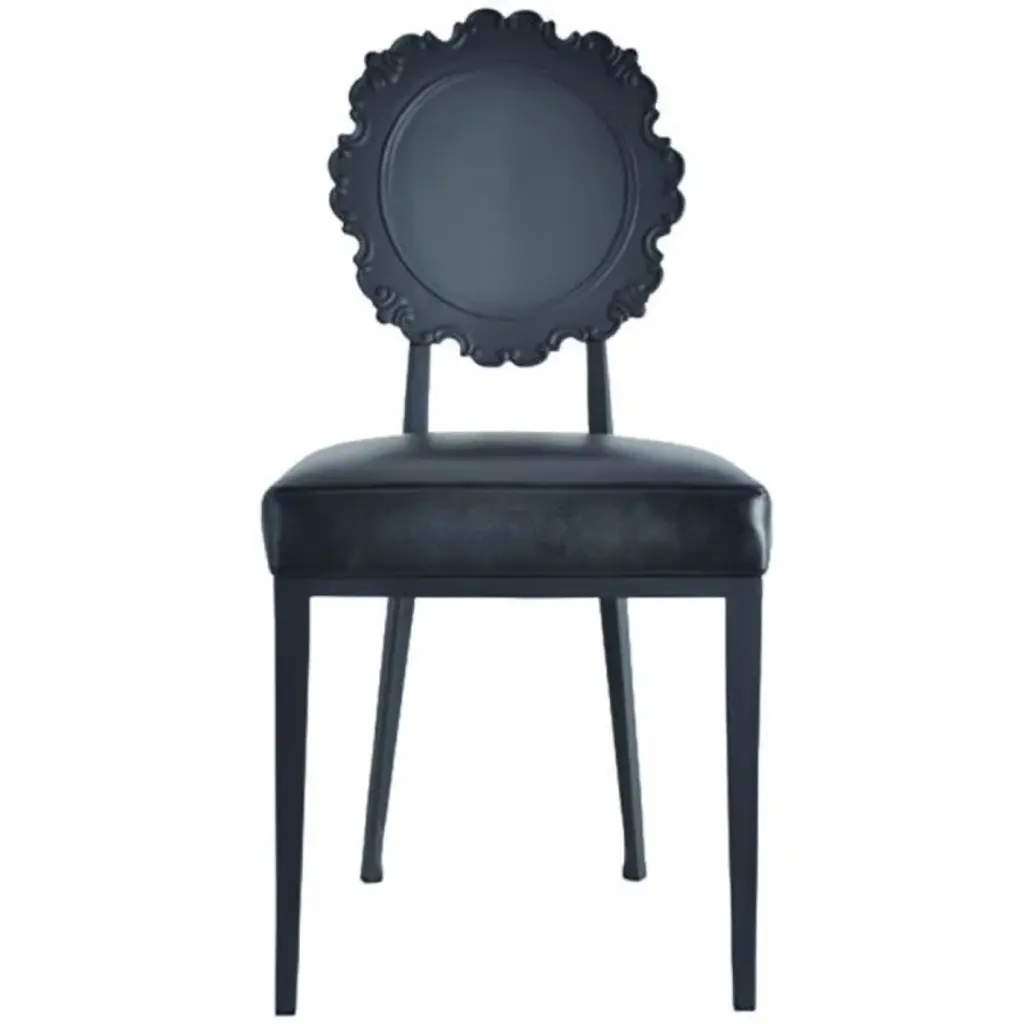 A contemporary dining side chair with an oval back is shown in a burnished silver finish and upholsered in a damask brown fabric.