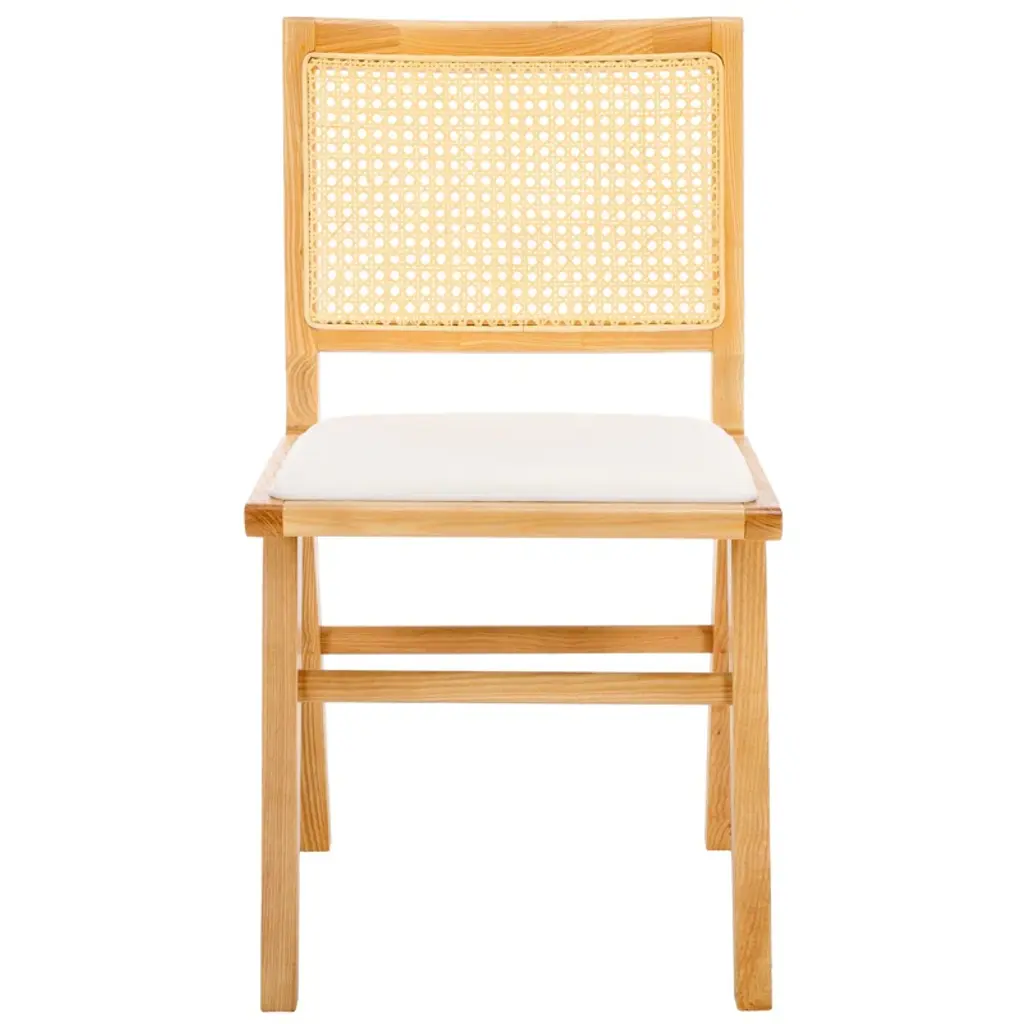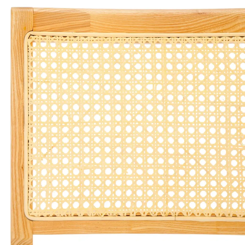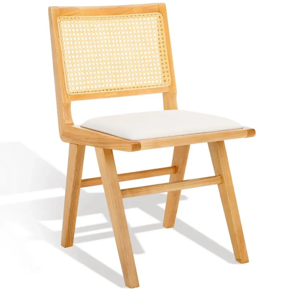 Embrace the chic appeal and easy comfort of our Arieana cushioned dining chair. The clean and crisp geometry of the chair meets the warmth of a natural cane to attain a relaxed and sophisticated presence. A stunning French cane weave upon the backrest elevates the airy appeal and elegance of our chair. Its cane back is beautifully grounded with a black birch wood frame and angular legs. A perfect fit for both your casual and formal meals, our dining chair brings comfort and breezy charm to your kitchen, dining, or living space.