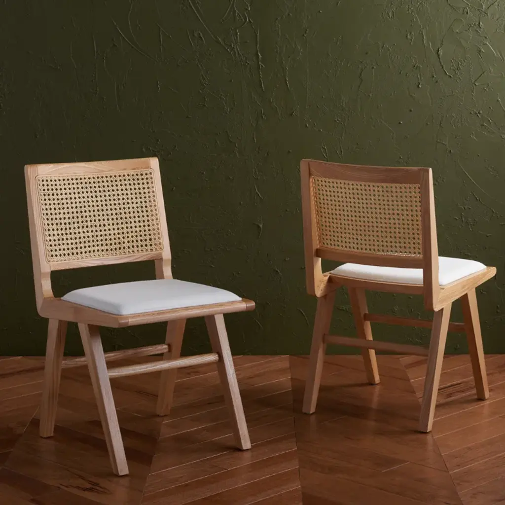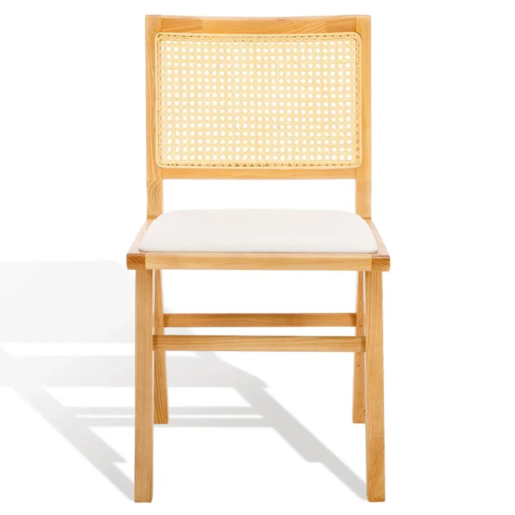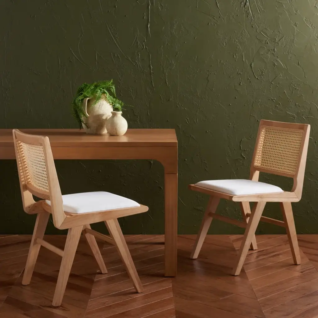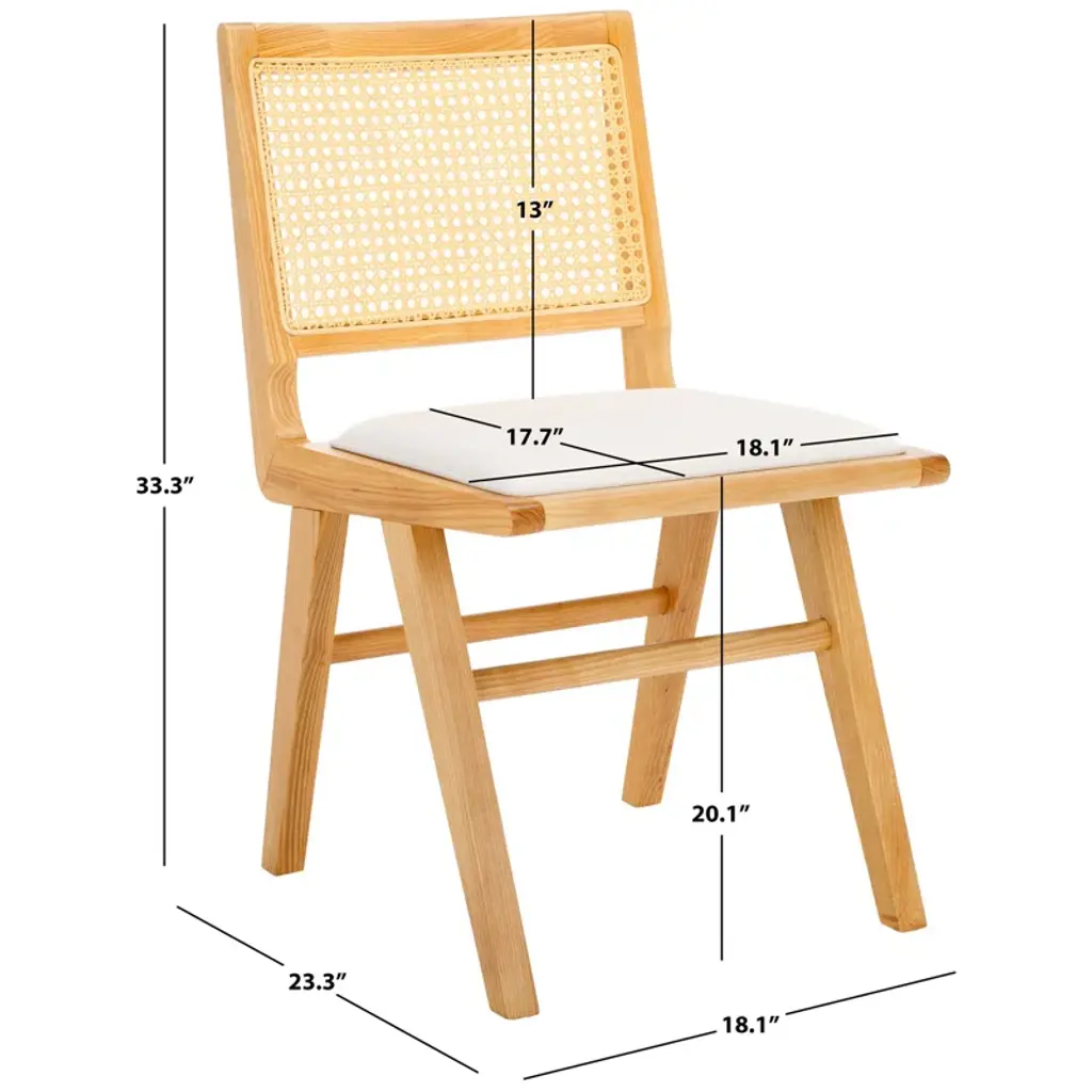 Embrace the chic appeal and easy comfort of our Arieana cushioned dining chair. The clean and crisp geometry of the chair meets the warmth of a natural cane to attain a relaxed and sophisticated presence. A stunning French cane weave upon the backrest elevates the airy appeal and elegance of our chair. Its cane back is beautifully grounded with a black birch wood frame and angular legs. A perfect fit for both your casual and formal meals, our dining chair brings comfort and breezy charm to your kitchen, dining, or living space.