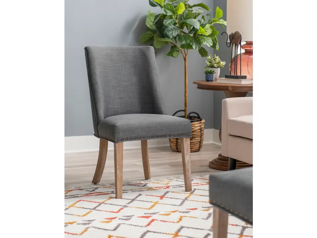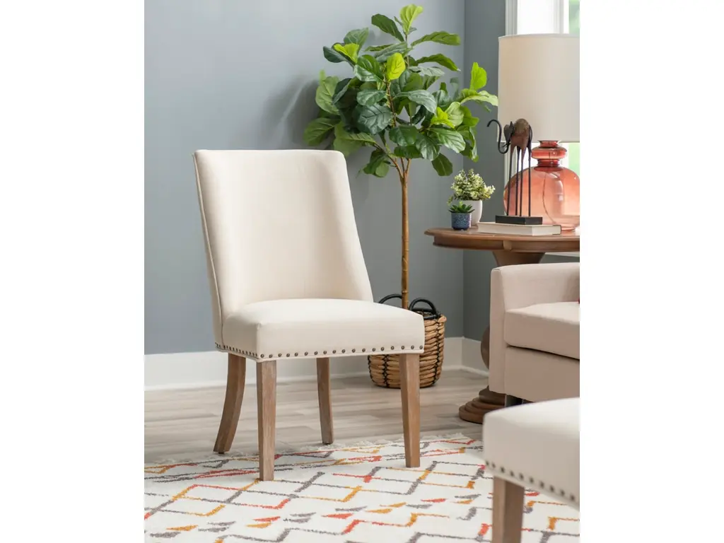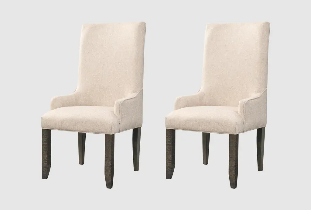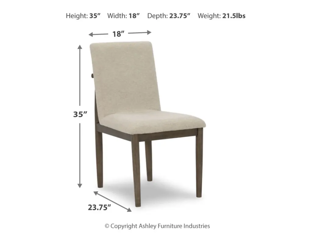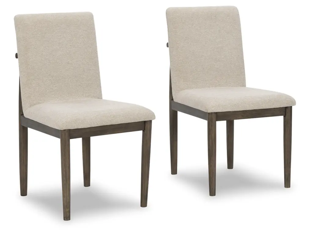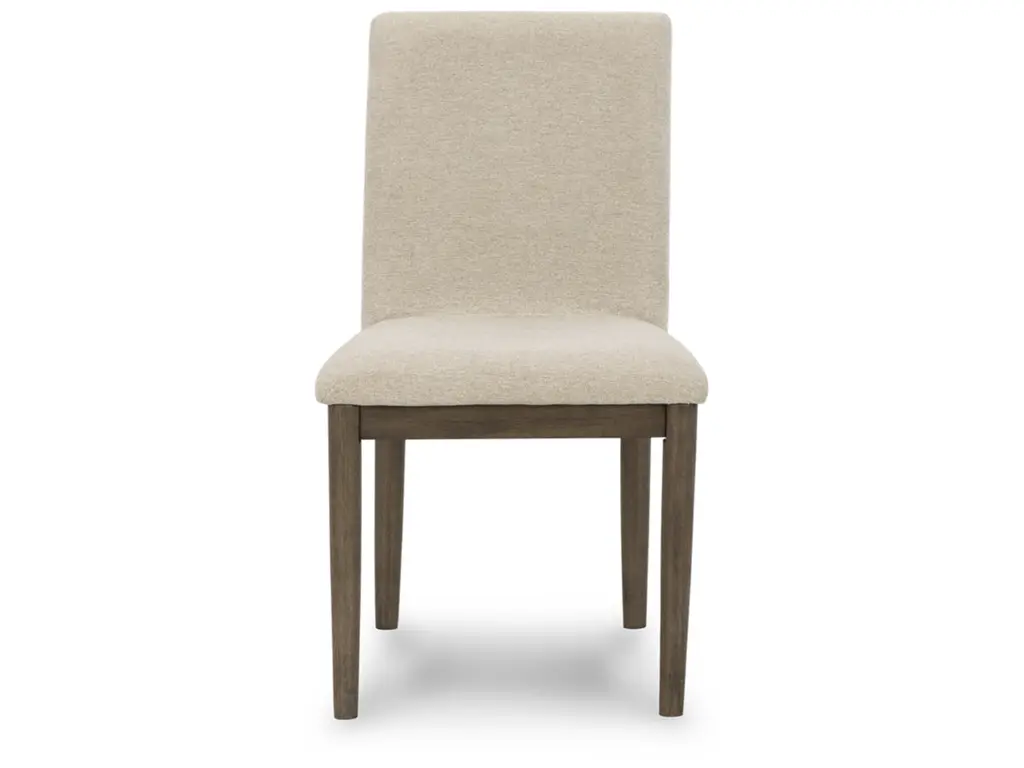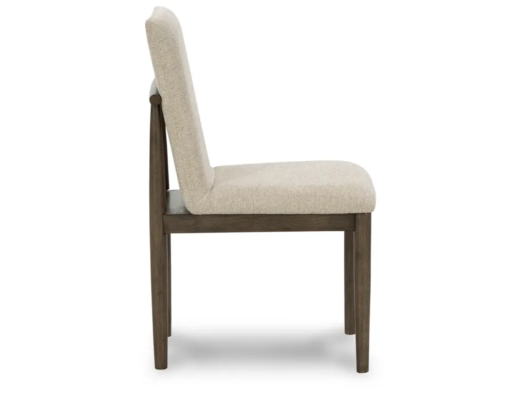 The Arkenton upholstered dining chair has all the right ingredients for modern design done to perfection. Its frame is beautifully crafted with solid hardwood. Textural tan upholstery, spindle legs and a complex grayish brown finish give the piece a contemporary edge.