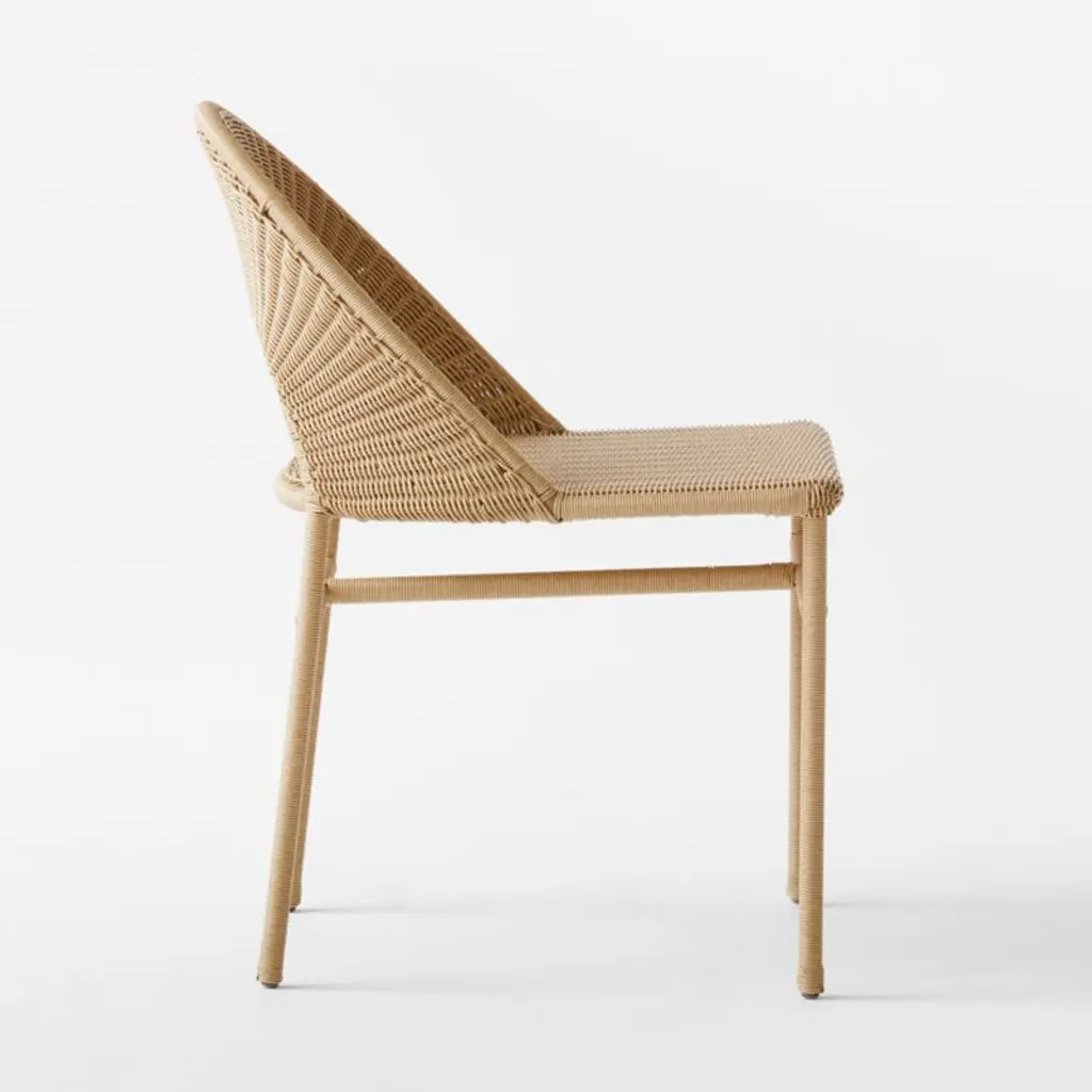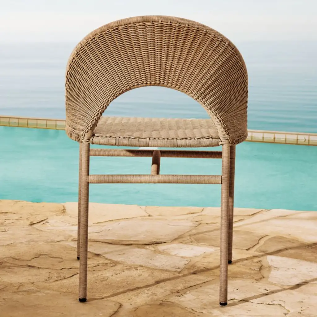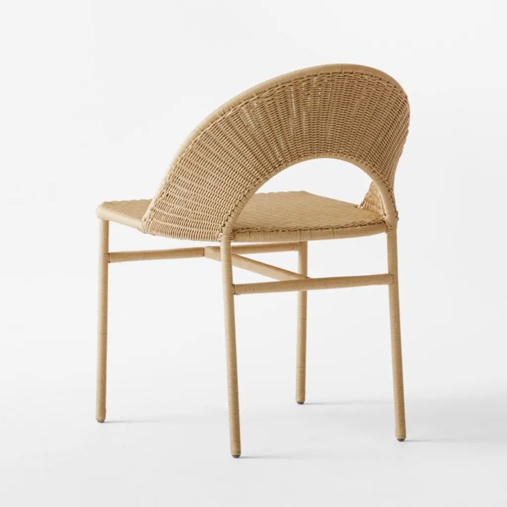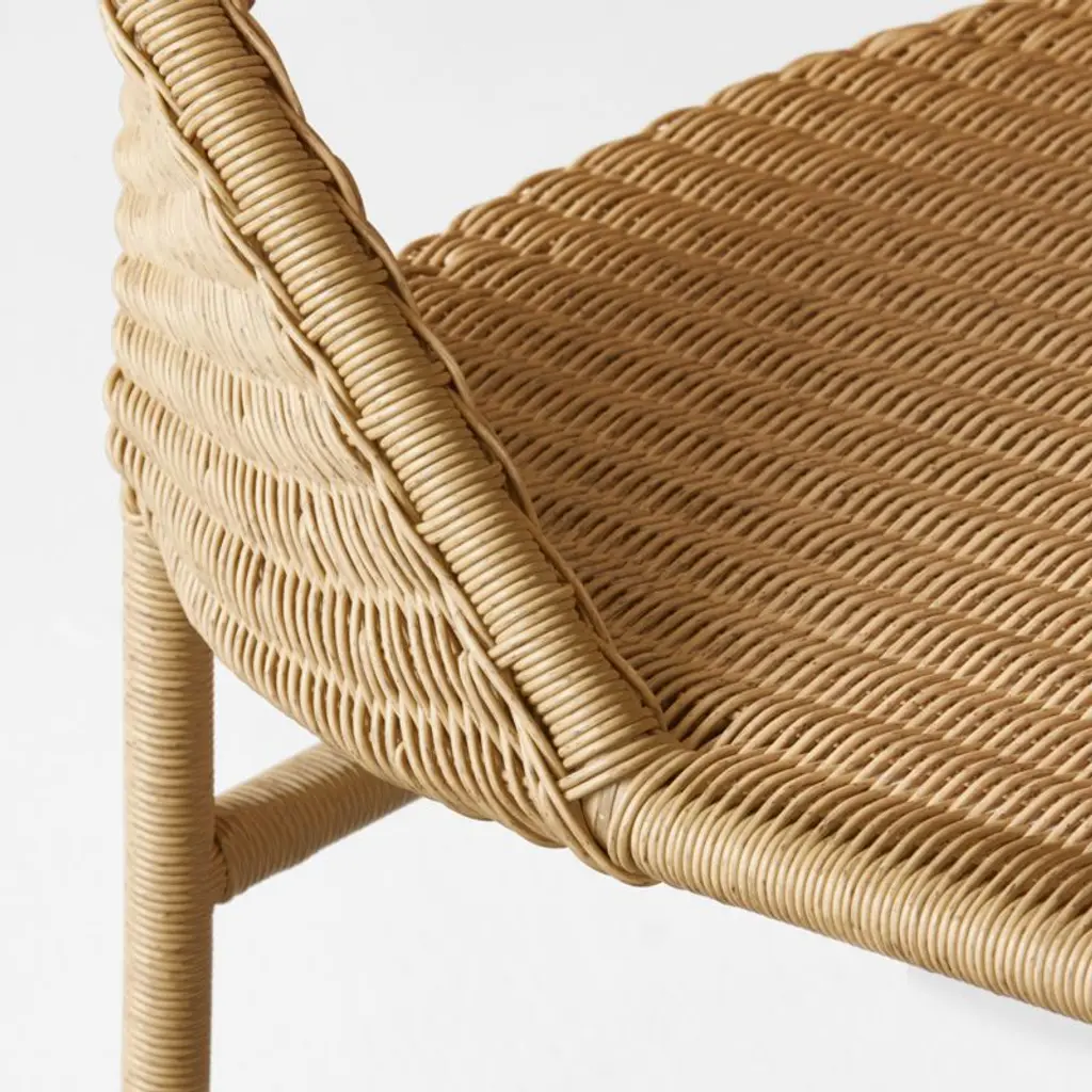 Outdoor dining chair by Mermelada Estudio borrows inspiration from Brazilian Modernism, with a bold arched backrest and generously sized seat. Steel frame is wrapped in light brown all-weather faux wicker designed to look beautiful while resisting the ravages of weather. CB2 exclusive.