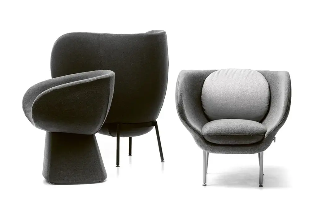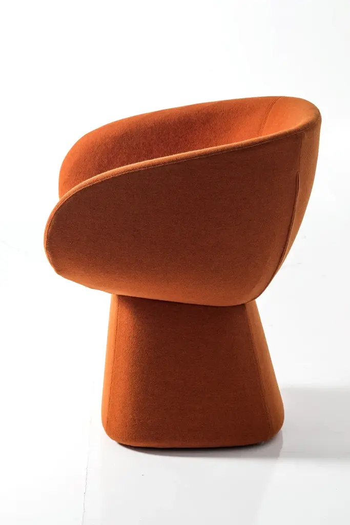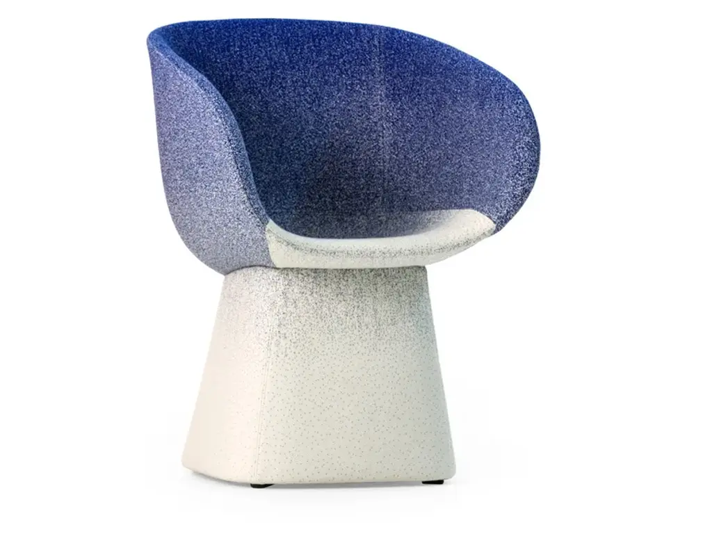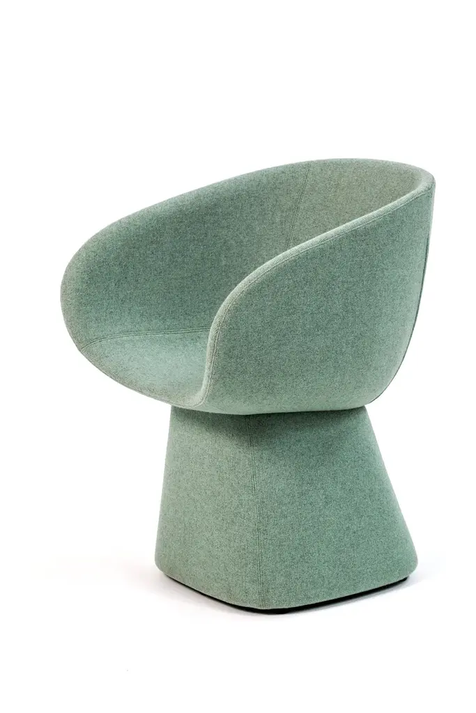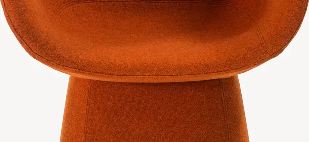 Armada has injected flame-retardant polyurethane foam over internal steel frame.Dining chair base is fully upholstered. Available in fabric or leather. Covers are not removable.’Armada’ is a sculptural seating collection that was designed for open work and lounge spaces. The blown forms of the armchairs billow out from the seat like wind filled sails, creating a sense of lightness and movement, while providing degrees of privacy and seclusion. The form language explores the use of surface and volume through a combination of thin upholstered sides with voluminous soft cushions on the inside providing comfort for working on the move. The collection consists of a high and low back armchair and a fully upholstered dining chair on a pedestal.