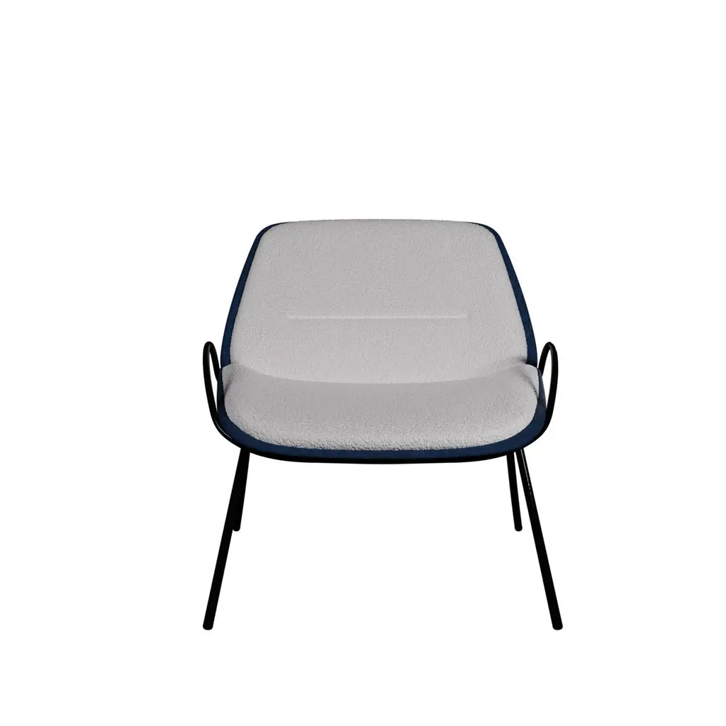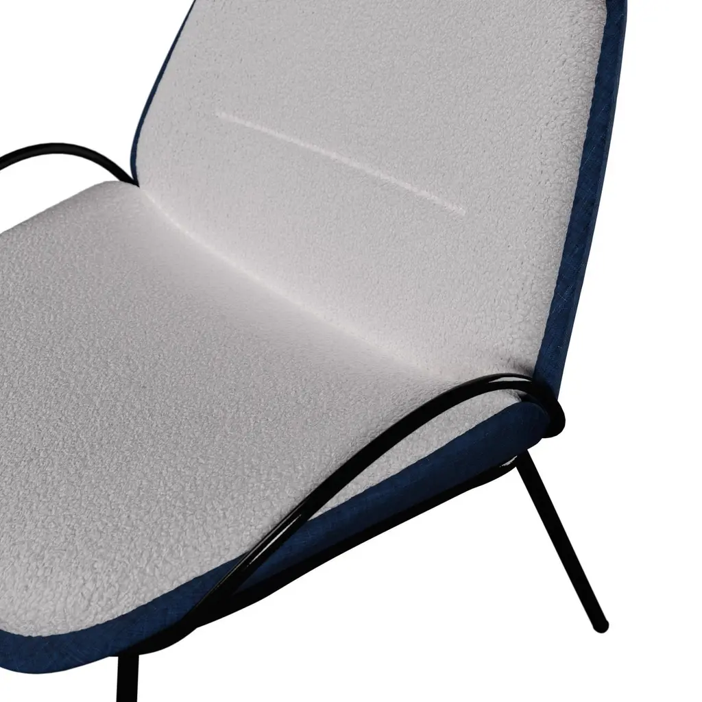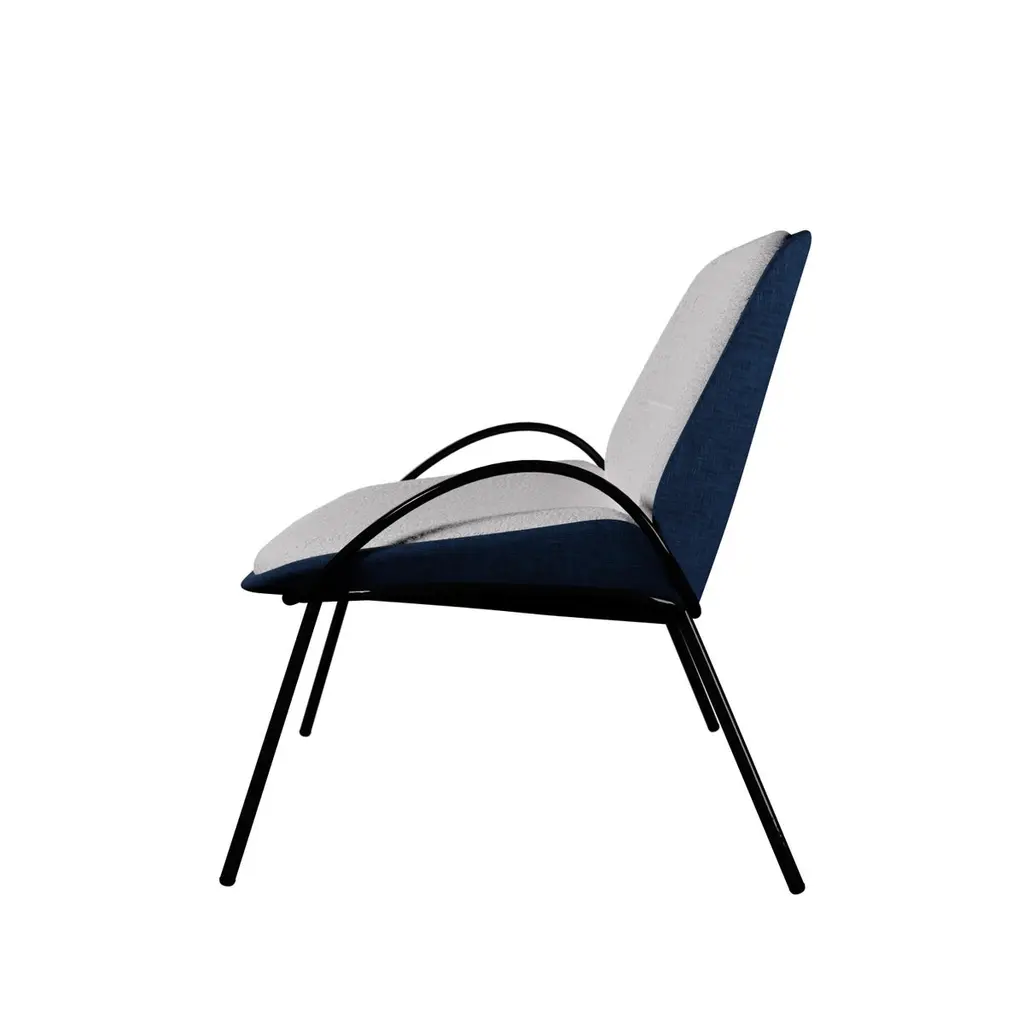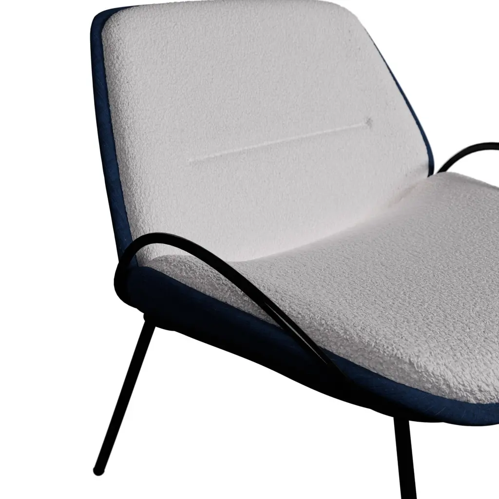 Designed with comfort and design in mind, the Much armchair with half arms is a versatile chair that offers a unique and elegant solution for your home.Crafted from a sturdy black epoxy iron frame, Munch exudes a modern and industrial aesthetic. The outside back is upholstered in a vibrant blue fabric, creating a striking contrast with the inside seat and back, which are upholstered in a luxurious white bouclé. This combination of textures and colors adds a touch of sophistication to any space and can be customizable according to your taste. Each Munch armchair is meticulously handmade by skilled artisans, ensuring the highest quality and attention to detail. We use only the finest raw materials to guarantee durability and longevity. The chair's design prioritizes comfort, providing ample support for long hours of sitting.