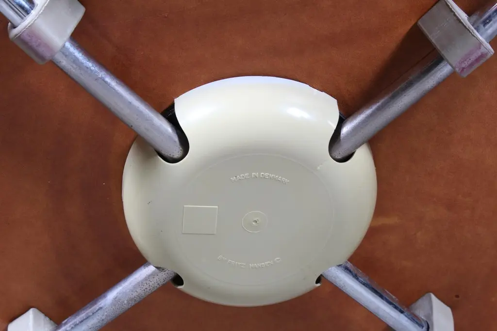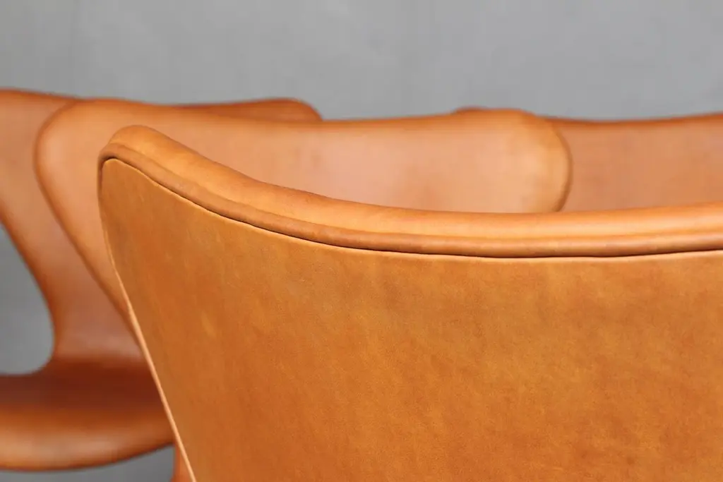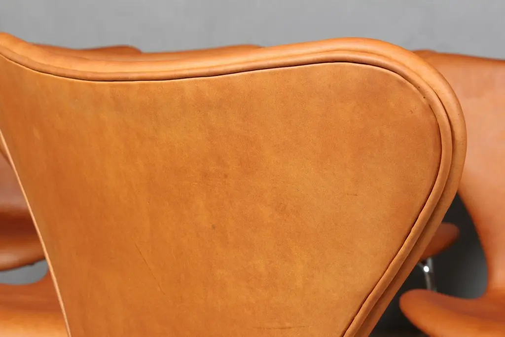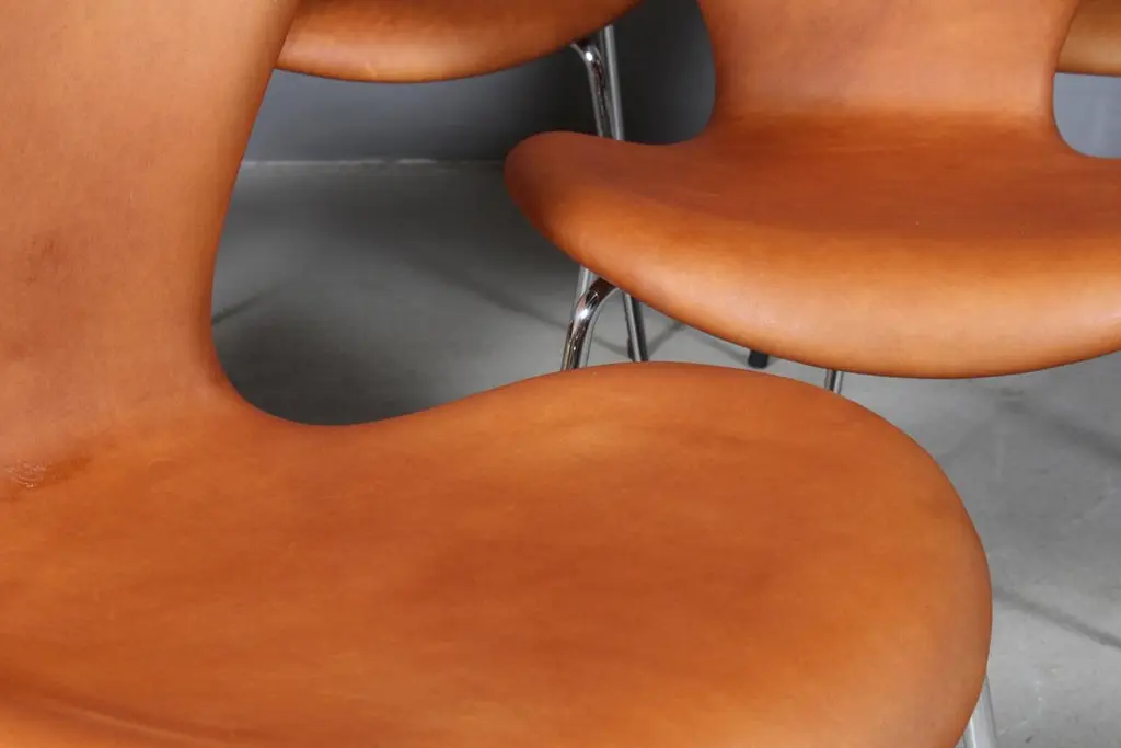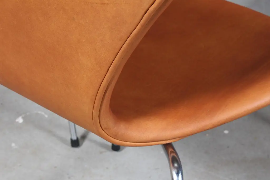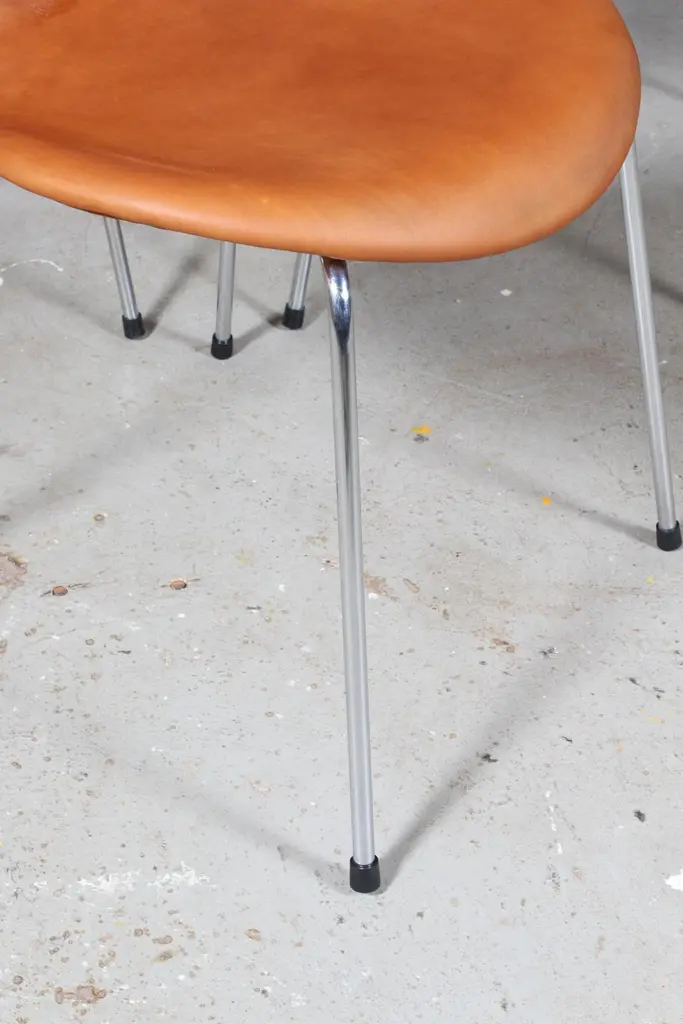 Arne Jacobsen dining chair new upholstered with cognac vintage aniline leather.Base of chrome steel tube.Model 3107 Syveren, made by Fritz Hansen.