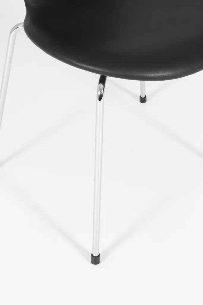 Arne Jacobsen dining chairs, new upholstered with black aniline leather. Chromed base. Model 3101 "Ant", made by Fritz Hansen.