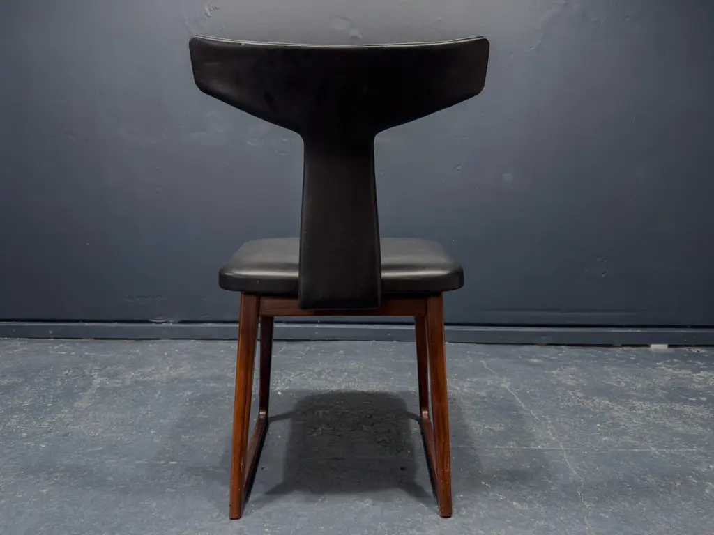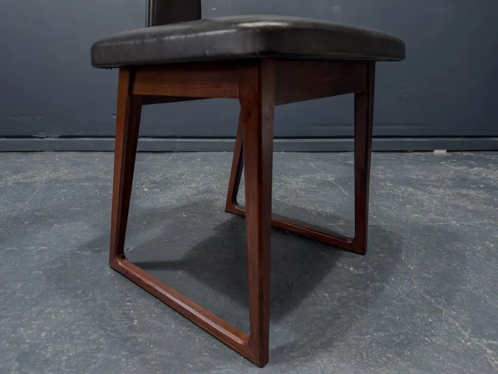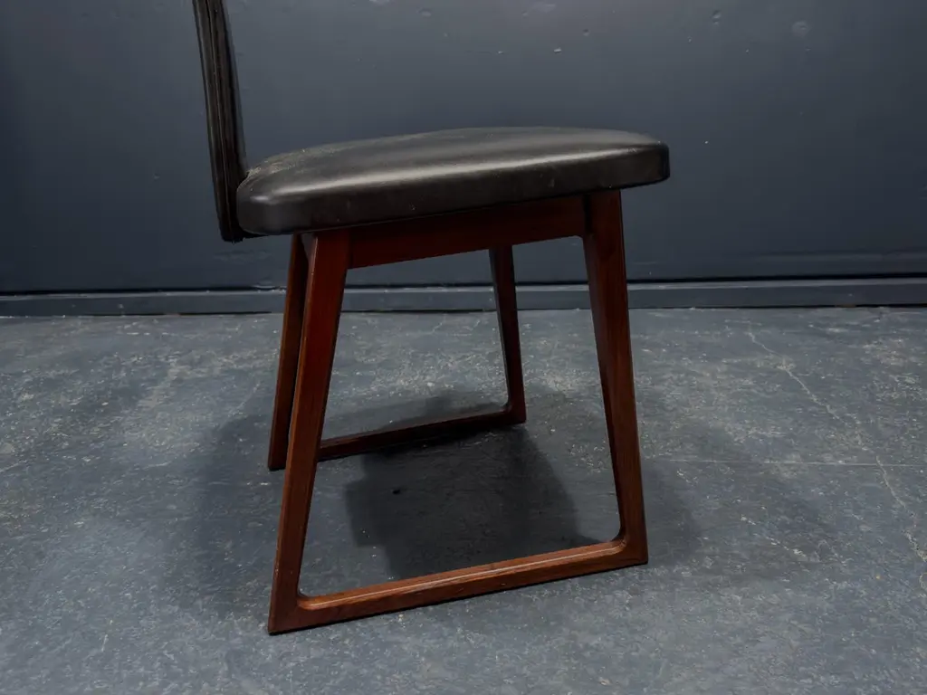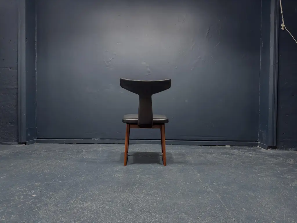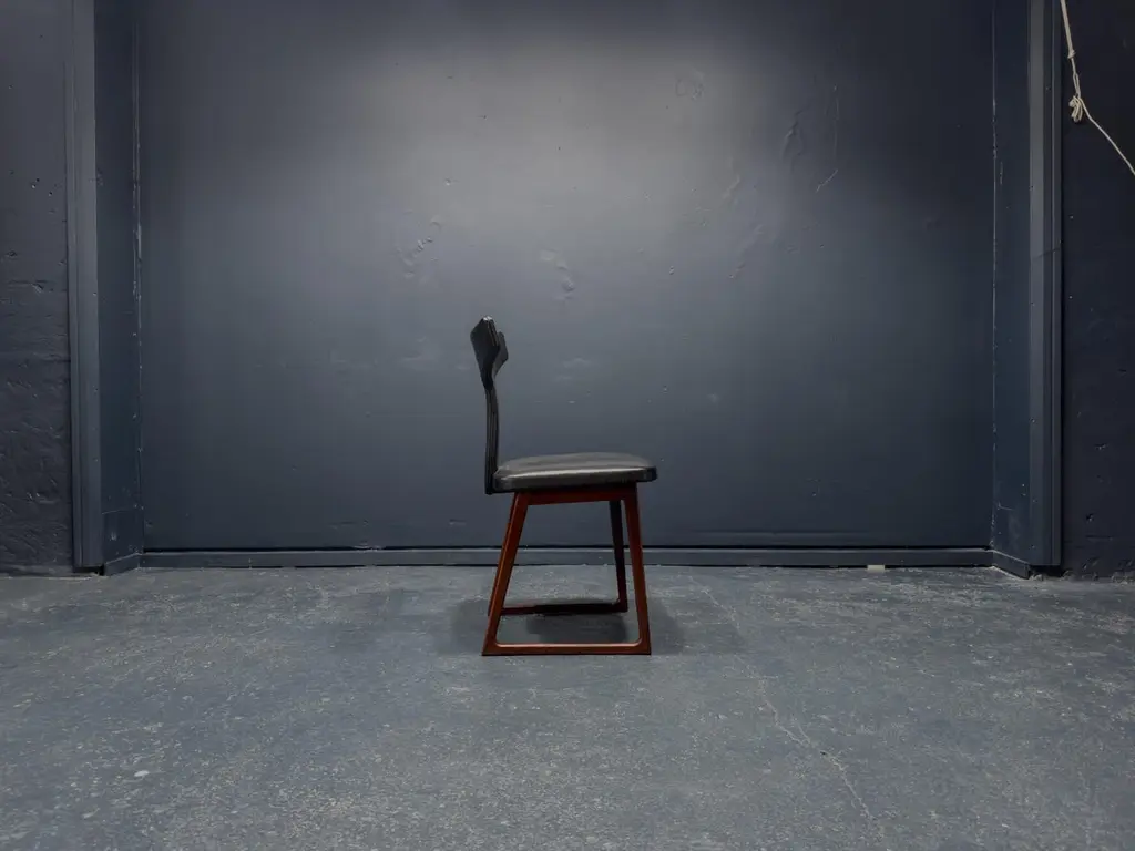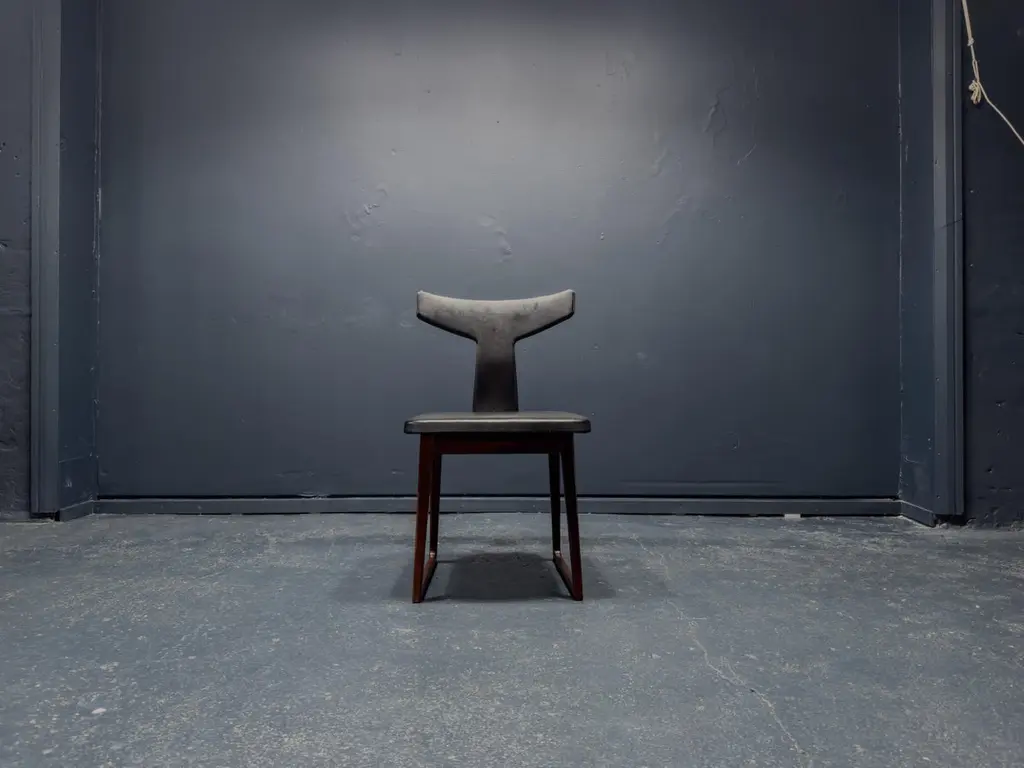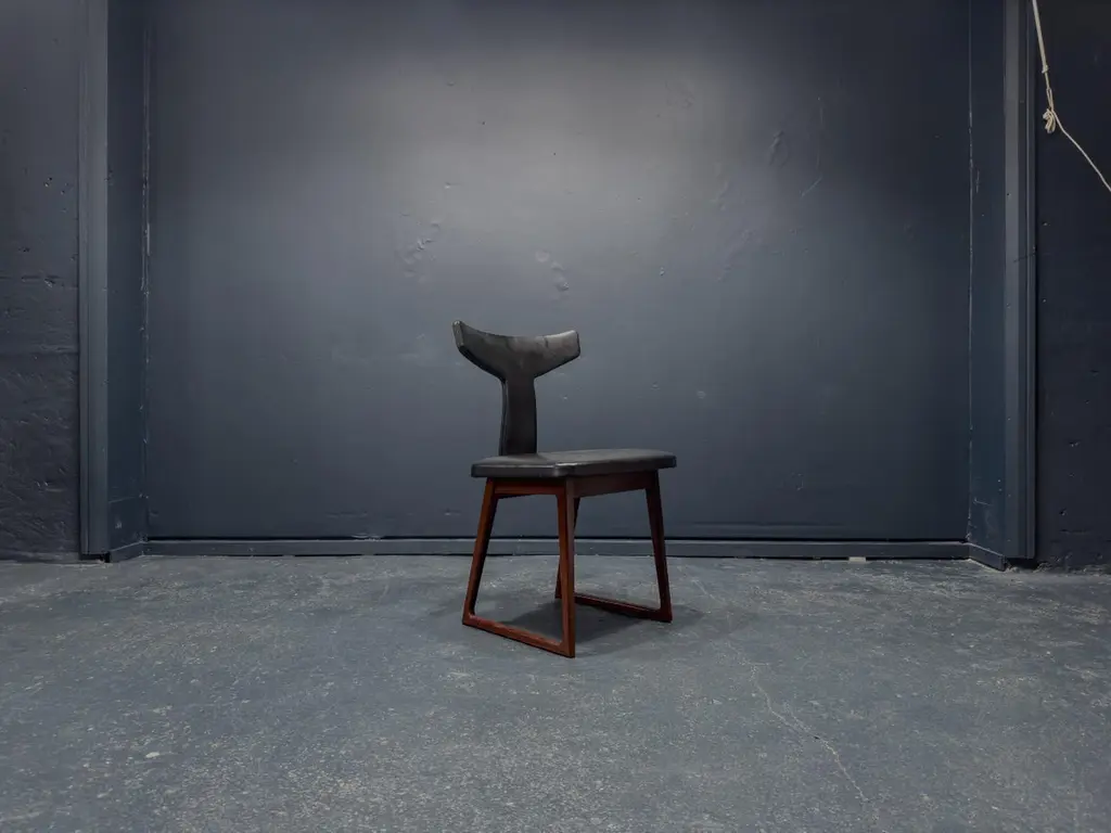 Created by Danish designer Arne Vodder in the 1960s for furniture manufacturer Sibast Furniture, this chair is a wonderfully unique piece. With a stunning hardwood frame and upholstered leather seat, the chair features gorgeous quality materials reflecting the consideration and care applied to the design. With angles and lines, from the frame to the backrest, creating interesting shapes throughout the design it is clear this piece is a true statement of mid-century craftsmanship.