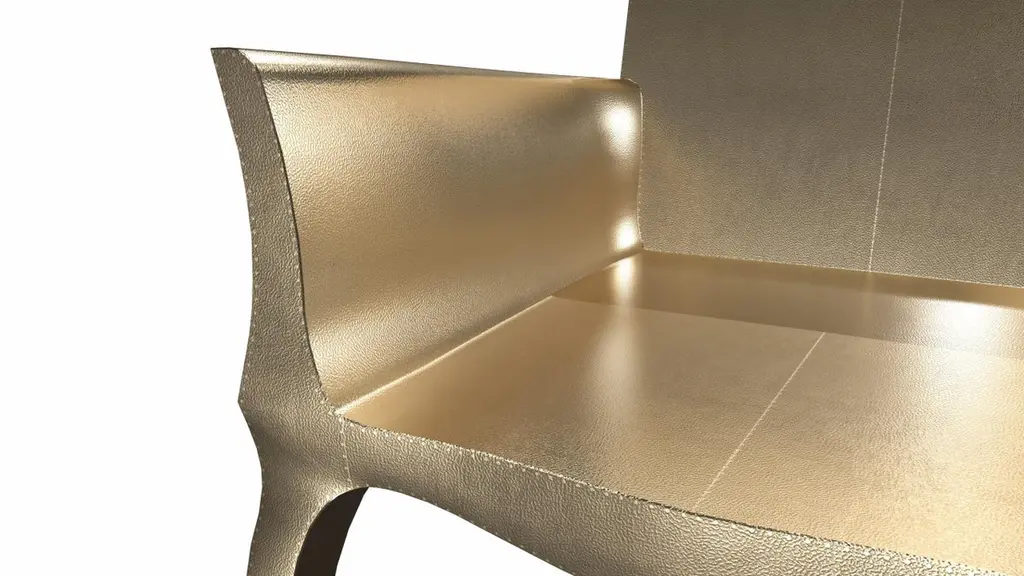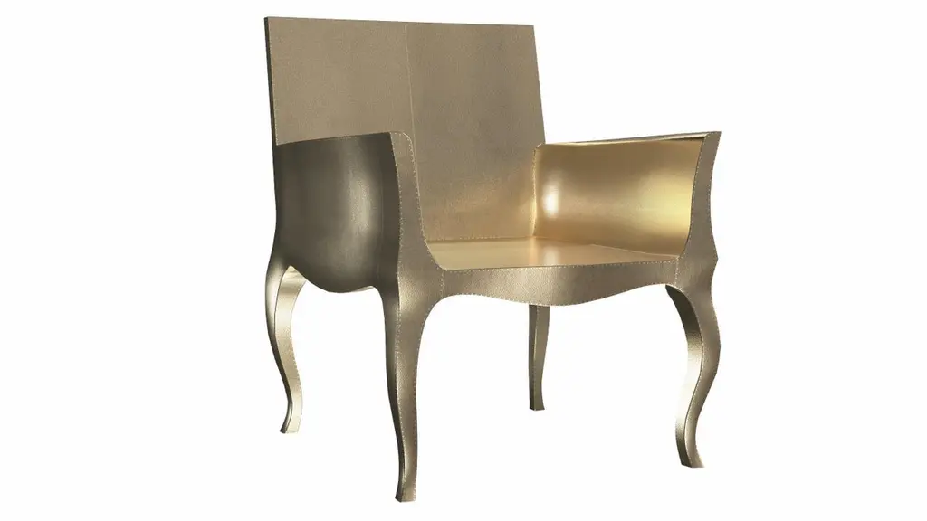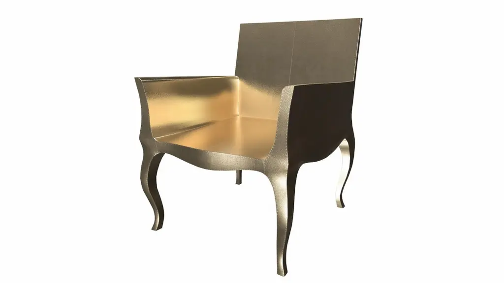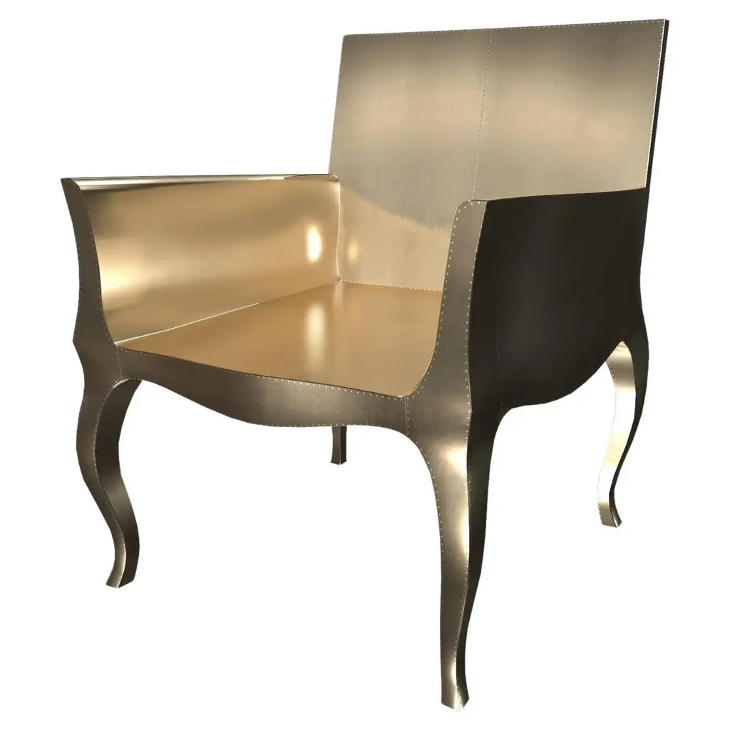 Introducing the Art Deco Chairs, a stunning Art Deco Chairs set designed by the renowned Paul Mathieu for Stephanie Odegard. This elegant Art Deco Chair duo boasts a unique curved profile that exudes a sophisticated and timeless charm, making it the perfect addition to any modern or classic interior.Crafted with utmost care and attention to detail, these Art Deco Chairs are made to order and are available in twelve metal clad finishes, ensuring that you can choose the perfect one to match your individual style and taste. The use of high-quality materials and expert craftsmanship ensure that each Art Deco Chair is not only beautiful but also a true piece of art.The curved legs and side arms of this Art Deco Chair are hand carved from solid pieces of teak. Pattern makers trace and cut complex forms that will cover the chair in a skin of copper, white bronze, brass or antiqued white bronze The metal finishes will tarnish over time. Regular non-abrasive household metal polishes can be used to restore the original luster.Overall, if you're looking for a piece of furniture that combines luxury, comfort, and style, then the Art Deco Chairs is an excellent choice. With its distinctive curved profile and multiple finish options, this Chair set is sure to elevate the look of any room it is placed in, and be a beloved addition to your home for years to come.The images shown in this listing are shot in different lighting conditions and/or are 3D illustrations. We encourage our customers to please request a sample or a full sample set of 12 finishes so that they can experience the finish first hand. Art Deco Dining Chairs Fine Hammered in Brass by Paul MathieuSize- 26"x 27"x 33"HMaterials - Brass, Metal sheet, Teak, Wood, MetalTechniques: Hand-Crafted, Hand-Carved, Metal Work, Wood Work, Metal Wrapping, PolishedPlease note that moisture in air, sudden change in temperature and natural movement of wood over time causes the metal to wrinkle or bubble up. We use well seasoned, reclaimed teak and high quality marine grade MDF (wherever technically possible) to avoid and delay the mentioned changes. However a perfect stability of metal cannot be guaranteed. Please note that our smooth finish metal clad pieces will have some unavoidable tool marks. This is proof that everything is done by hand. The smooth finish will not come out like a machine made perfect surface and the master artisan will do their best to make it look as good/clean/stable/perfect as he possibly can.The antique white bronze finish is hand done by using an acidic chemical over the white bronze finish to recreate a natural patination. Like with the natural patination of silver, copper, or brass, the final result and color uniformity of the patina cannot be guaranteed. The goal of this finish is to achieve rainbow-like shades with dull, shiny, cloudy, and streaky patches to give an illusion of antiquing. Please note:None of our metal clad pieces are treated with a protective “finish” thus enabling the items to age naturally over time. We will of course polish them well before we pack them. a) Copper oxidizes faster than the other metals. In six to twelve months it will most likely lose its shine and will gradually turn to different shades of brown and/or green/blue. This aging process and its effect is referred to as verdigris. After a year the piece should not change much more. Copper does not rust, but does require periodic cleaning in order to retain its original shine if that the preferred option. ('BRASSO' or any known copper polish can be used to polish copper).b) Brass retains its shine for far longer than others, but will tarnish if not cleaned on occasion. ('BRASSO' is made to polish brass).c) White bronze, has the least tendency to show age or tarnish. If kept in a controlled climate, this metal will hold its shine for years. It can be cleaned with a cleanser and polished with a cloth. d) The antiqued white bronze finish will react with the natural elements the fastest in the beginning but it too will stop reacting and will settle down in a stable state like copper after 6-12 months. Since it is already antiqued and looked like it is tarnished, as described in an earlier message, this fast reaction will not change the over all look. In that way this surface is most forgiving. The images shown in this listing are shot in different lighting conditions and/or are 3D illustrations. We encourage our customers to please request a sample or a full sample set of 12 finishes so that they can experience the finish first hand.