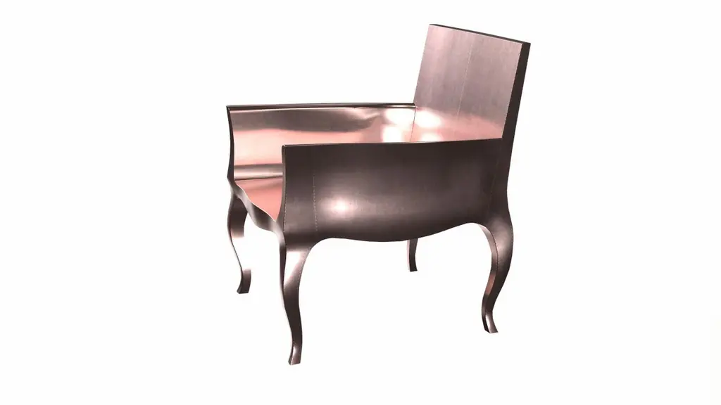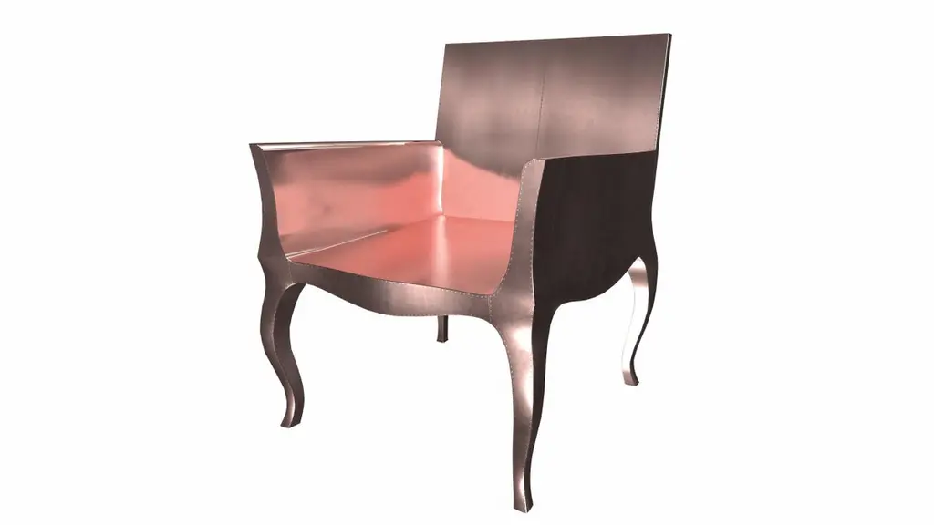 Introducing the Art Deco Chairs, a stunning Art Deco Chairs set designed by the renowned Paul Mathieu for Stephanie Odegard. This elegant Art Deco Chair duo boasts a unique curved profile that exudes a sophisticated and timeless charm, making it the perfect addition to any modern or classic interior.Crafted with utmost care and attention to detail, these Art Deco Chairs are made to order and are available in twelve metal clad finishes, ensuring that you can choose the perfect one to match your individual style and taste. The use of high-quality materials and expert craftsmanship ensure that each Art Deco Chair is not only beautiful but also a true piece of art.The curved legs and side arms of this Art Deco Chair are hand carved from solid pieces of teak. Pattern makers trace and cut complex forms that will cover the chair in a skin of copper, white bronze, brass or antiqued white bronze The metal finishes will tarnish over time. Regular non-abrasive household metal polishes can be used to restore the original luster.Overall, if you're looking for a piece of furniture that combines luxury, comfort, and style, then the Art Deco Chairs is an excellent choice. With its distinctive curved profile and multiple finish options, this Chair set is sure to elevate the look of any room it is placed in, and be a beloved addition to your home for years to come.The images shown in this listing are shot in different lighting conditions and/or are 3D illustrations. We encourage our customers to please request a sample or a full sample set of 12 finishes so that they can experience the finish first hand. Art Deco Dining Chairs Smooth Copper by Paul Mathieu for S. OdegardSize- 26"x 27"x 33"HMaterials - Copper, Metal sheet, Teak, Wood, MetalTechniques: Hand-Crafted, Hand-Carved, Metal Work, Wood Work, Metal Wrapping, PolishedPlease note that moisture in air, sudden change in temperature and natural movement of wood over time causes the metal to wrinkle or bubble up. We use well seasoned, reclaimed teak and high quality marine grade MDF (wherever technically possible) to avoid and delay the mentioned changes. However a perfect stability of metal cannot be guaranteed. Please note that our smooth finish metal clad pieces will have some unavoidable tool marks. This is proof that everything is done by hand. The smooth finish will not come out like a machine made perfect surface and the master artisan will do their best to make it look as good/clean/stable/perfect as he possibly can.The antique white bronze finish is hand done by using an acidic chemical over the white bronze finish to recreate a natural patination. Like with the natural patination of silver, copper, or brass, the final result and color uniformity of the patina cannot be guaranteed. The goal of this finish is to achieve rainbow-like shades with dull, shiny, cloudy, and streaky patches to give an illusion of antiquing. Please note:None of our metal clad pieces are treated with a protective “finish” thus enabling the items to age naturally over time. We will of course polish them well before we pack them. a) Copper oxidizes faster than the other metals. In six to twelve months it will most likely lose its shine and will gradually turn to different shades of brown and/or green/blue. This aging process and its effect is referred to as verdigris. After a year the piece should not change much more. Copper does not rust, but does require periodic cleaning in order to retain its original shine if that the preferred option. ('BRASSO' or any known copper polish can be used to polish copper).b) Brass retains its shine for far longer than others, but will tarnish if not cleaned on occasion. ('BRASSO' is made to polish brass).c) White bronze, has the least tendency to show age or tarnish. If kept in a controlled climate, this metal will hold its shine for years. It can be cleaned with a cleanser and polished with a cloth. d) The antiqued white bronze finish will react with the natural elements the fastest in the beginning but it too will stop reacting and will settle down in a stable state like copper after 6-12 months. Since it is already antiqued and looked like it is tarnished, as described in an earlier message, this fast reaction will not change the over all look. In that way this surface is most forgiving. The images shown in this listing are shot in different lighting conditions and/or are 3D illustrations. We encourage our customers to please request a sample or a full sample set of 12 finishes so that they can experience the finish first hand.