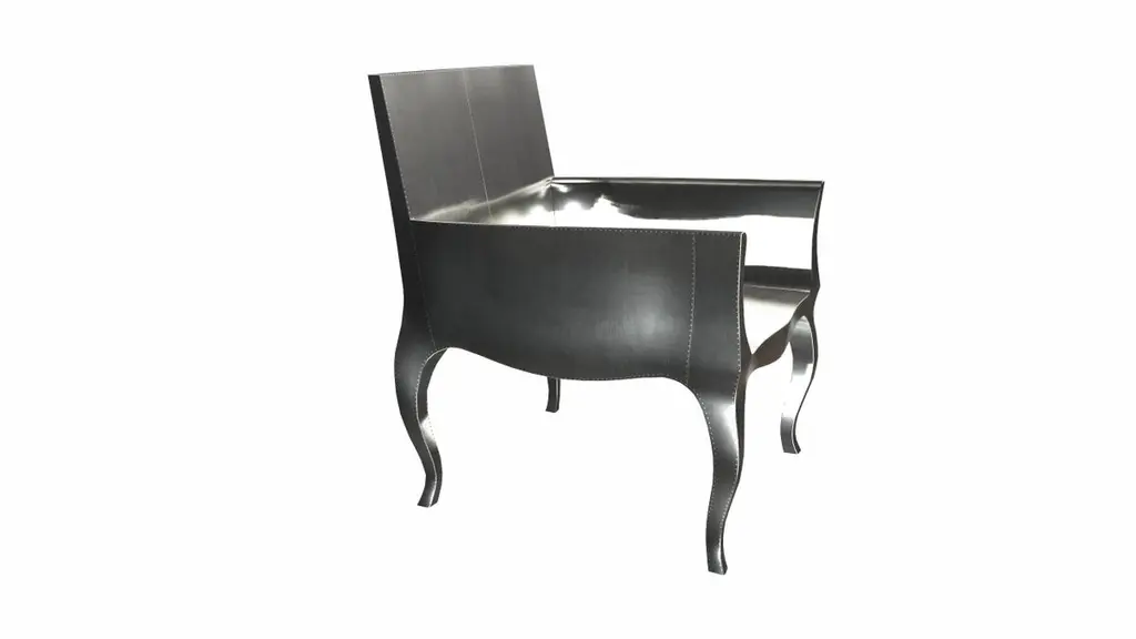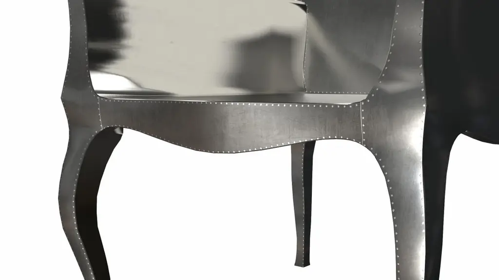 Introducing the Art Deco Chairs, a stunning Art Deco Chairs set designed by the renowned Paul Mathieu for Stephanie Odegard. This elegant Art Deco Chair duo boasts a unique curved profile that exudes a sophisticated and timeless charm, making it the perfect addition to any modern or classic interior.Crafted with utmost care and attention to detail, these Art Deco Chairs are made to order and are available in twelve metal clad finishes, ensuring that you can choose the perfect one to match your individual style and taste. The use of high-quality materials and expert craftsmanship ensure that each Art Deco Chair is not only beautiful but also a true piece of art.The curved legs and side arms of this Art Deco Chair are hand carved from solid pieces of teak. Pattern makers trace and cut complex forms that will cover the chair in a skin of copper, white bronze, brass or antiqued white bronze The metal finishes will tarnish over time. Regular non-abrasive household metal polishes can be used to restore the original luster.Overall, if you're looking for a piece of furniture that combines luxury, comfort, and style, then the Art Deco Chairs is an excellent choice. With its distinctive curved profile and multiple finish options, this Chair set is sure to elevate the look of any room it is placed in, and be a beloved addition to your home for years to come.The images shown in this listing are shot in different lighting conditions and/or are 3D illustrations. We encourage our customers to please request a sample or a full sample set of 12 finishes so that they can experience the finish first hand. Art Deco Dining Chairs Designed by Paul Mathieu for Stephanie OdegardSize- 26"x 27"x 33"HMaterials - White Bronze Metal sheet, Teak, Wood, MetalTechniques: Hand-Crafted, Hand-Carved, Metal Work, Wood Work, Metal Wrapping, PolishedPlease note that moisture in air, sudden change in temperature and natural movement of wood over time causes the metal to wrinkle or bubble up. We use well seasoned, reclaimed teak and high quality marine grade MDF (wherever technically possible) to avoid and delay the mentioned changes. However a perfect stability of metal cannot be guaranteed. Please note that our smooth finish metal clad pieces will have some unavoidable tool marks. This is proof that everything is done by hand. The smooth finish will not come out like a machine made perfect surface and the master artisan will do their best to make it look as good/clean/stable/perfect as he possibly can.The antique white bronze finish is hand done by using an acidic chemical over the white bronze finish to recreate a natural patination. Like with the natural patination of silver, copper, or brass, the final result and color uniformity of the patina cannot be guaranteed. The goal of this finish is to achieve rainbow-like shades with dull, shiny, cloudy, and streaky patches to give an illusion of antiquing. Please note:None of our metal clad pieces are treated with a protective “finish” thus enabling the items to age naturally over time. We will of course polish them well before we pack them. a) Copper oxidizes faster than the other metals. In six to twelve months it will most likely lose its shine and will gradually turn to different shades of brown and/or green/blue. This aging process and its effect is referred to as verdigris. After a year the piece should not change much more. Copper does not rust, but does require periodic cleaning in order to retain its original shine if that the preferred option. ('BRASSO' or any known copper polish can be used to polish copper).b) Brass retains its shine for far longer than others, but will tarnish if not cleaned on occasion. ('BRASSO' is made to polish brass).c) White bronze, has the least tendency to show age or tarnish. If kept in a controlled climate, this metal will hold its shine for years. It can be cleaned with a cleanser and polished with a cloth. d) The antiqued white bronze finish will react with the natural elements the fastest in the beginning but it too will stop reacting and will settle down in a stable state like copper after 6-12 months. Since it is already antiqued and looked like it is tarnished, as described in an earlier message, this fast reaction will not change the over all look. In that way this surface is most forgiving. The images shown in this listing are shot in different lighting conditions and/or are 3D illustrations. We encourage our customers to please request a sample or a full sample set of 12 finishes so that they can experience the finish first hand.