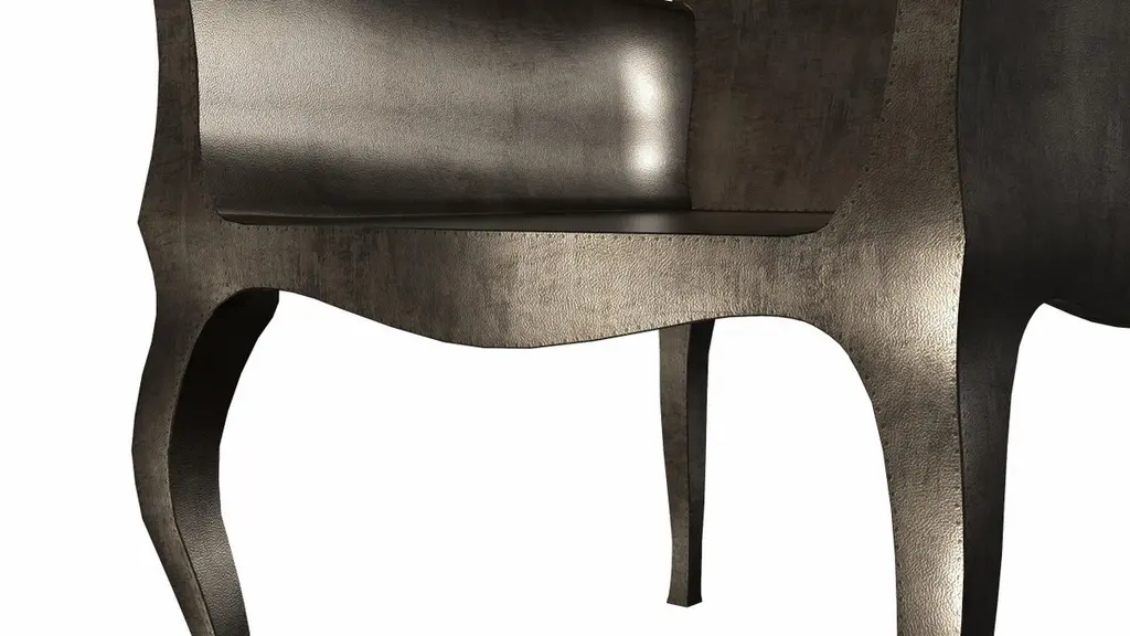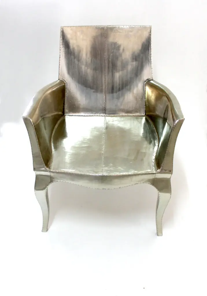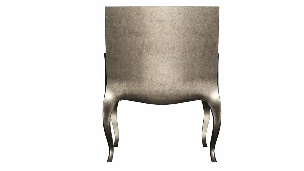 Introducing the Art Deco Chairs, a stunning Art Deco Chairs set designed by the renowned Paul Mathieu for Stephanie Odegard. This elegant Art Deco Chair duo boasts a unique curved profile that exudes a sophisticated and timeless charm, making it the perfect addition to any modern or classic interior.Crafted with utmost care and attention to detail, these Art Deco Chairs are made to order and are available in twelve metal clad finishes, ensuring that you can choose the perfect one to match your individual style and taste. The use of high-quality materials and expert craftsmanship ensure that each Art Deco Chair is not only beautiful but also a true piece of art.The curved legs and side arms of this Art Deco Chair are hand carved from solid pieces of teak. Pattern makers trace and cut complex forms that will cover the chair in a skin of copper, white bronze, brass or antiqued white bronze The metal finishes will tarnish over time. Regular non-abrasive household metal polishes can be used to restore the original luster.Overall, if you're looking for a piece of furniture that combines luxury, comfort, and style, then the Art Deco Chairs is an excellent choice. With its distinctive curved profile and multiple finish options, this Chair set is sure to elevate the look of any room it is placed in, and be a beloved addition to your home for years to come.The images shown in this listing are shot in different lighting conditions and/or are 3D illustrations. We encourage our customers to please request a sample or a full sample set of 12 finishes so that they can experience the finish first hand. Art Deco Dining Room Chairs Fine Hammered in Antique Bronze by Paul Mathieu for Stephanie OdegardSize- 26"x 27"x 33"HMaterials - Antique White Bronze Metal sheet, Teak, Wood, MetalTechniques: Hand-Crafted, Hand-Carved, Metal Work, Wood Work, Metal Wrapping, PolishedPlease note that moisture in air, sudden change in temperature and natural movement of wood over time causes the metal to wrinkle or bubble up. We use well seasoned, reclaimed teak and high quality marine grade MDF (wherever technically possible) to avoid and delay the mentioned changes. However a perfect stability of metal cannot be guaranteed. Please note that our smooth finish metal clad pieces will have some unavoidable tool marks. This is proof that everything is done by hand. The smooth finish will not come out like a machine made perfect surface and the master artisan will do their best to make it look as good/clean/stable/perfect as he possibly can.The antique white bronze finish is hand done by using an acidic chemical over the white bronze finish to recreate a natural patination. Like with the natural patination of silver, copper, or brass, the final result and color uniformity of the patina cannot be guaranteed. The goal of this finish is to achieve rainbow-like shades with dull, shiny, cloudy, and streaky patches to give an illusion of antiquing. Please note:None of our metal clad pieces are treated with a protective “finish” thus enabling the items to age naturally over time. We will of course polish them well before we pack them. a) Copper oxidizes faster than the other metals. In six to twelve months it will most likely lose its shine and will gradually turn to different shades of brown and/or green/blue. This aging process and its effect is referred to as verdigris. After a year the piece should not change much more. Copper does not rust, but does require periodic cleaning in order to retain its original shine if that the preferred option. ('BRASSO' or any known copper polish can be used to polish copper).b) Brass retains its shine for far longer than others, but will tarnish if not cleaned on occasion. ('BRASSO' is made to polish brass).c) White bronze, has the least tendency to show age or tarnish. If kept in a controlled climate, this metal will hold its shine for years. It can be cleaned with a cleanser and polished with a cloth. d) The antiqued white bronze finish will react with the natural elements the fastest in the beginning but it too will stop reacting and will settle down in a stable state like copper after 6-12 months. Since it is already antiqued and looked like it is tarnished, as described in an earlier message, this fast reaction will not change the over all look. In that way this surface is most forgiving. The images shown in this listing are shot in different lighting conditions and/or are 3D illustrations. We encourage our customers to please request a sample or a full sample set of 12 finishes so that they can experience the finish first hand.