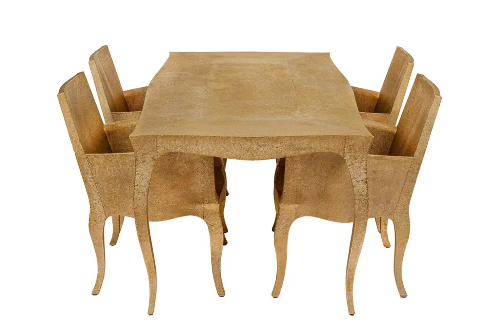 Introducing the Art Deco Chairs, a stunning Art Deco Chairs set designed by the renowned Paul Mathieu for Stephanie Odegard. This elegant Art Deco Chair duo boasts a unique curved profile that exudes a sophisticated and timeless charm, making it the perfect addition to any modern or classic interior.Crafted with utmost care and attention to detail, these Art Deco Chairs are made to order and are available in twelve metal clad finishes, ensuring that you can choose the perfect one to match your individual style and taste. The use of high-quality materials and expert craftsmanship ensure that each Art Deco Chair is not only beautiful but also a true piece of art.The curved legs and side arms of this Art Deco Chair are hand carved from solid pieces of teak. Pattern makers trace and cut complex forms that will cover the chair in a skin of copper, white bronze, brass or antiqued white bronze The metal finishes will tarnish over time. Regular non-abrasive household metal polishes can be used to restore the original luster.Overall, if you're looking for a piece of furniture that combines luxury, comfort, and style, then the Art Deco Chairs is an excellent choice. With its distinctive curved profile and multiple finish options, this Chair set is sure to elevate the look of any room it is placed in, and be a beloved addition to your home for years to come.The images shown in this listing are shot in different lighting conditions and/or are 3D illustrations. We encourage our customers to please request a sample or a full sample set of 12 finishes so that they can experience the finish first hand. Art Deco Dining Room Chairs Mid Hammered in Brass by Paul MathieuSize- 26"x 27"x 33"HMaterials - Brass, Metal sheet, Teak, Wood, MetalTechniques: Hand-Crafted, Hand-Carved, Metal Work, Wood Work, Metal Wrapping, PolishedPlease note that moisture in air, sudden change in temperature and natural movement of wood over time causes the metal to wrinkle or bubble up. We use well seasoned, reclaimed teak and high quality marine grade MDF (wherever technically possible) to avoid and delay the mentioned changes. However a perfect stability of metal cannot be guaranteed. Please note that our smooth finish metal clad pieces will have some unavoidable tool marks. This is proof that everything is done by hand. The smooth finish will not come out like a machine made perfect surface and the master artisan will do their best to make it look as good/clean/stable/perfect as he possibly can.The antique white bronze finish is hand done by using an acidic chemical over the white bronze finish to recreate a natural patination. Like with the natural patination of silver, copper, or brass, the final result and color uniformity of the patina cannot be guaranteed. The goal of this finish is to achieve rainbow-like shades with dull, shiny, cloudy, and streaky patches to give an illusion of antiquing. Please note:None of our metal clad pieces are treated with a protective “finish” thus enabling the items to age naturally over time. We will of course polish them well before we pack them. a) Copper oxidizes faster than the other metals. In six to twelve months it will most likely lose its shine and will gradually turn to different shades of brown and/or green/blue. This aging process and its effect is referred to as verdigris. After a year the piece should not change much more. Copper does not rust, but does require periodic cleaning in order to retain its original shine if that the preferred option. ('BRASSO' or any known copper polish can be used to polish copper).b) Brass retains its shine for far longer than others, but will tarnish if not cleaned on occasion. ('BRASSO' is made to polish brass).c) White bronze, has the least tendency to show age or tarnish. If kept in a controlled climate, this metal will hold its shine for years. It can be cleaned with a cleanser and polished with a cloth. d) The antiqued white bronze finish will react with the natural elements the fastest in the beginning but it too will stop reacting and will settle down in a stable state like copper after 6-12 months. Since it is already antiqued and looked like it is tarnished, as described in an earlier message, this fast reaction will not change the over all look. In that way this surface is most forgiving. The images shown in this listing are shot in different lighting conditions and/or are 3D illustrations. We encourage our customers to please request a sample or a full sample set of 12 finishes so that they can experience the finish first hand.
