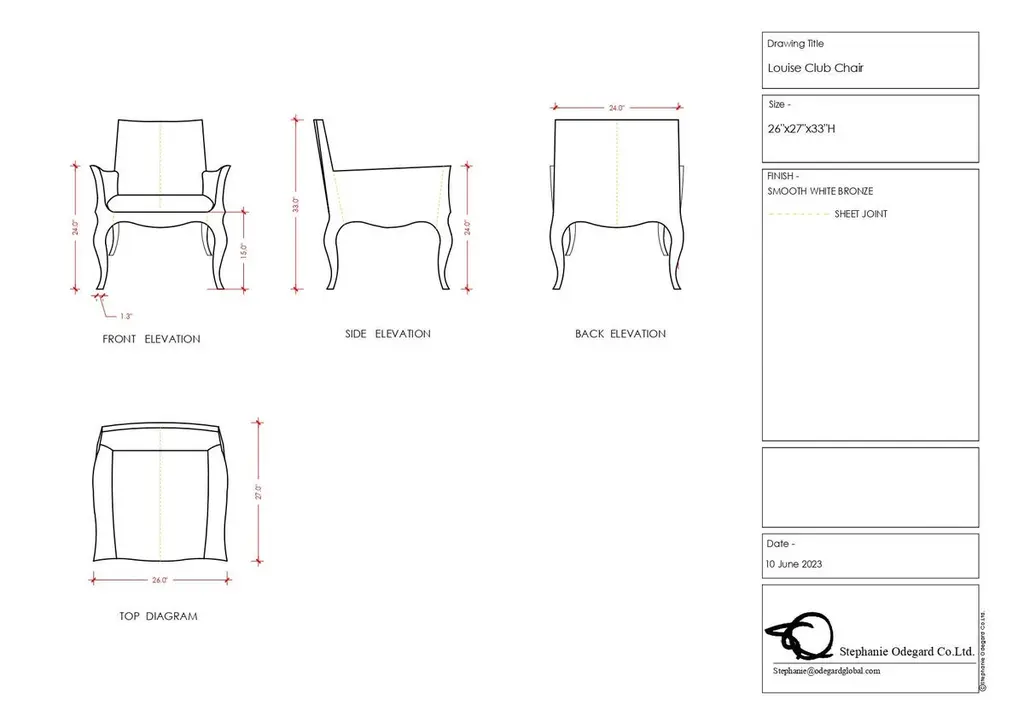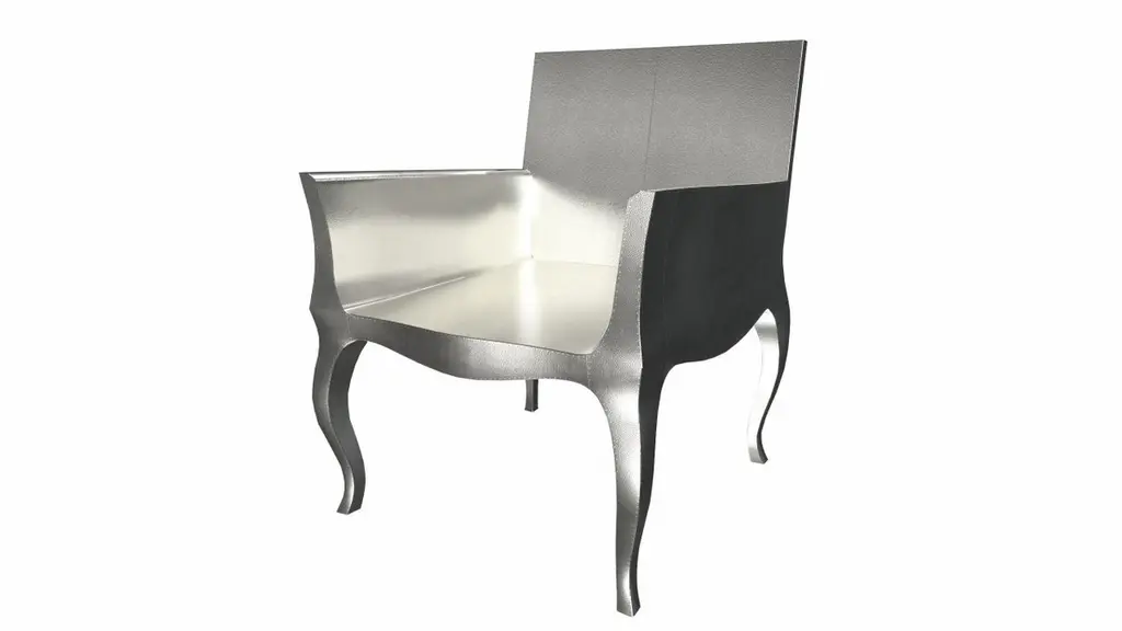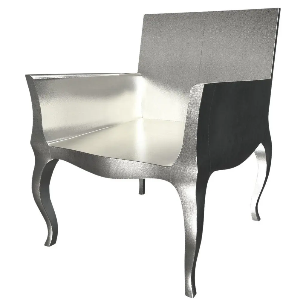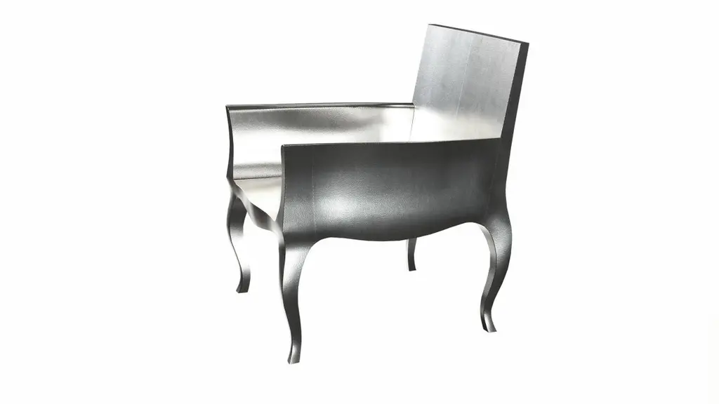 The renowned designer Paul Mathieu chose the name “Louise” when he created his more feminine version of Louis XV (1730-1760) furniture.The characteristic cabriole leg, curving outward at the knee and inward towards the foot in an "S" shape was born during this period. It is during the same era that English furniture makers produced the Queen Anne and Chippendale styles.Introducing the Art Deco Chairs, a stunning Art Deco Chairs set designed by the renowned Paul Mathieu for Stephanie Odegard. This elegant Art Deco Chair duo boasts a unique curved profile that exudes a sophisticated and timeless charm, making it the perfect addition to any modern or classic interior.Crafted with utmost care and attention to detail, these Art Deco Chairs are made to order and are available in twelve metal clad finishes, ensuring that you can choose the perfect one to match your individual style and taste. The use of high-quality materials and expert craftsmanship ensure that each Art Deco Chair is not only beautiful but also a true piece of art.The curved legs and side arms of this Art Deco Chair are hand carved from solid pieces of teak. Pattern makers trace and cut complex forms that will cover the chair in a skin of copper, white bronze, brass or antiqued white bronze. The metal finishes will tarnish over time. Regular non-abrasive household metal polishes can be used to restore the original luster.Overall, if you're looking for a piece of furniture that combines luxury, comfort, and style, then the Art Deco Chairs is an excellent choice. With its distinctive curved profile and multiple finish options, this Chair set is sure to elevate the look of any room it is placed in, and be a beloved addition to your home for years to come.The images shown in this listing are shot in different lighting conditions and/or are 3D illustrations. We encourage our customers to please request a sample or a full sample set of 12 finishes so that they can experience the finish first hand. Art Deco Side Chairs Designed by Paul Mathieu for Stephanie OdegardSize- 26"x 27"x 33"HMaterials - White Bronze Metal sheet, Teak, Wood, MetalTechniques: Hand-Crafted, Hand-Carved, Metal Work, Wood Work, Metal Wrapping, PolishedPlease note that moisture in air, sudden change in temperature and natural movement of wood over time causes the metal to wrinkle or bubble up. We use well seasoned, reclaimed teak and high quality marine grade MDF (wherever technically possible) to avoid and delay the mentioned changes. However a perfect stability of metal cannot be guaranteed. Please note that our smooth finish metal clad pieces will have some unavoidable tool marks. This is proof that everything is done by hand. The smooth finish will not come out like a machine made perfect surface and the master artisan will do their best to make it look as good/clean/stable/perfect as he possibly can.Our hammered finishes are a much safer option if the tool mark scratches are unacceptable. The hammered finishes are also safer against eventual bubbling/wrinkles due to natural forces as mentioned above.The antique white bronze finish is hand done by using an acidic chemical over the white bronze finish to recreate a natural patination. Like with the natural patination of silver, copper, or brass, the final result and color uniformity of the patina cannot be guaranteed. The goal of this finish is to achieve rainbow-like shades with dull, shiny, cloudy, and streaky patches to give an illusion of antiquing. Please note:None of our metal clad pieces are treated with a protective “finish” thus enabling the items to age naturally over time. We will of course polish them well before we pack them. a) Copper oxidizes faster than the other metals. In six to twelve months it will most likely lose its shine and will gradually turn to different shades of brown and/or green/blue. This aging process and its effect is referred to as verdigris. After a year the piece should not change much more. Copper does not rust, but does require periodic cleaning in order to retain its original shine if that the preferred option. ('BRASSO' or any known copper polish can be used to polish copper).b) Brass retains its shine for far longer than others, but will tarnish if not cleaned on occasion. ('BRASSO' is made to polish brass).c) White bronze, has the least tendency to show age or tarnish. If kept in a controlled climate, this metal will hold its shine for years. It can be cleaned with a cleanser and polished with a cloth. d) The antiqued white bronze finish will react with the natural elements the fastest in the beginning but it too will stop reacting and will settle down in a stable state like copper after 6-12 months. Since it is already antiqued and looked like it is tarnished, as described in an earlier message, this fast reaction will not change the over all look. In that way this surface is most forgiving. The images shown in this listing are shot in different lighting conditions and/or are 3D illustrations. We encourage our customers to please request a sample or a full sample set of 12 finishes so that they can experience the finish first hand.