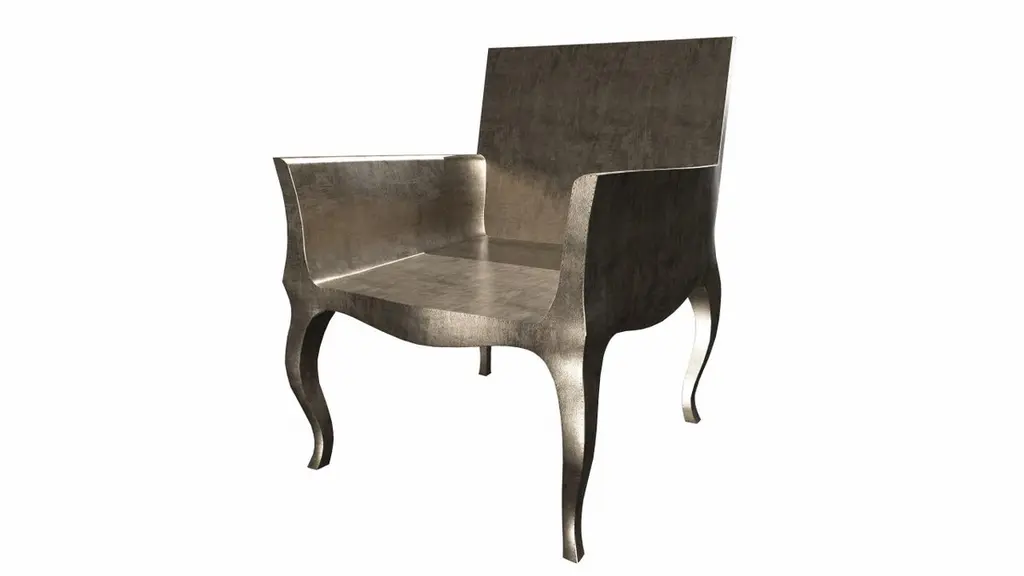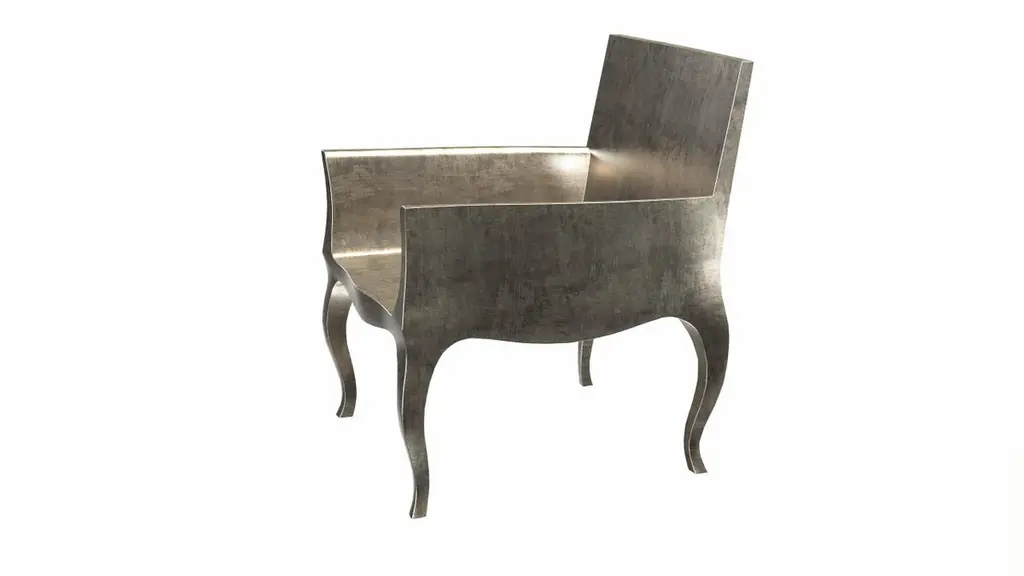Introducing the Art Deco Chairs, a stunning Art Deco Chairs set designed by the renowned Paul Mathieu for Stephanie Odegard. This elegant Art Deco Chair duo boasts a unique curved profile that exudes a sophisticated and timeless charm, making it the perfect addition to any modern or classic interior.Crafted with utmost care and attention to detail, these Art Deco Chairs are made to order and are available in twelve metal clad finishes, ensuring that you can choose the perfect one to match your individual style and taste. The use of high-quality materials and expert craftsmanship ensure that each Art Deco Chair is not only beautiful but also a true piece of art.The curved legs and side arms of this Art Deco Chair are hand carved from solid pieces of teak. Pattern makers trace and cut complex forms that will cover the chair in a skin of copper, white bronze, brass or antiqued white bronze The metal finishes will tarnish over time. Regular non-abrasive household metal polishes can be used to restore the original luster.Overall, if you're looking for a piece of furniture that combines luxury, comfort, and style, then the Art Deco Chairs is an excellent choice. With its distinctive curved profile and multiple finish options, this Chair set is sure to elevate the look of any room it is placed in, and be a beloved addition to your home for years to come.The images shown in this listing are shot in different lighting conditions and/or are 3D illustrations. We encourage our customers to please request a sample or a full sample set of 12 finishes so that they can experience the finish first hand. Art Nouveau Dining Chairs Fine Hammered in Antique Bronze by Paul Mathieu for Stephanie OdegardSize- 26"x 27"x 33"HMaterials - Antique White Bronze Metal sheet, Teak, Wood, MetalTechniques: Hand-Crafted, Hand-Carved, Metal Work, Wood Work, Metal Wrapping, PolishedPlease note that moisture in air, sudden change in temperature and natural movement of wood over time causes the metal to wrinkle or bubble up. We use well seasoned, reclaimed teak and high quality marine grade MDF (wherever technically possible) to avoid and delay the mentioned changes. However a perfect stability of metal cannot be guaranteed. Please note that our smooth finish metal clad pieces will have some unavoidable tool marks. This is proof that everything is done by hand. The smooth finish will not come out like a machine made perfect surface and the master artisan will do their best to make it look as good/clean/stable/perfect as he possibly can.The antique white bronze finish is hand done by using an acidic chemical over the white bronze finish to recreate a natural patination. Like with the natural patination of silver, copper, or brass, the final result and color uniformity of the patina cannot be guaranteed. The goal of this finish is to achieve rainbow-like shades with dull, shiny, cloudy, and streaky patches to give an illusion of antiquing. Please note:None of our metal clad pieces are treated with a protective “finish” thus enabling the items to age naturally over time. We will of course polish them well before we pack them. a) Copper oxidizes faster than the other metals. In six to twelve months it will most likely lose its shine and will gradually turn to different shades of brown and/or green/blue. This aging process and its effect is referred to as verdigris. After a year the piece should not change much more. Copper does not rust, but does require periodic cleaning in order to retain its original shine if that the preferred option. ('BRASSO' or any known copper polish can be used to polish copper).b) Brass retains its shine for far longer than others, but will tarnish if not cleaned on occasion. ('BRASSO' is made to polish brass).c) White bronze, has the least tendency to show age or tarnish. If kept in a controlled climate, this metal will hold its shine for years. It can be cleaned with a cleanser and polished with a cloth. d) The antiqued white bronze finish will react with the natural elements the fastest in the beginning but it too will stop reacting and will settle down in a stable state like copper after 6-12 months. Since it is already antiqued and looked like it is tarnished, as described in an earlier message, this fast reaction will not change the over all look. In that way this surface is most forgiving. The images shown in this listing are shot in different lighting conditions and/or are 3D illustrations. We encourage our customers to please request a sample or a full sample set of 12 finishes so that they can experience the finish first hand.