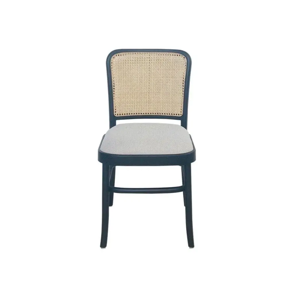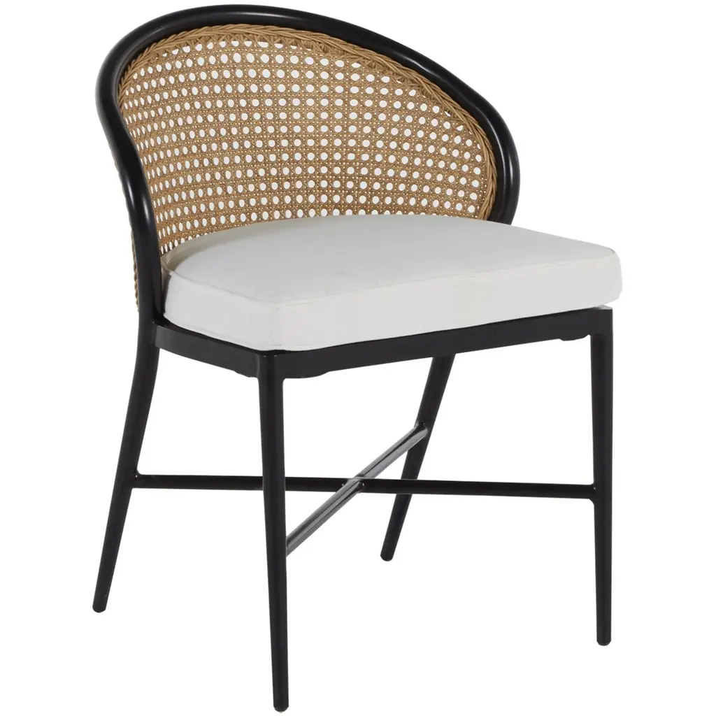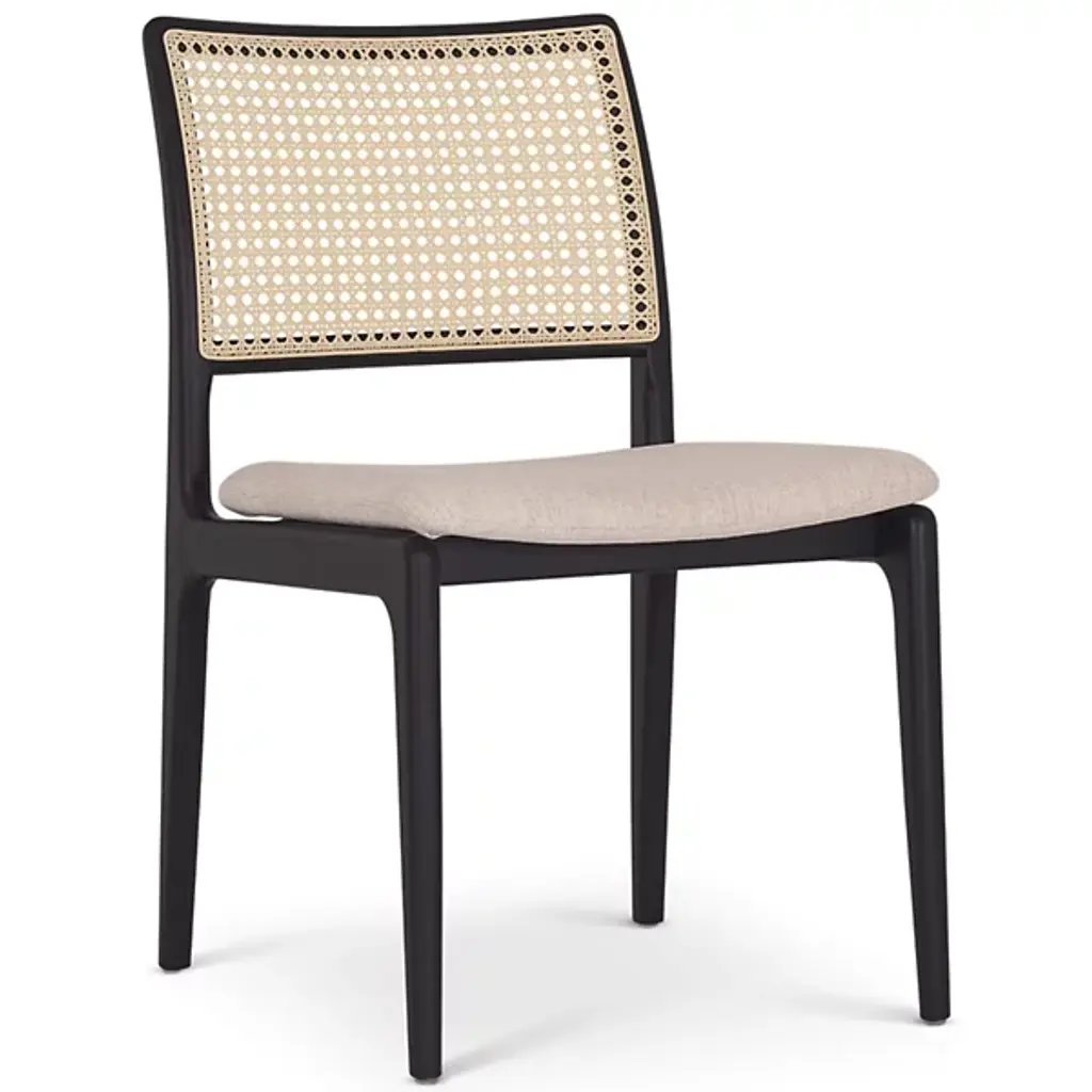 Our Francois Dining Chair in black finish is crafted from solid mindi wood with a satin black finish exudes a blend of sophistication and natural beauty. The dark satin black finish adds a touch of elegance and modernity, complementing the inherent warmth of the wood. The defining feature of this chair is its open rattan back. The natural flexibility of rattan contributes to the ergonomic aspects of the chair, molding slightly to the body's contours for a pleasant seating experience. Artesia Francois Dining Chair Elegant Solid Wood Design Features: Overall Dimensions (WxDxH): 18'' x 20'' x 33'' Materials: Solid Mindi Wood, Rattan Finish: Protective matt lacquer Color: Black Design: Armless, curved back Seat: cushioned seat Backrest: cane Care: Clean with a damp cloth Use: Suitable for indoor use Protection: Clean spills immediately