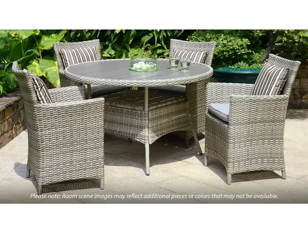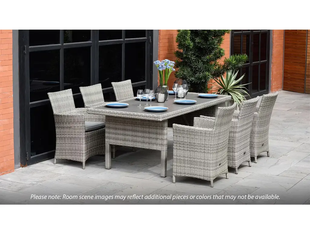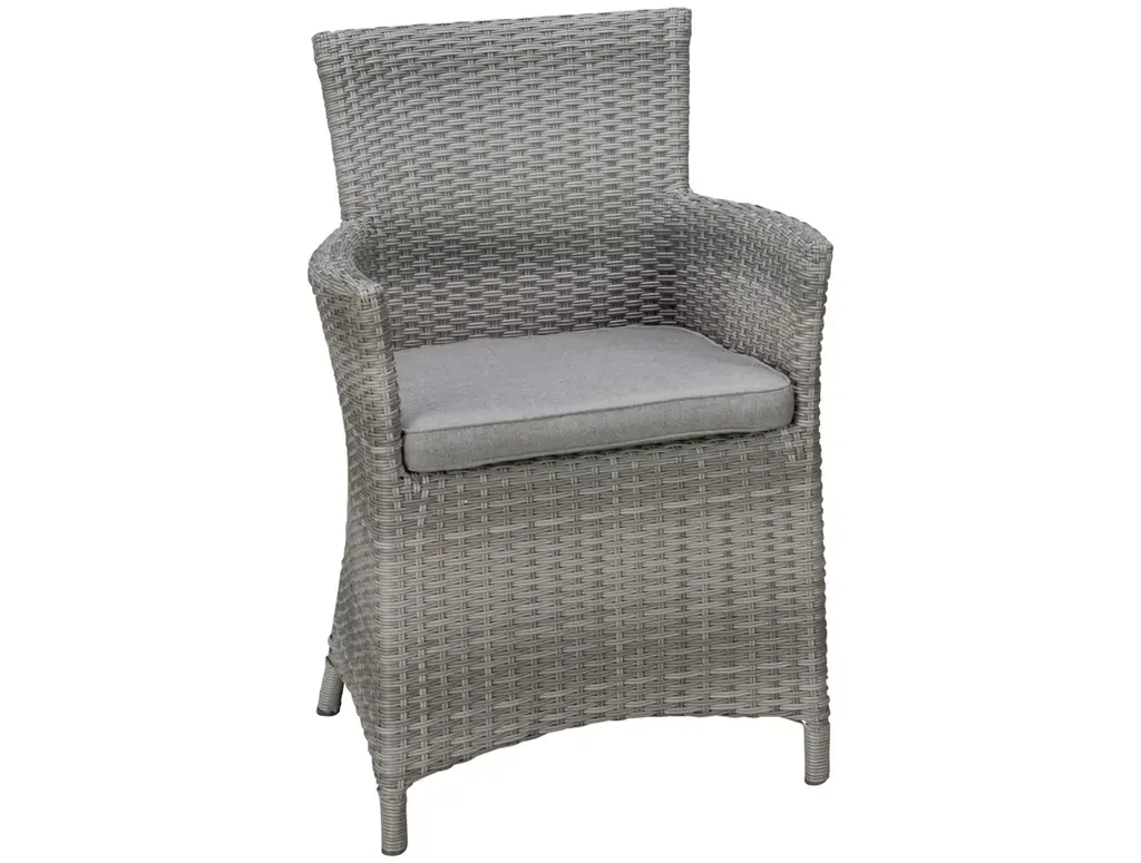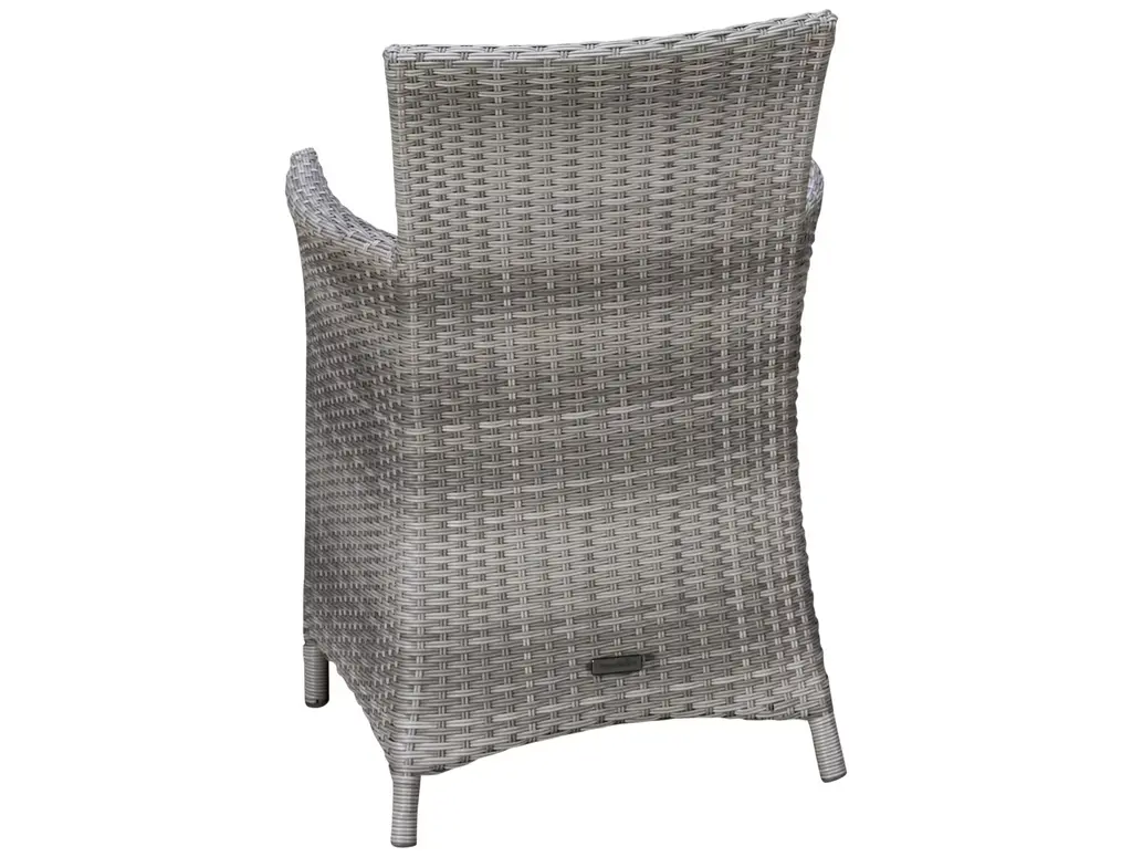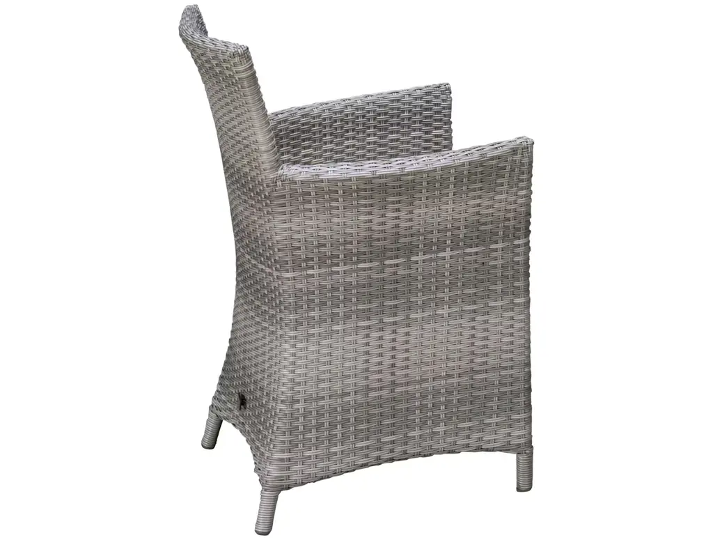 Dine al fresco in your own backyard with the ScanCom Aruba Carver Chair. This outdoor dining chair features a sturdy aluminum frame and durable synthetic wicker topped with an olefin cushion that is made to withstand the elements without compromising style. The light and airy gray finish, along with gently curved armrests, add a dash of modern appeal.