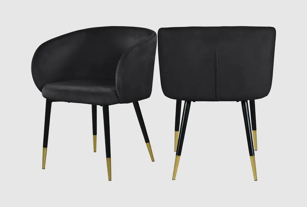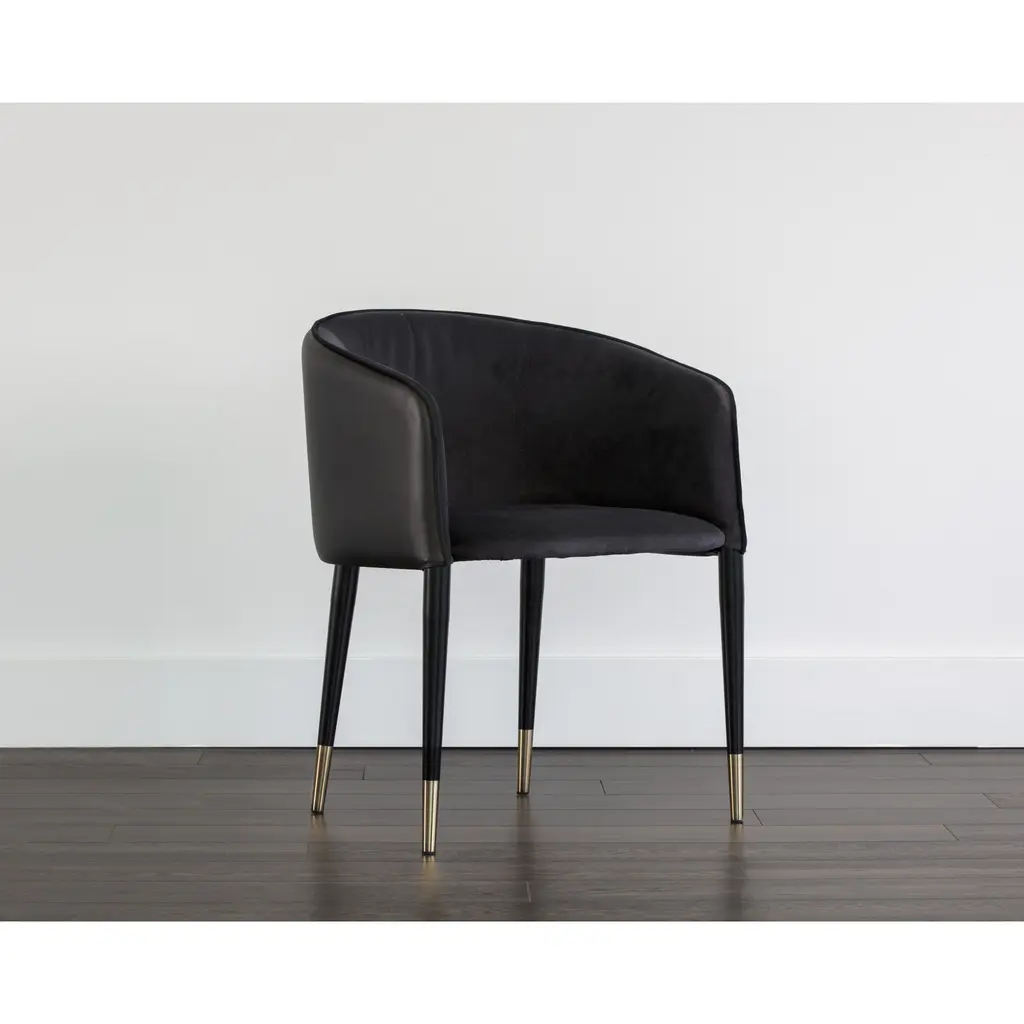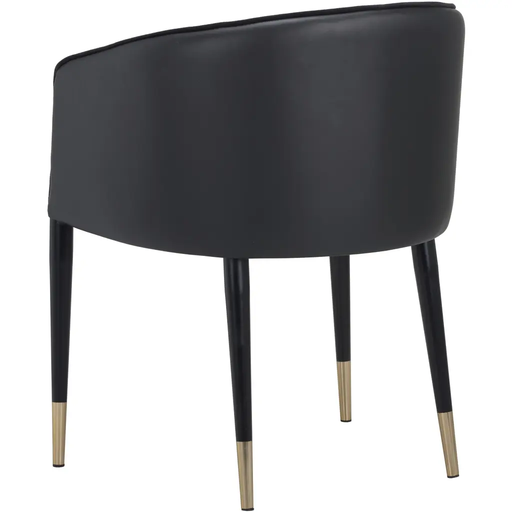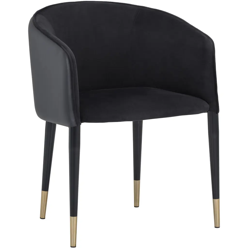 A modern barrel back dining armchair upholstered in abbington black fabric and contrasting napa black faux leather. Finished with black steel legs and brushed gold foot caps. Handle With Care: This design has been crafted with faux leather. Faux leather is manufactured to reflect the natural characteristics of leather as such, colour variations, markings wrinkles, grooves, and light scratches are appreciated characteristics. No two pieces will be alike. Visit our Product Care page for more information on how to ensure the lasting beauty of this piece.