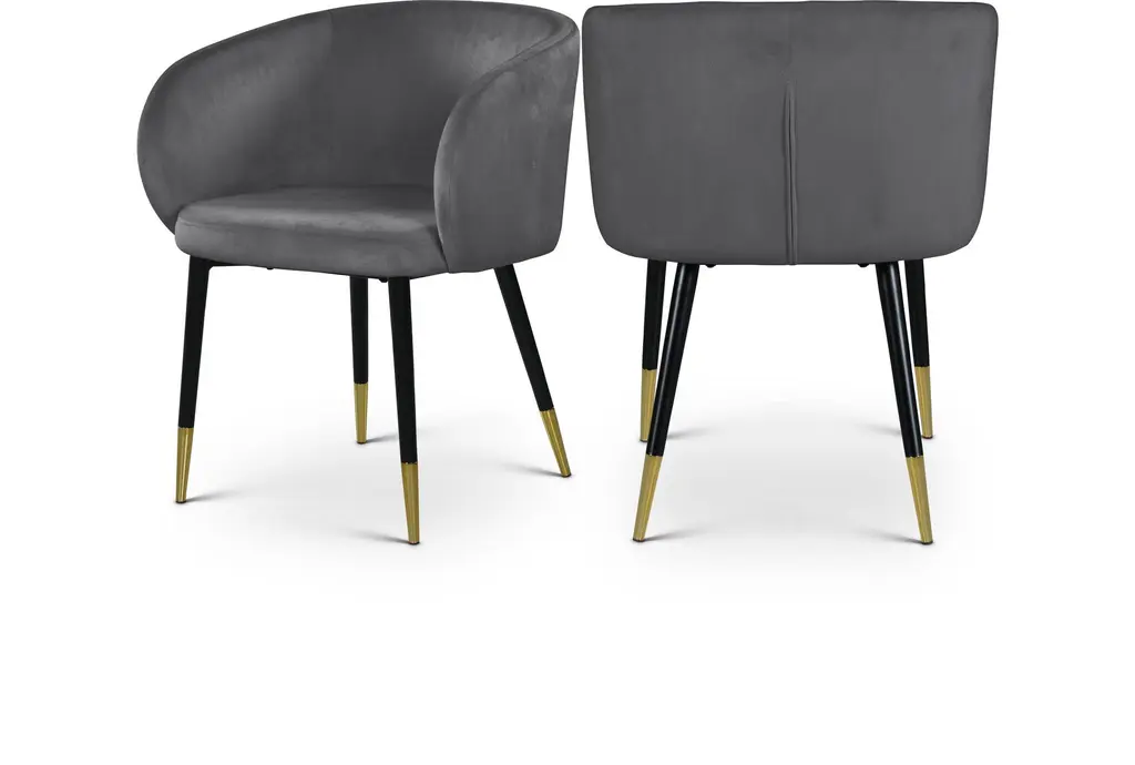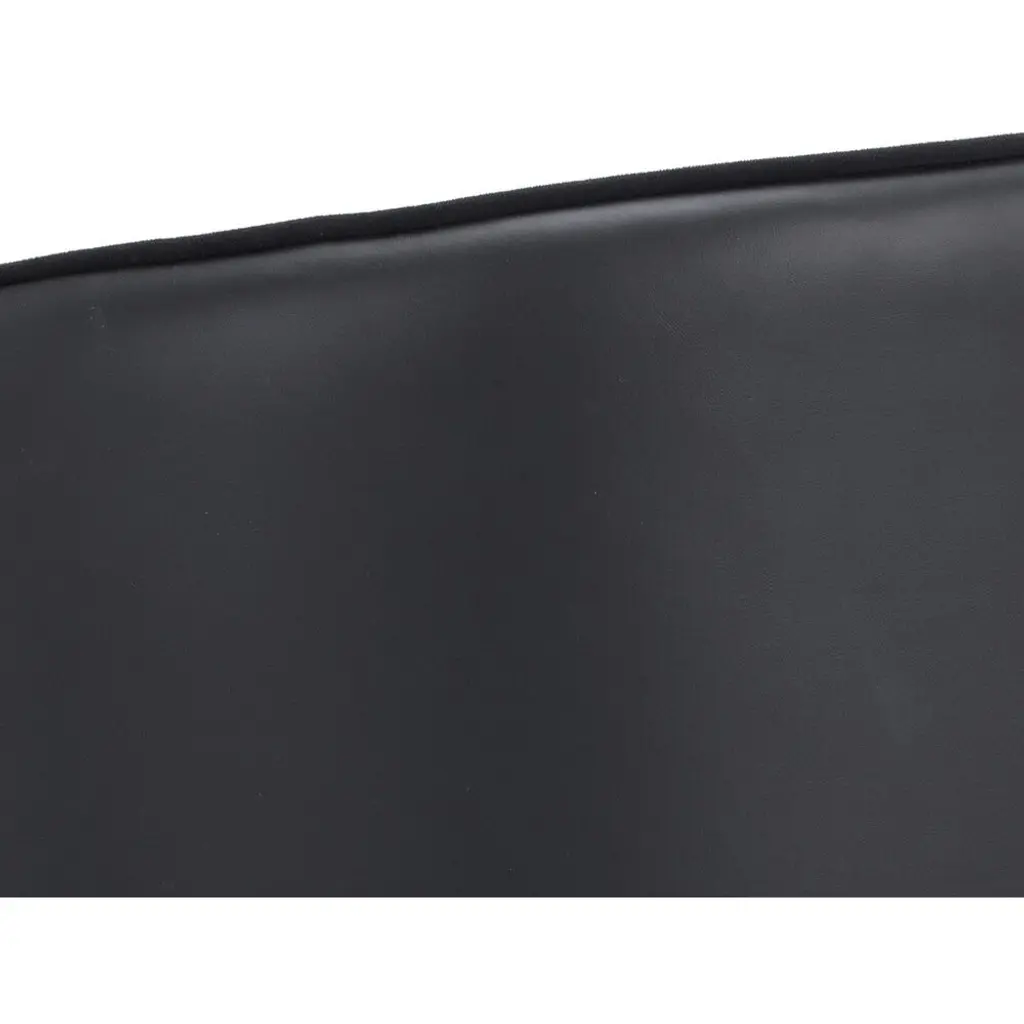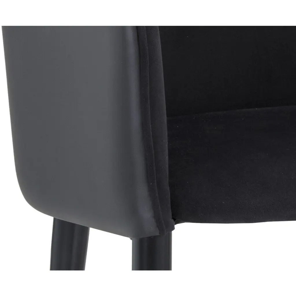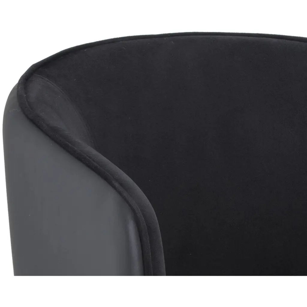 A modern barrel back dining armchair upholstered in abbington black fabric and contrasting napa black faux leather. Finished with black steel legs and brushed gold foot caps. Handle With Care: This design has been crafted with faux leather. Faux leather is manufactured to reflect the natural characteristics of leather as such, colour variations, markings wrinkles, grooves, and light scratches are appreciated characteristics. No two pieces will be alike. Visit our Product Care page for more information on how to ensure the lasting beauty of this piece.
