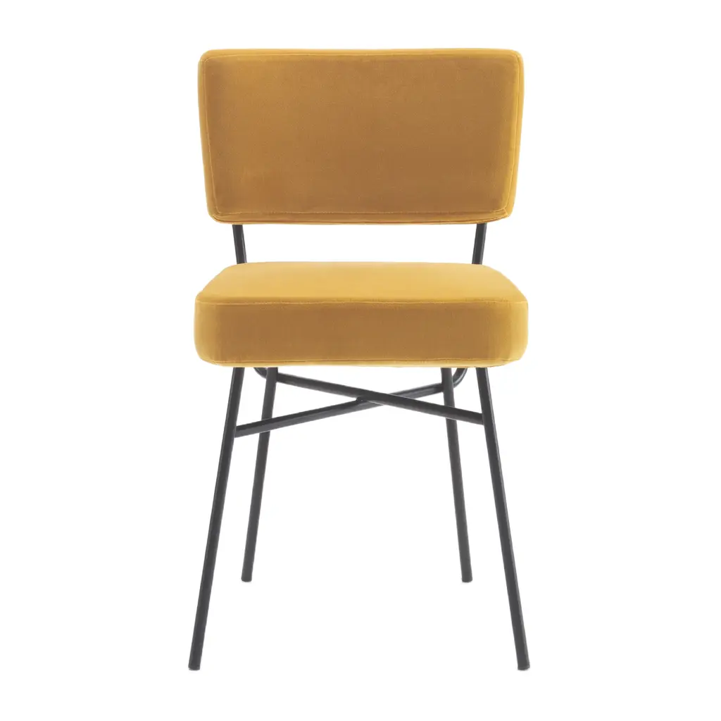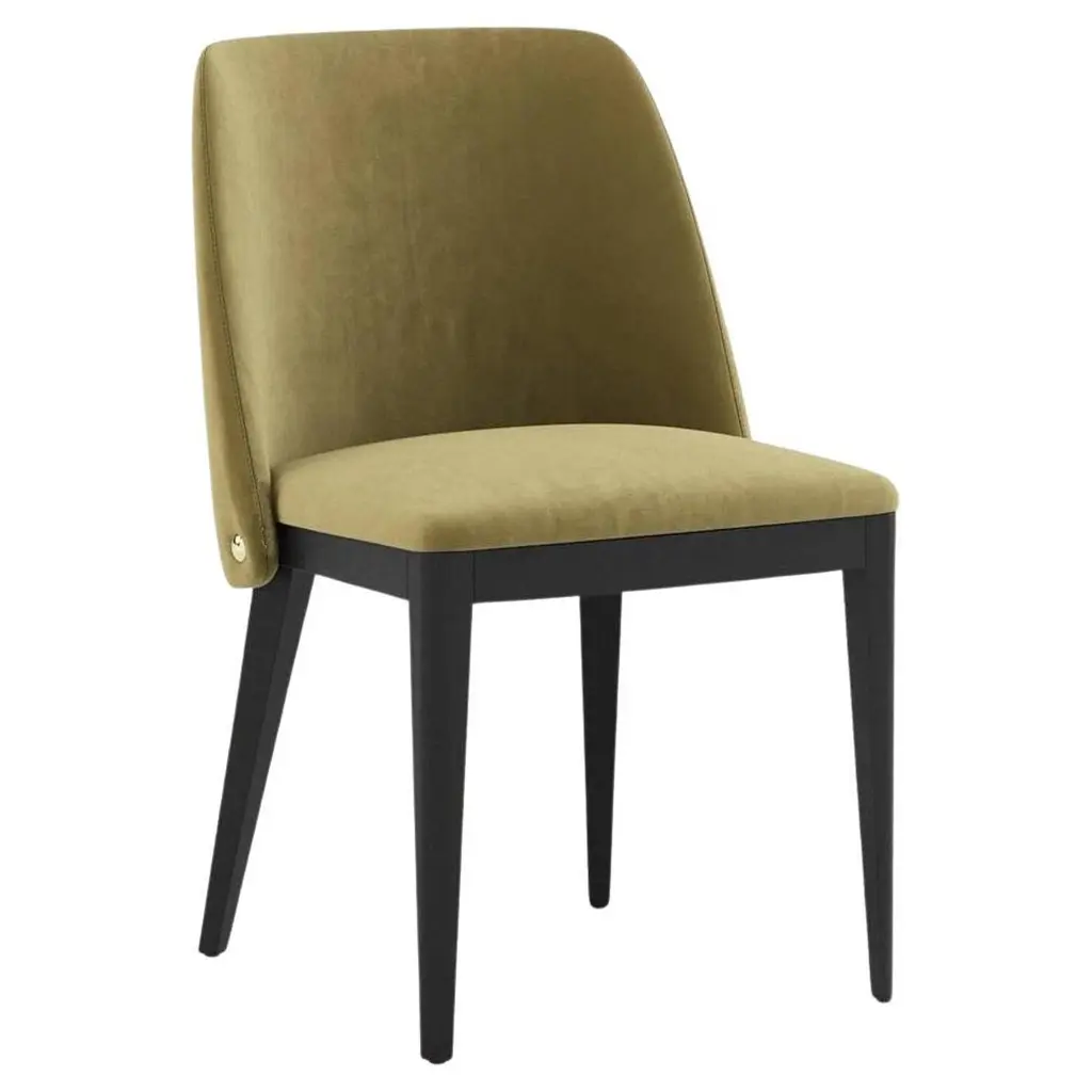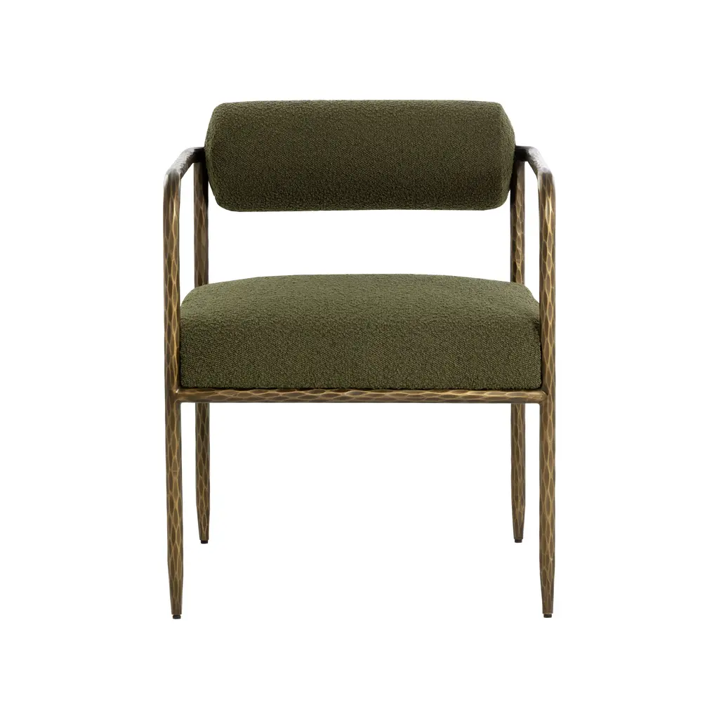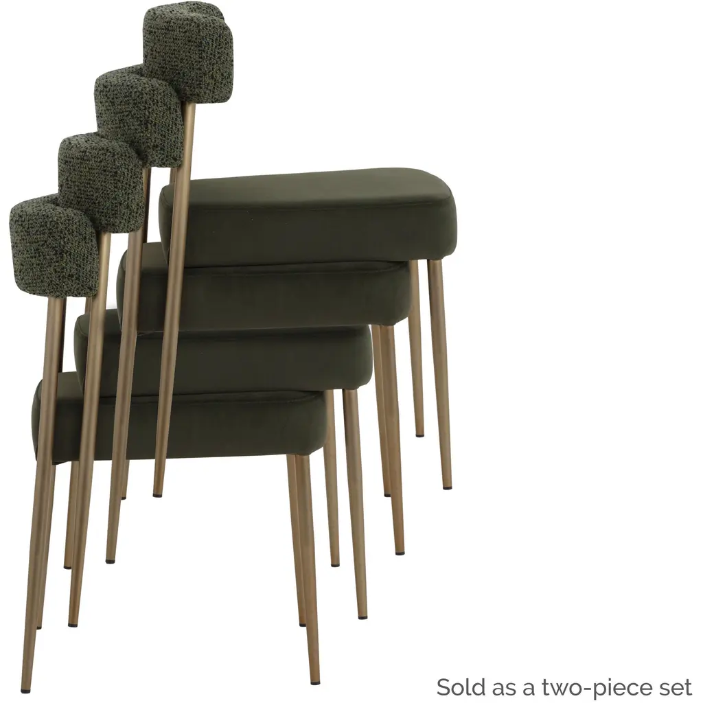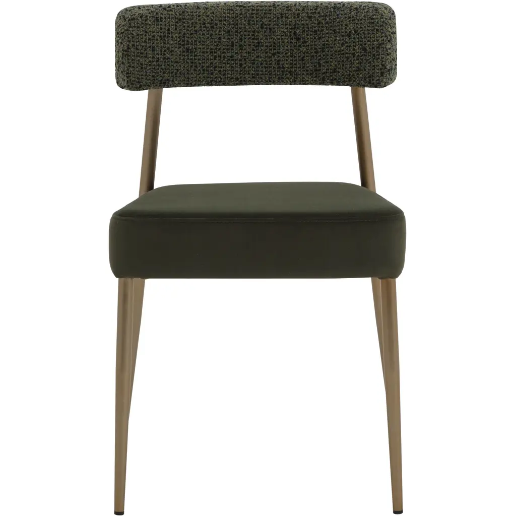 The Ashwin Stackable Dining Chair exudes effortless style with clean functional design. Textured noah meadow fabric on the curved backrest contrasts with the smooth kona backwoods seat for a sophisticated look. A sturdy powder-coated steel frame in a luxe gold finish enhances its modern appeal.