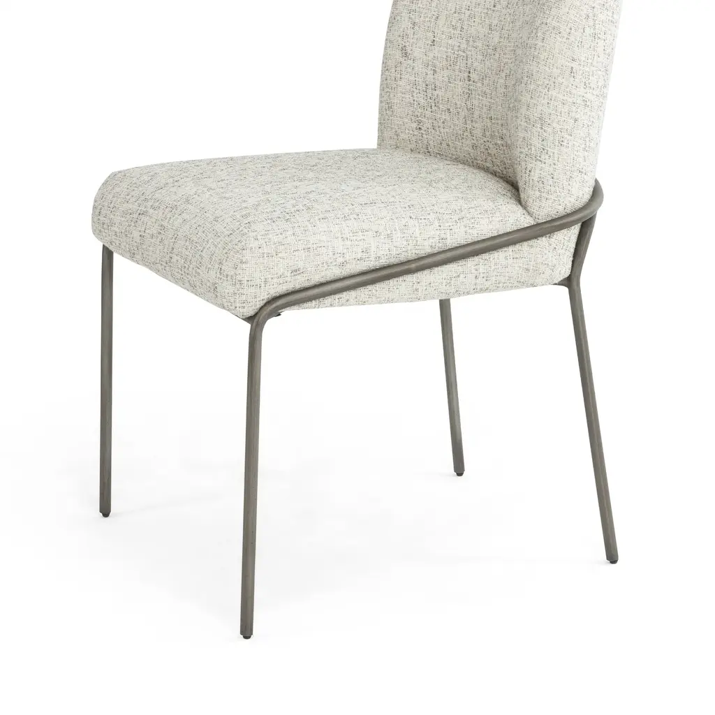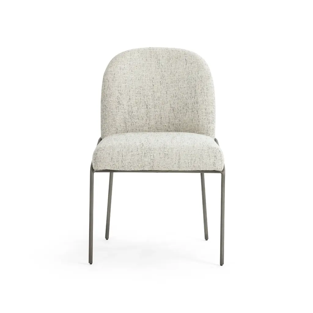 An Art Deco dream. Finely sculpted, scalloped-back dining chair with exclusive performance fabric, faux leather, or top-grain leather pairs with slim, iron tube framing finished in a brushed slate, for a textural, fashion-forward feel with subtle feminine airs.
