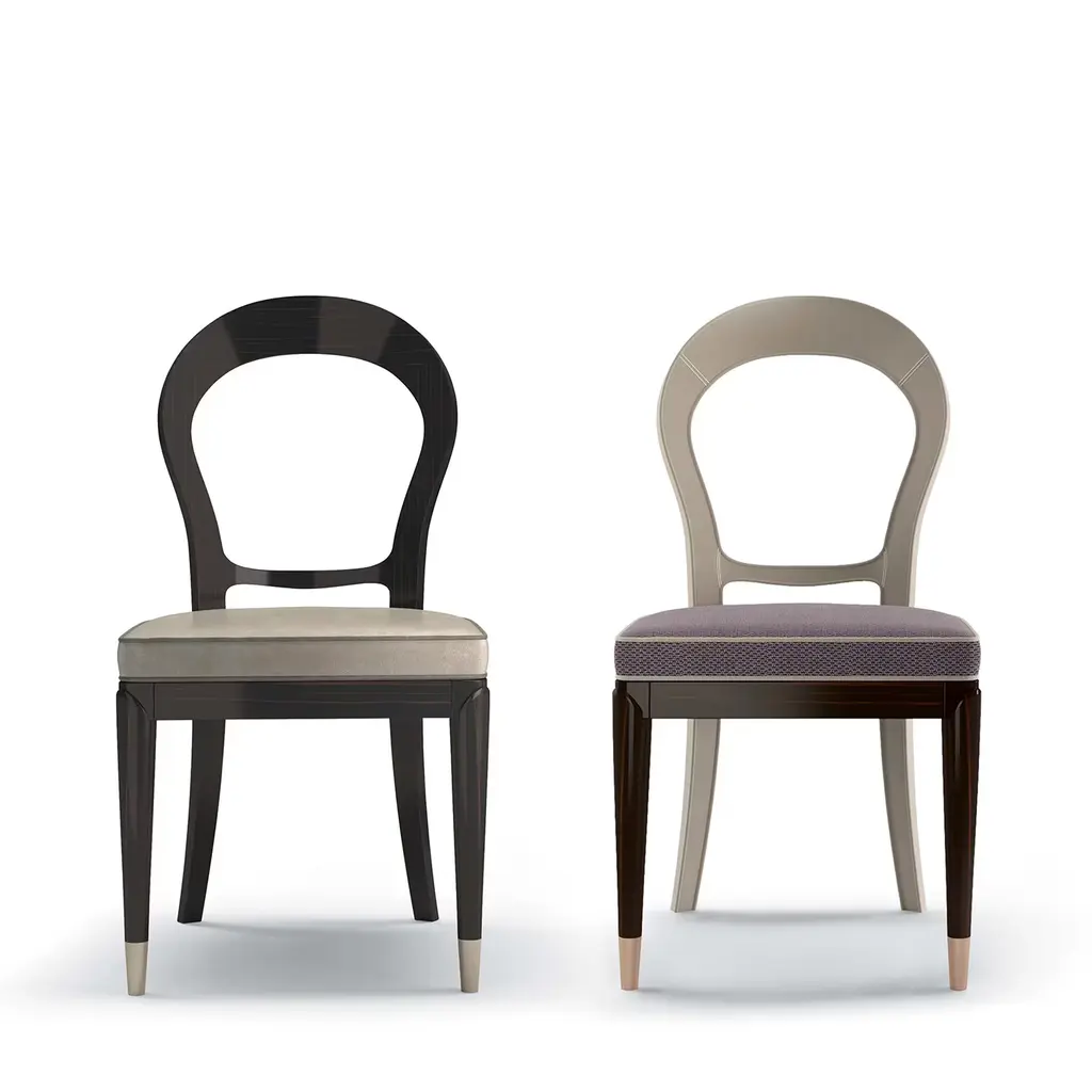 Bold yet understated, this sophisticated chair will complement a minimalist dining or living room decor. Entirely crafted of ebonized wood, the sleek frame is characterized by an open back covered in leather that flows into the sloping, saber legs and a wide square seat supported by two tapered front legs with chromed ferrules. A padded cushion upholstered in a soft white fabric adds an elegant finishing touch to the piece. Best arranged in multiples around a table by the same designer.