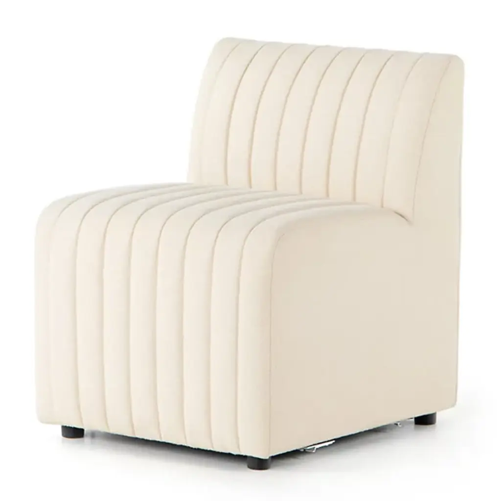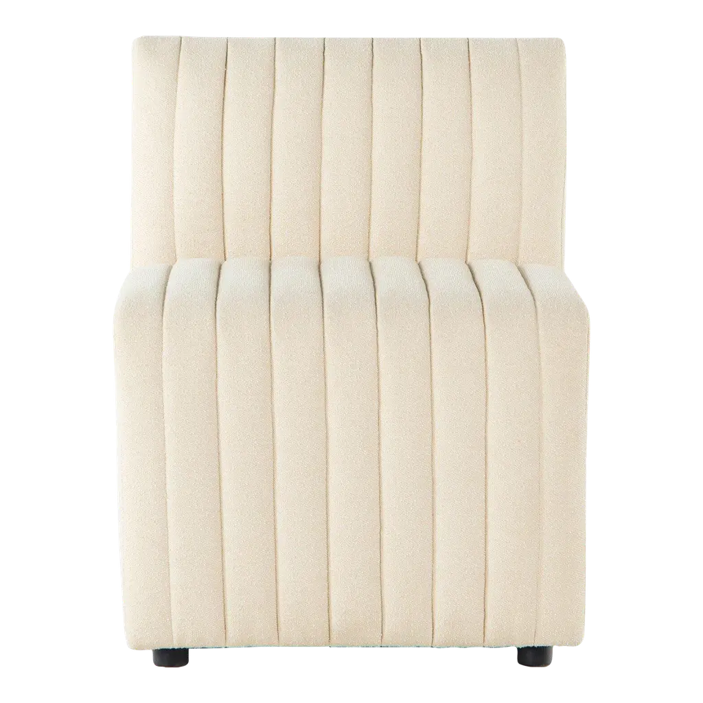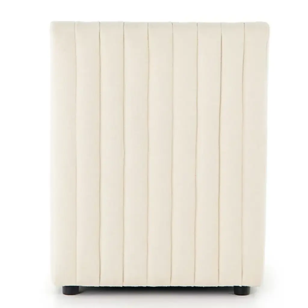 The Augustine Dining Chair from Four Hands combines precise vertical channeling with luxurious comfort. The high-performance fabric provides exceptional durability while maintaining a soft hand feel. Deep channels create dimensional interest across the backrest and seat, while polyurethane foam and polyester fiber filling ensure lasting support for extended dining experiences. The distinctive vertical lines flow continuously from top to bottom, creating a unified design statement.