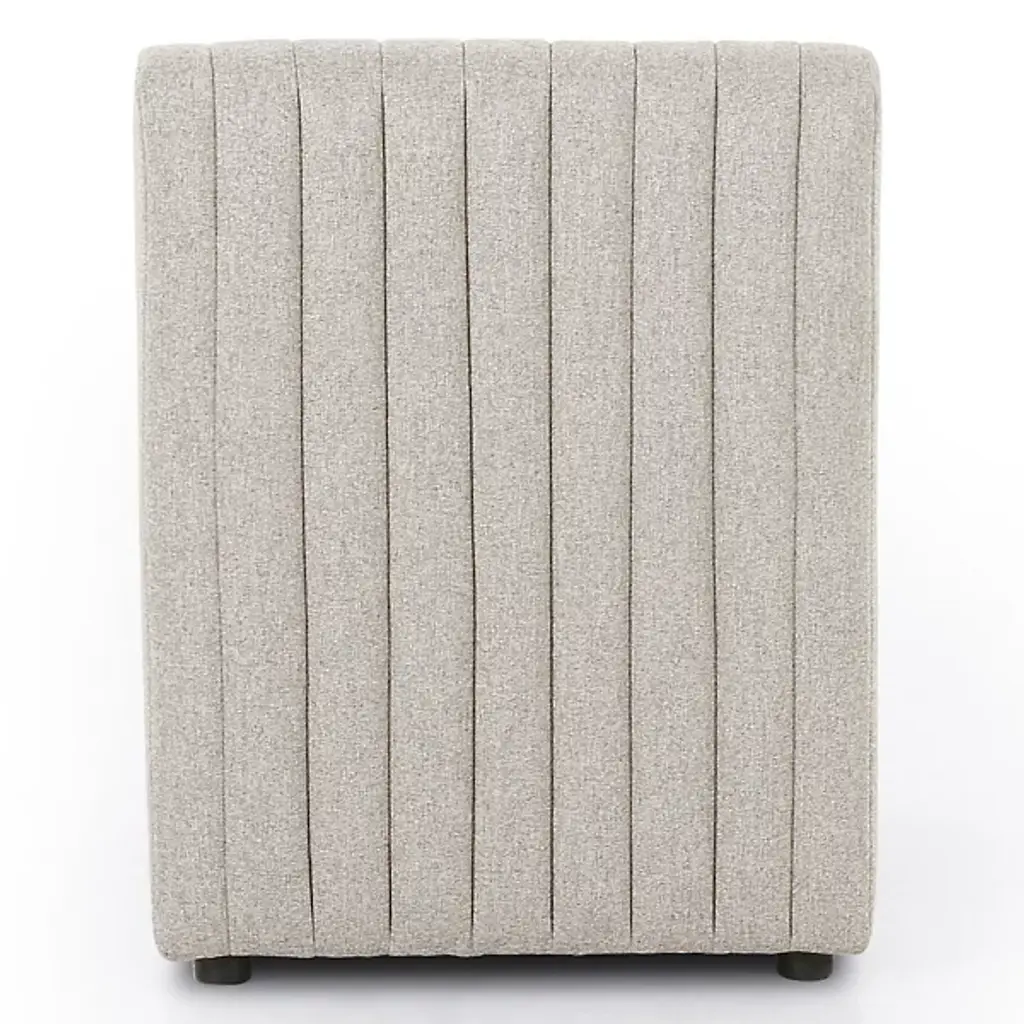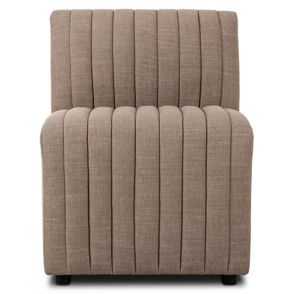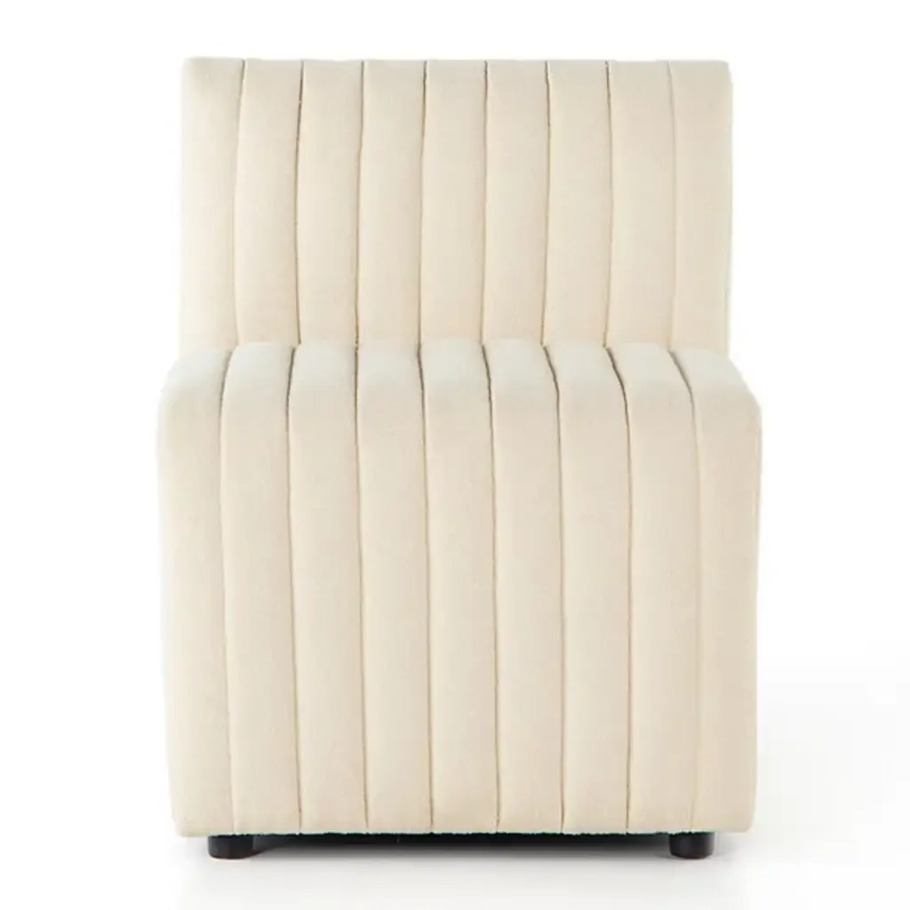 The Augustine Dining Chair from Four Hands combines precise vertical channeling with luxurious comfort. The high-performance fabric provides exceptional durability while maintaining a soft hand feel. Deep channels create dimensional interest across the backrest and seat, while polyurethane foam and polyester fiber filling ensure lasting support for extended dining experiences. The distinctive vertical lines flow continuously from top to bottom, creating a unified design statement.