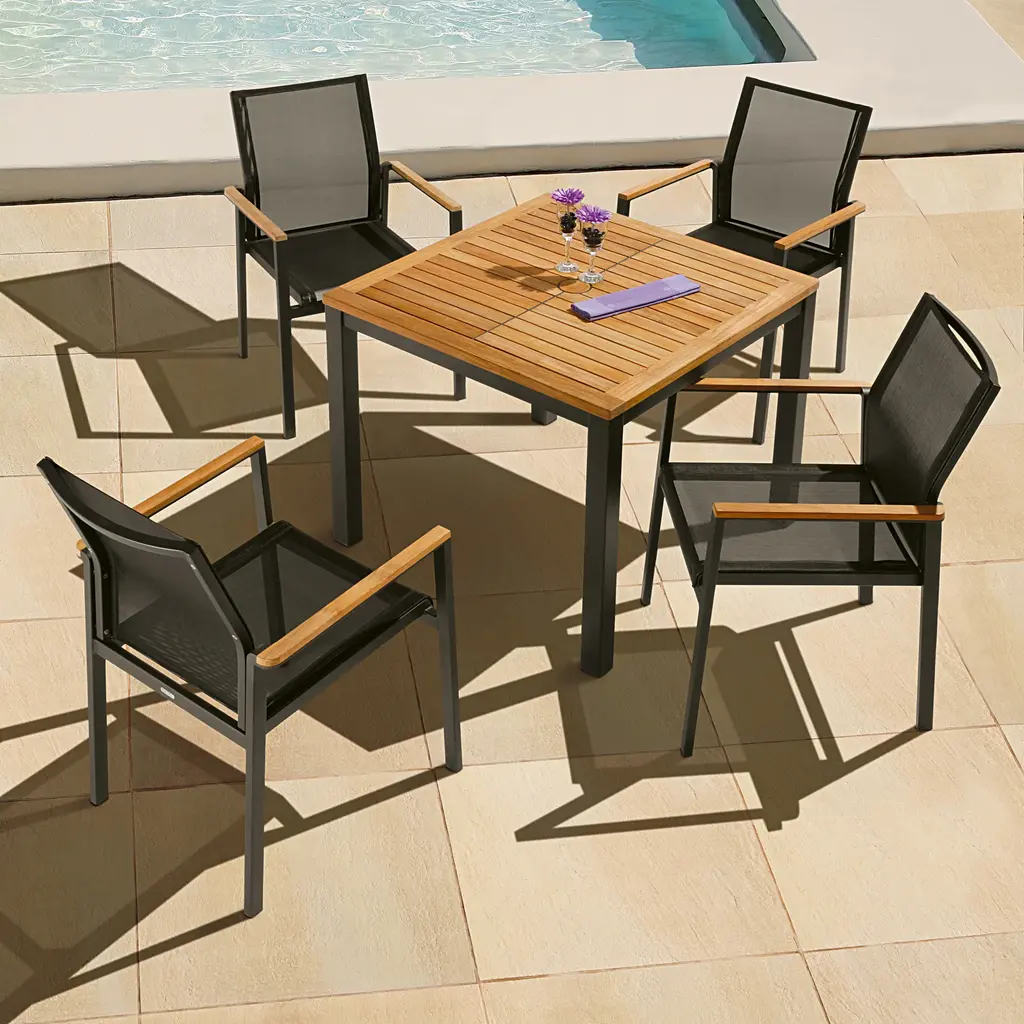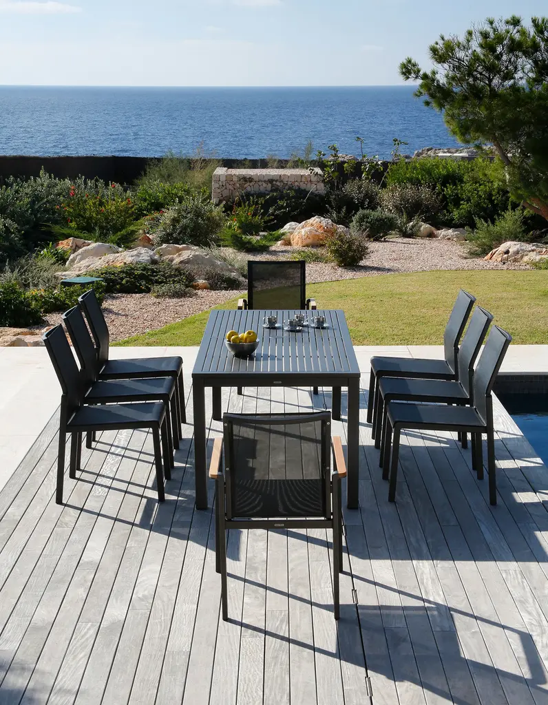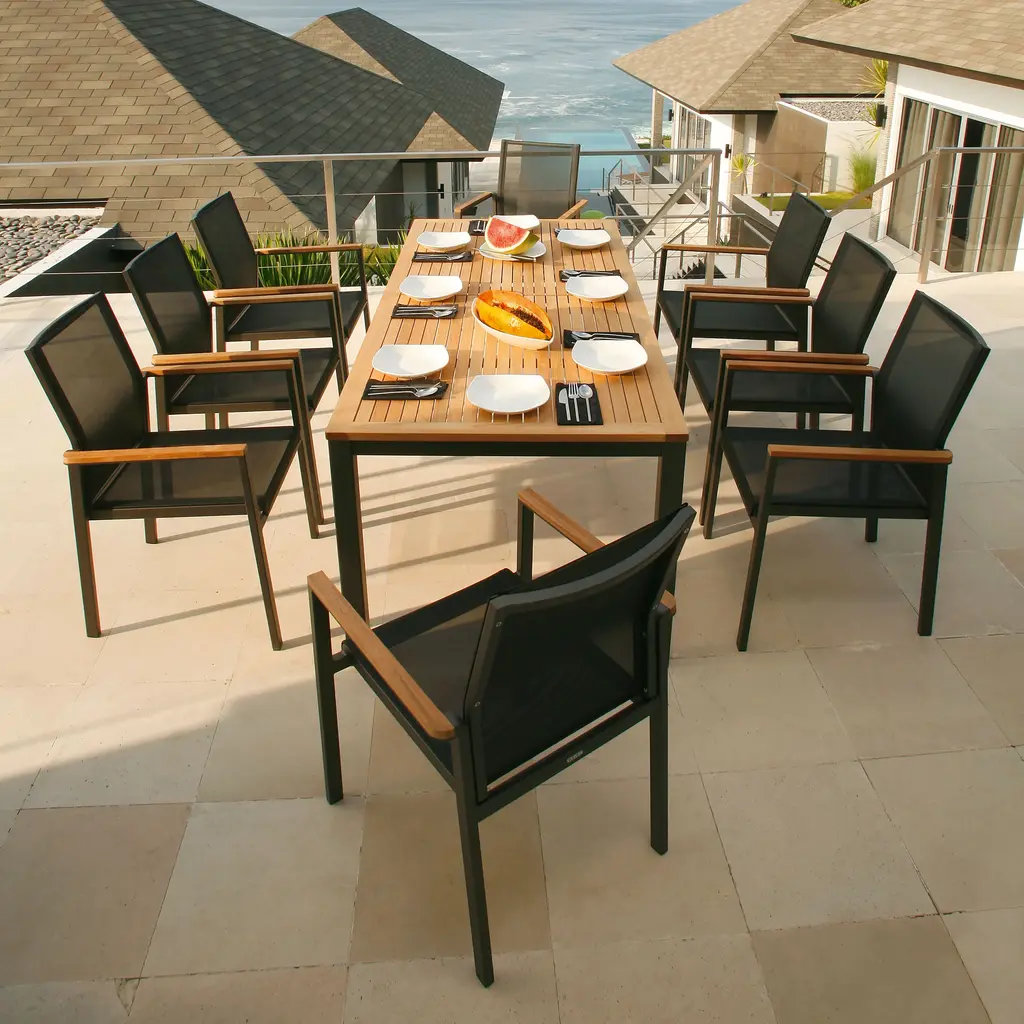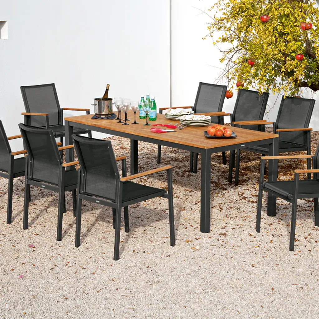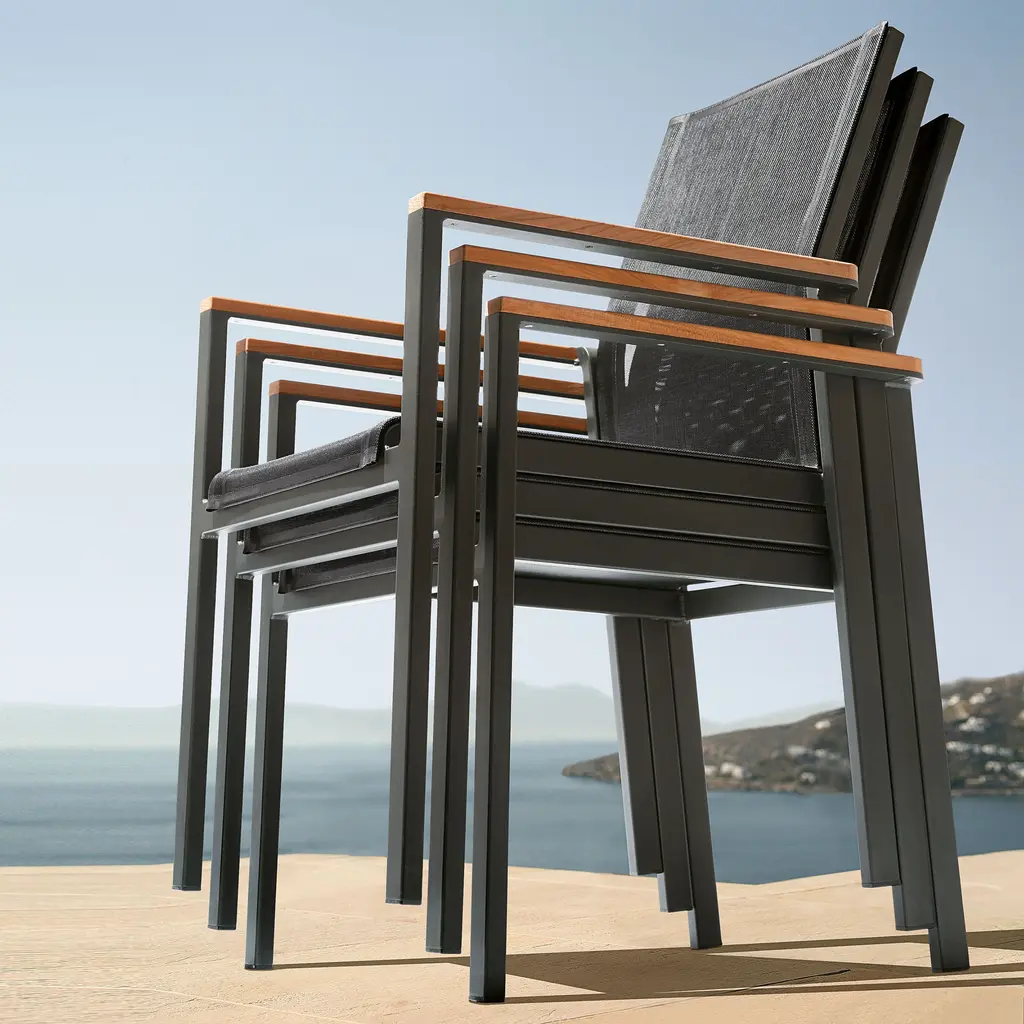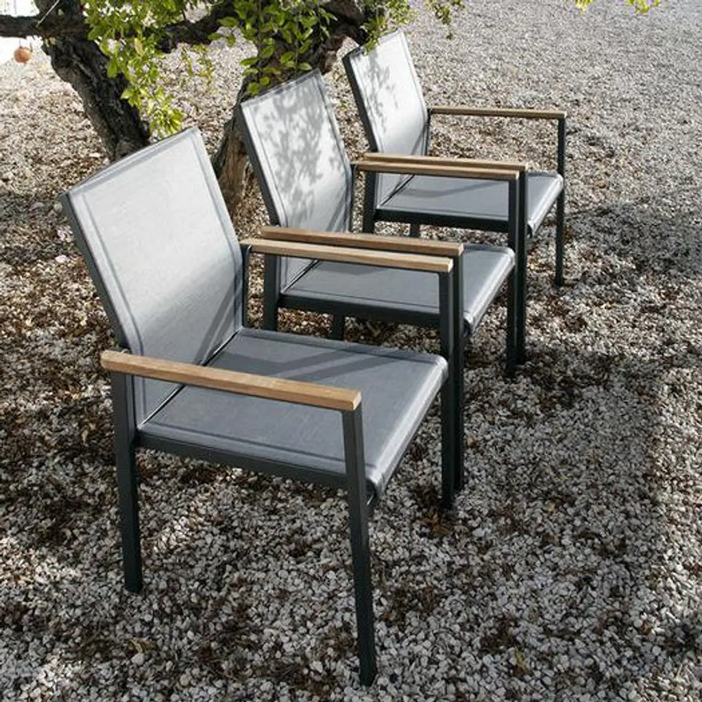 A classically designed dining armchair for any outdoor entertainment area, the Aura Armchair from Barlow Tyrie brings chic, streamlined style to your well appointed al fresco spaces. Featuring a powder coated aluminum frame with solid teak wood accenting on the arms, the seat and back are crafted from Textilene for breathability and comfort. Perfect paired with a metal or solid wood table, this armchair effortlessly blends with a variety of outdoor design schemes. Easy to store, this armchair design can be stacked up to four high to keep things organized when not in use. Highlights