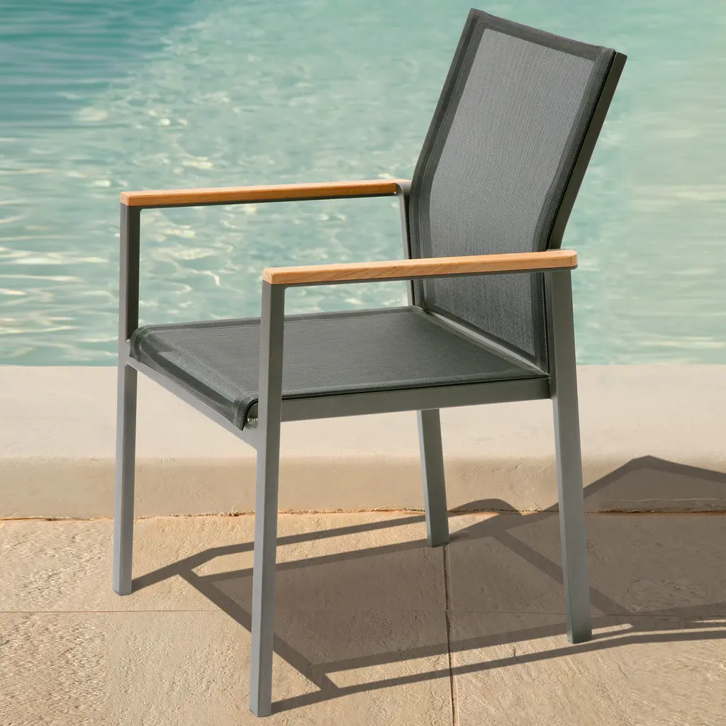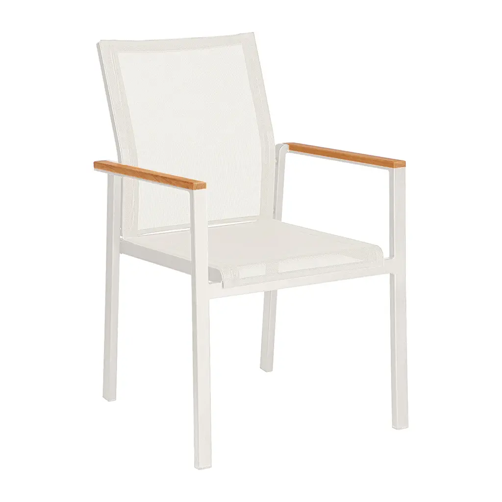 A classically designed dining armchair for any outdoor entertainment area, the Aura Armchair from Barlow Tyrie brings chic, streamlined style to your well appointed al fresco spaces. Featuring a powder coated aluminum frame with solid teak wood accenting on the arms, the seat and back are crafted from Textilene for breathability and comfort. Perfect paired with a metal or solid wood table, this armchair effortlessly blends with a variety of outdoor design schemes. Easy to store, this armchair design can be stacked up to four high to keep things organized when not in use. Highlights