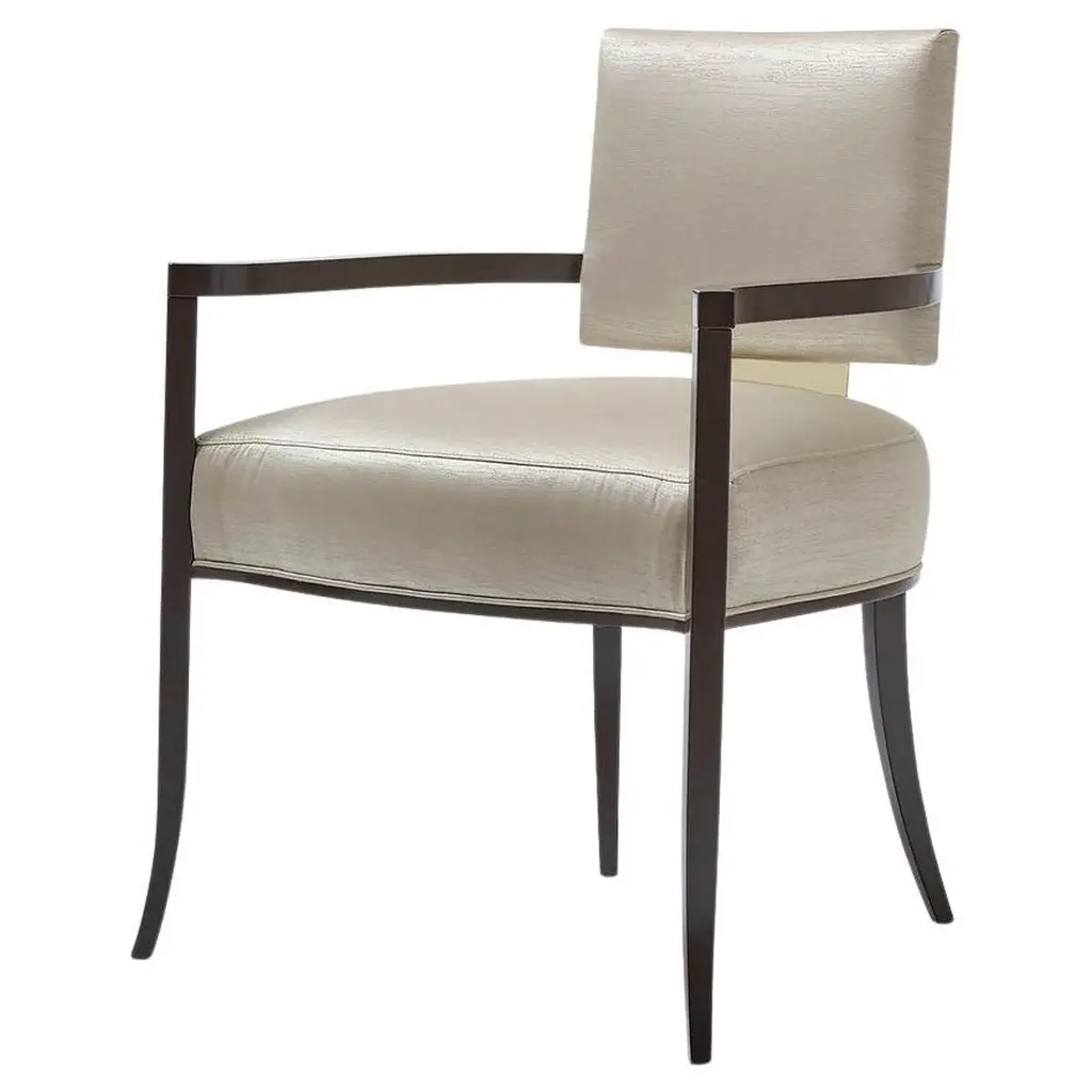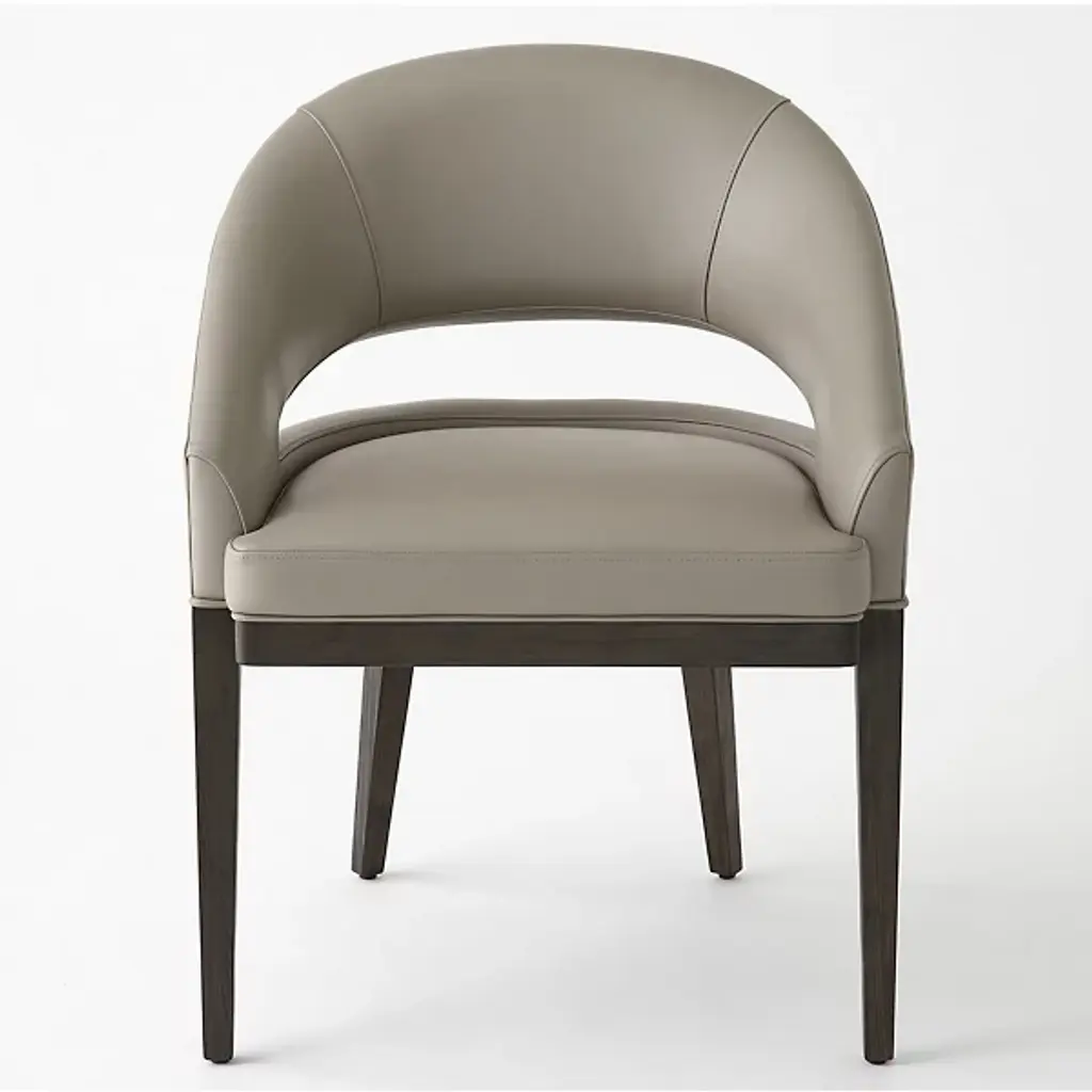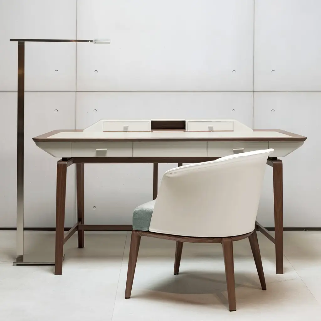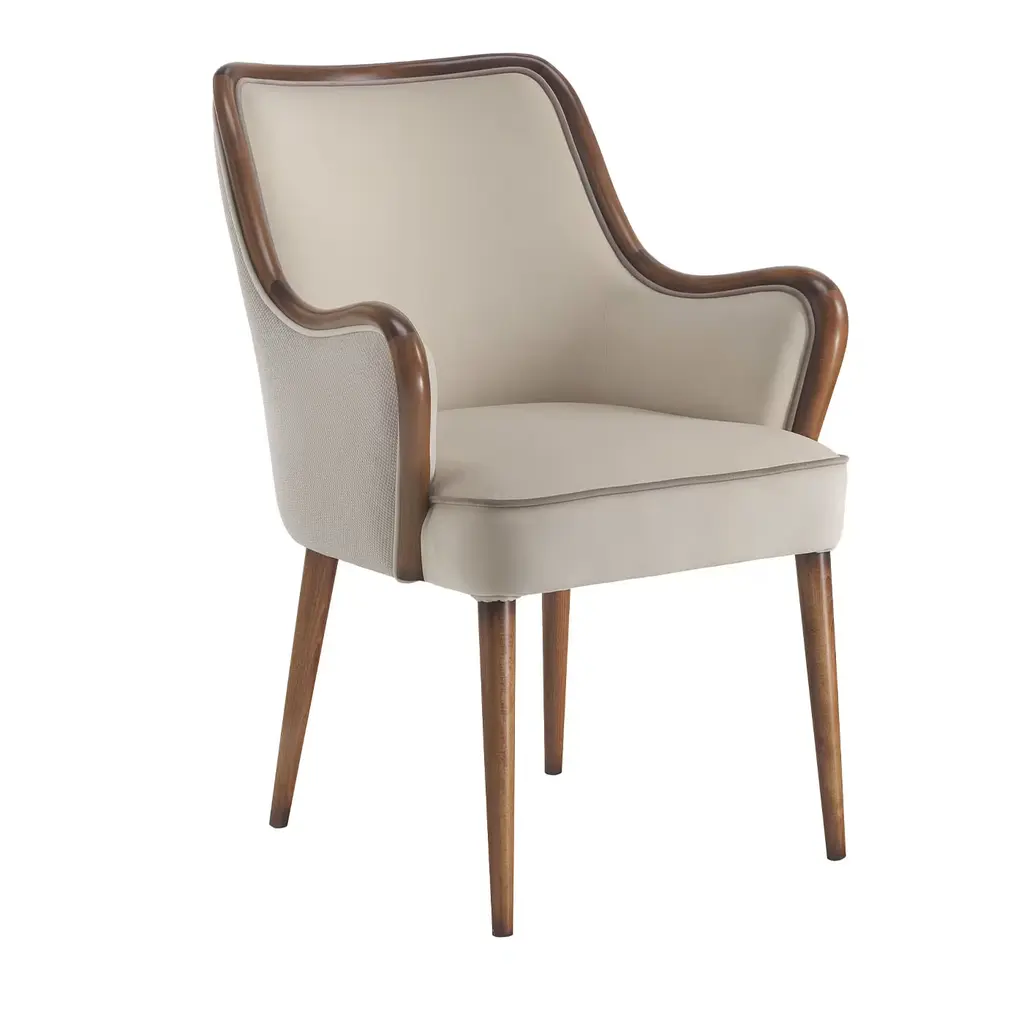 An elegant design distinguished by versatile and timeless lines, this chair will effortlessly complement both living and dining areas. Handmade of solid Canaletto walnut completed with a curved birch plywood backrest of exceptional comfort, it is padded with flexible and multi-density polyurethane foam, covered with fiber. The backrest is upholstered with leather, while the seat is in fabric, or leather upon choice, please contact the Concierge. All covers are removable.
