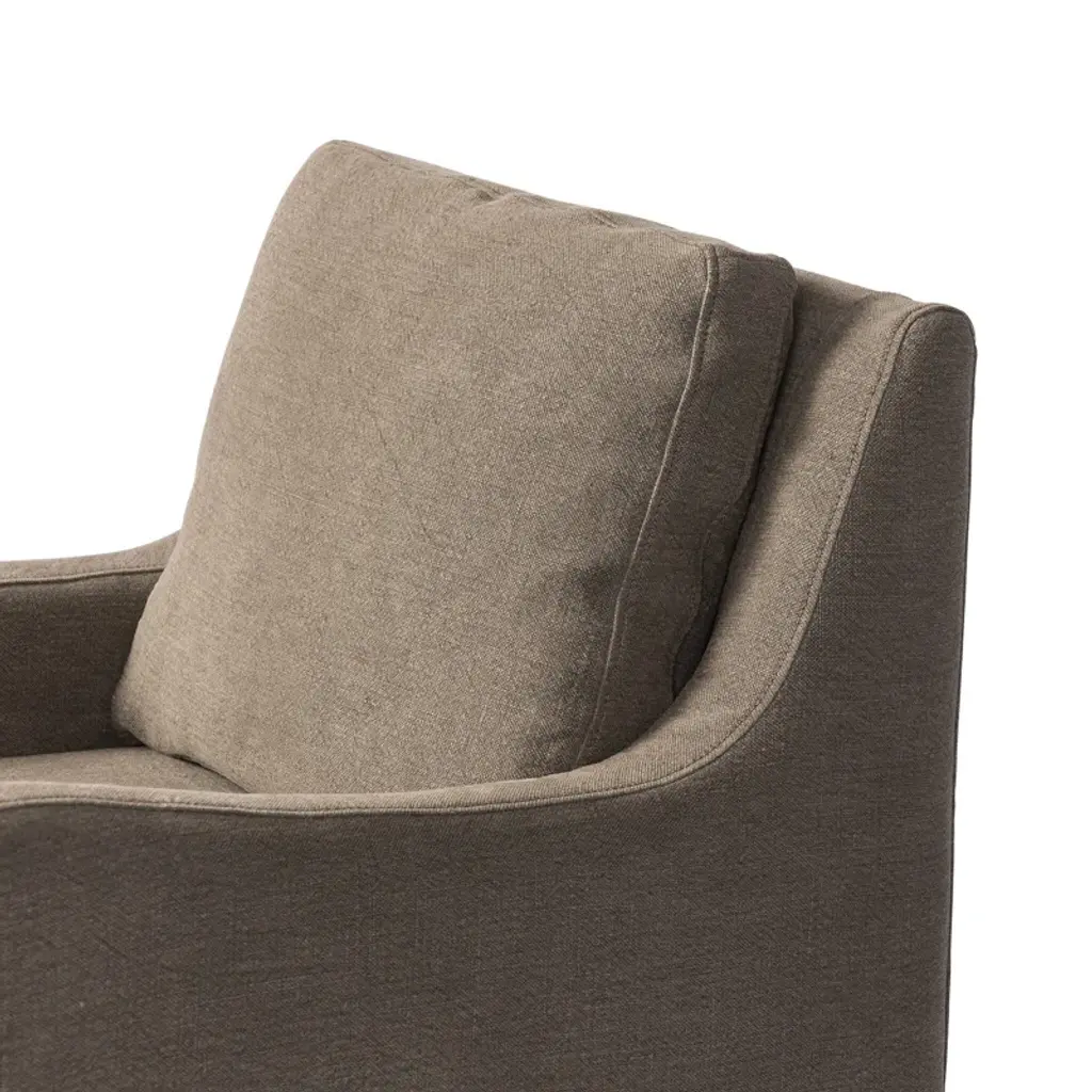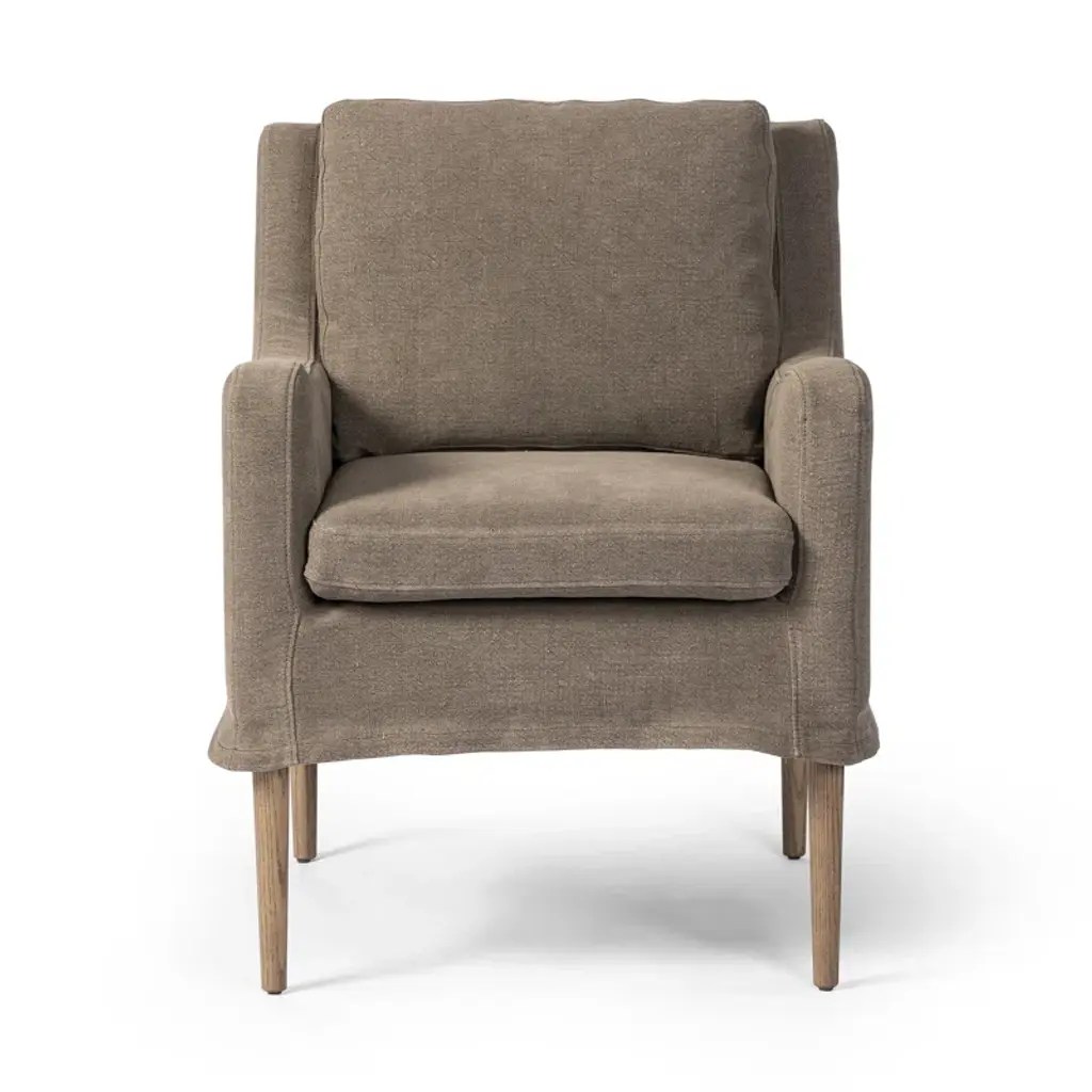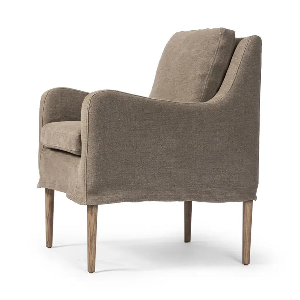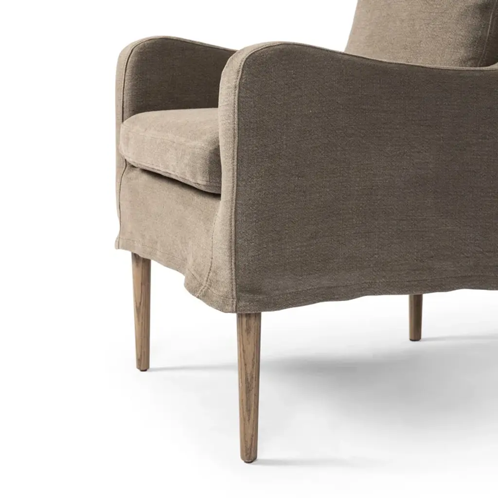 Heritage-inspired comfort. Sloping track arms are a study in playful forms, while the frame's fluid shape creates a simple, polished look. Tapered legs extend beyond a short skirt for a more relaxed style. Covered in 100% linen.