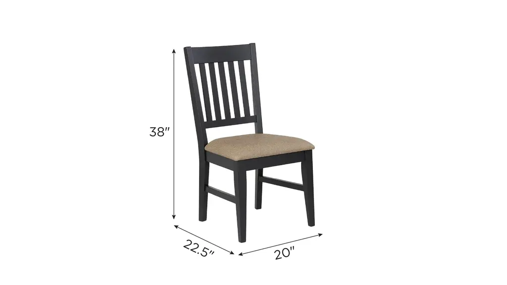 Autumn Winds Dining Chair- Set of 2 is slat back and tapered legs are a sturdy frame. Black finish is beautifully textured. Heavily woven fabric on the boxed cushion seat has a quality feel-good touch. This is trend-right urban farmhouse style.