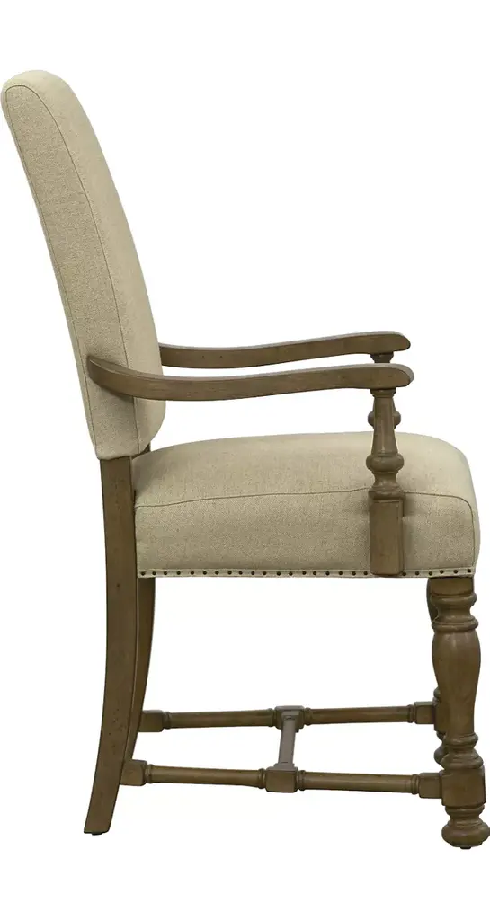Our Avondale armchair shows off understated sophistication. This graceful chair is upholstered in a natural linen fabric and is embellished with nailhead trim. A hand-applied vintage oak distressed finish creates rustic elegance.