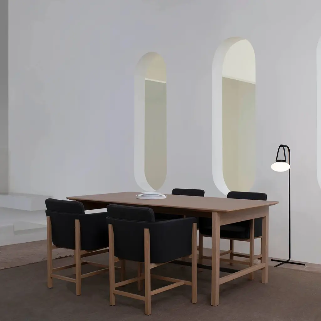 A fully upholstered dining chair with arms showcases Aya collection’s minimalist but luxurious design codes. Stellar Works and OEO Studio’s first collaboration hews to a shared aesthetic, from the small wooden joints and angles used to the stitching on the signature seating. Melding Japanese culture and Scandinavian aesthetics, the geometric frame is fashioned in solid oak or walnut to complement custom upholstery in a fine textile or rich leather.