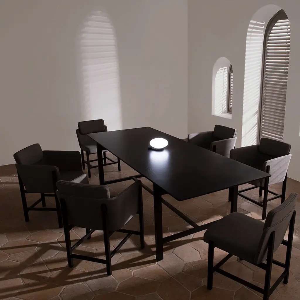 Aya is an onomatopoeia – a word that mimics a phonetical sound. A poetic name as soft and sophisticated as the design itself. The collection design language is an elaboration of the encounter between Asian and Scandinavian design. Aya is minimal yet highly complex and every detail has been careful orchestrated, from the small wooden joints and angles to the stitching and seating comfort. The elegant light wooden frame is deeply inspired by Asian culture and design, and effortlessly carries the soft and embracing shell and seat. The result is a full range of Aya furniture for the perfect dining and socializing setting. Comfort and sturdy durability lie at its core, which is complimented by the elegant appearance. The first Aya collection drop comprises a fully upholstered dining chair with armrest, a dining chair without armrests, and two dimensions of dining tables: 1,800 cm and 2,400 cm in length. The design of the tables mirrors the structure and details of the chair frame.