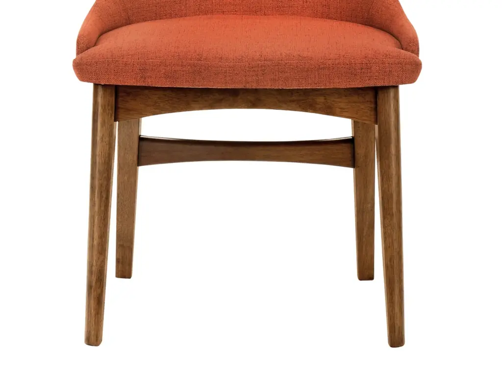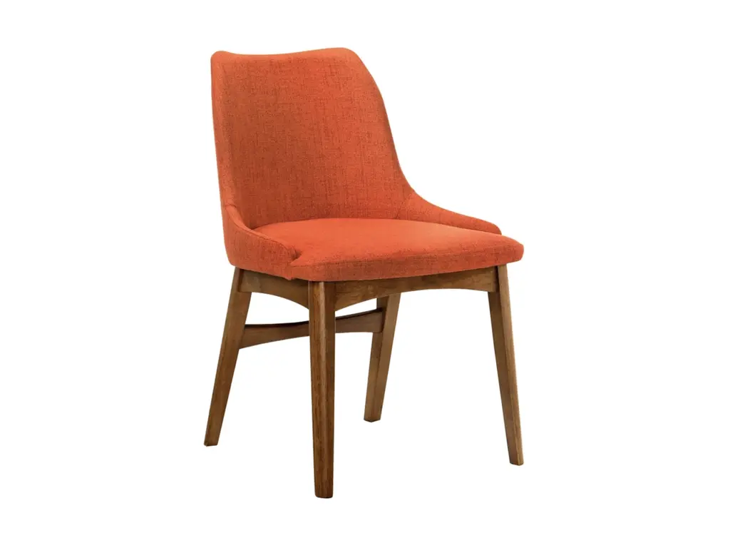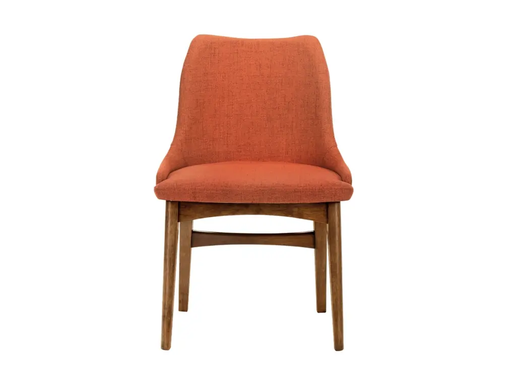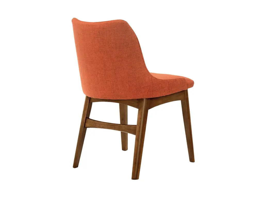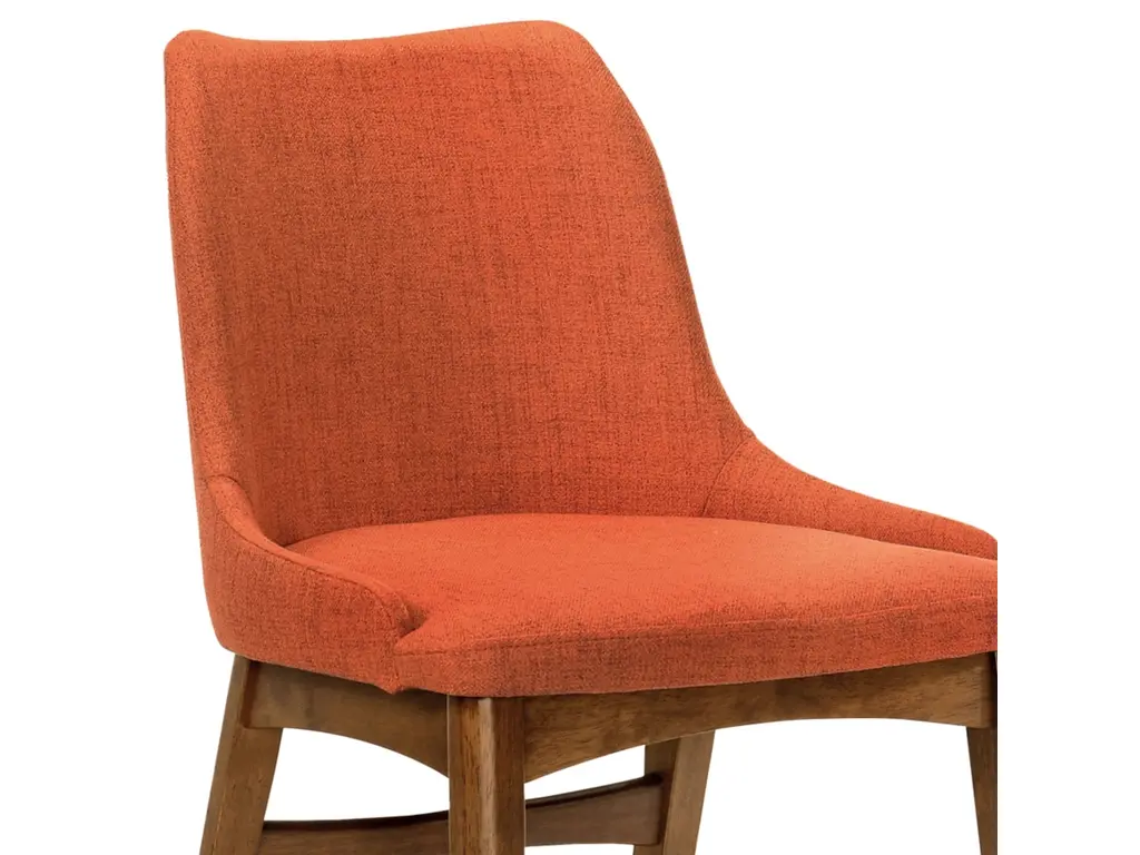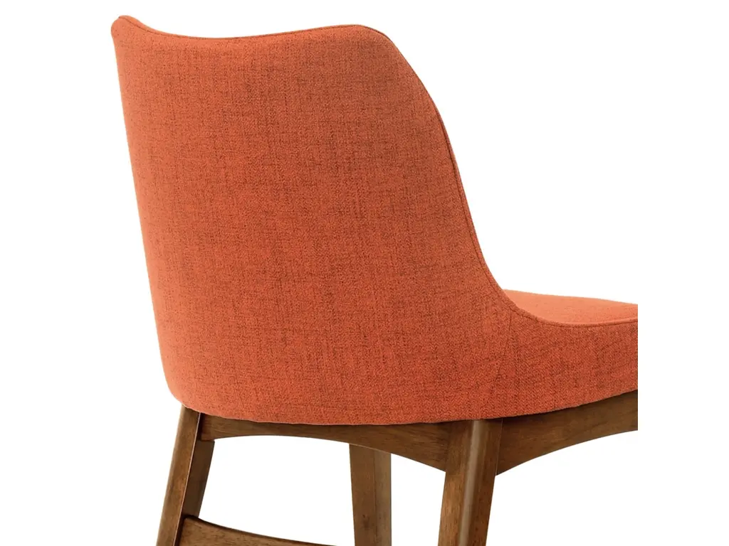 The Azalea Orange Fabric and Walnut Wood Dining Side Chairs from Armen Living are an exceptional choice to bring into the living area of your choice. The soft fabric upholstery is luxuriously wrapped around the entire seat - covering the ultra-comfortable foam padded cushion. Featuring a wide back and spacious seat, you never have to feel confined to a small space. The clean, sleek and geometric wooden legs add a modern style to this chair - also assuring dependability that this chair will last and give you years of enjoyment. The contemporary look of the Azalea will update the decor in any dining room, bar or lounge area.