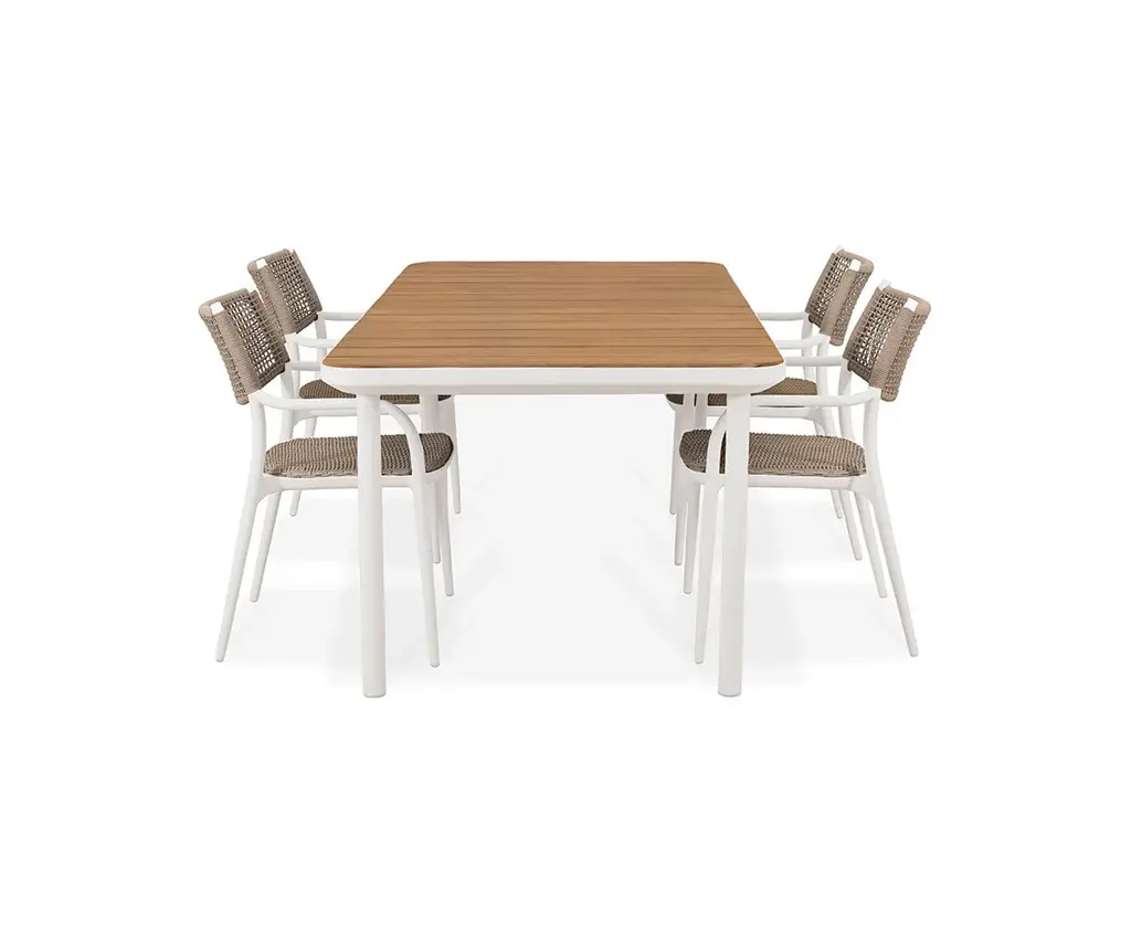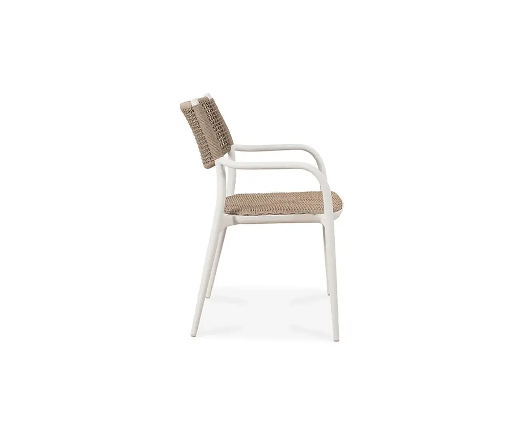 Aluminum frame with a powder-coated white finish Rope-weave back and seat Fully stackable Keep in a fully shaded area